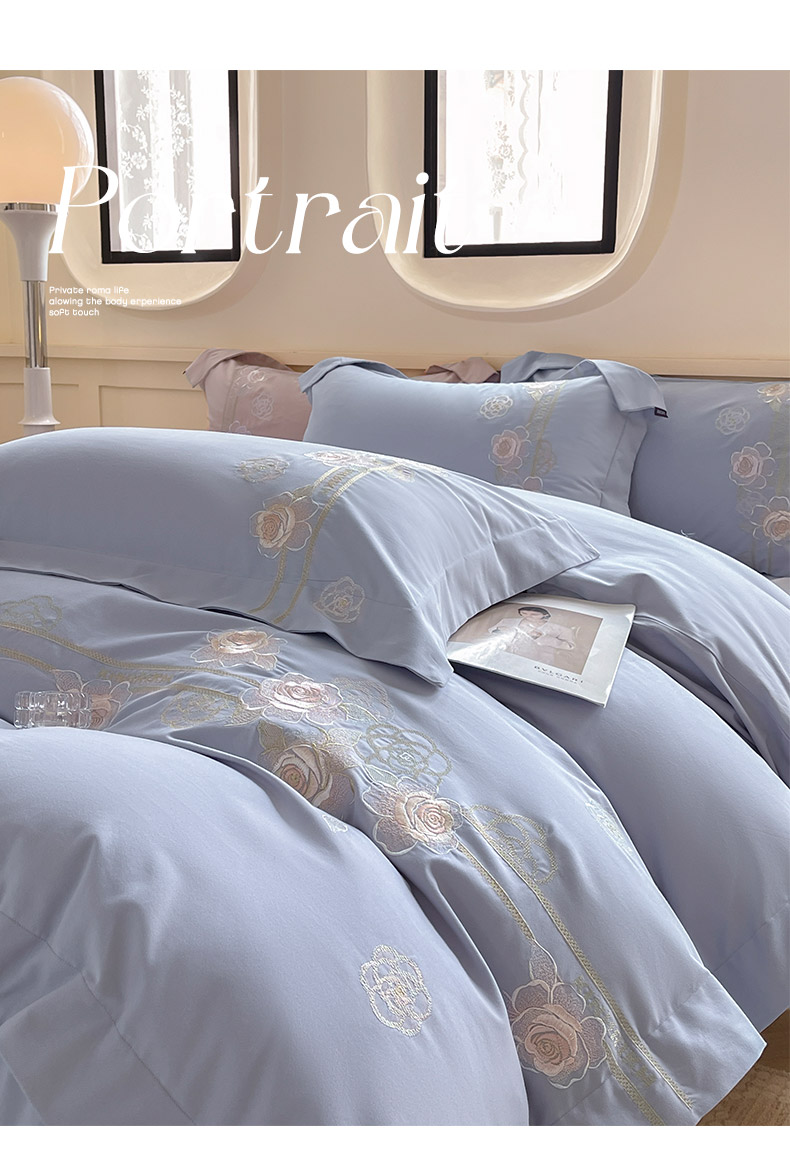 商品名称: 秋冬季爆款A类加厚保暖全棉磨毛四件套纯棉被套重工刺绣床笠款轻奢高端床上用品 温莎-莓蓝