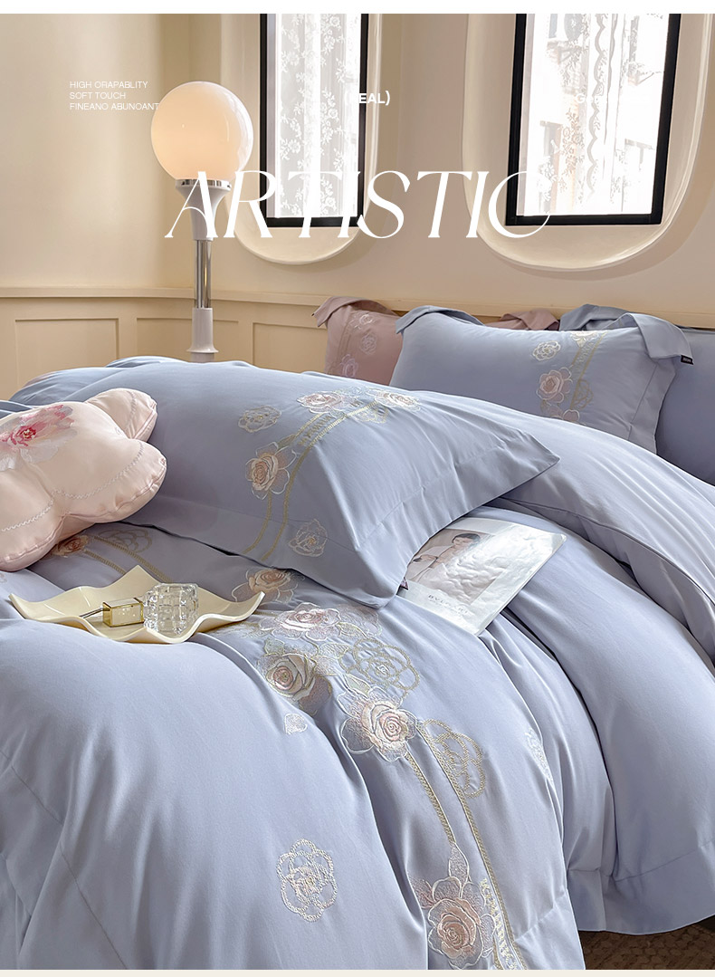 秋冬季爆款A类加厚保暖全棉磨毛四件套纯棉被套重工刺绣床笠款轻奢高端床上用品 温莎-莓蓝