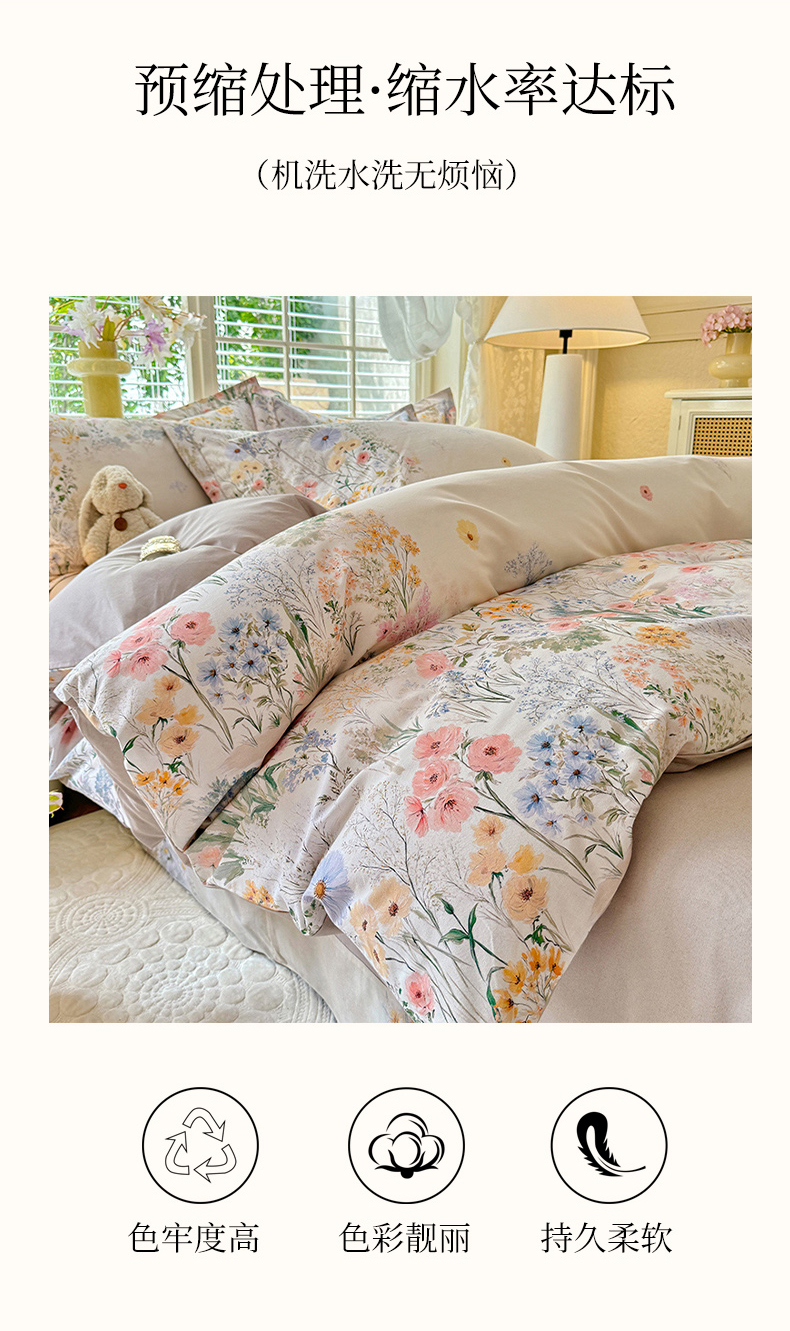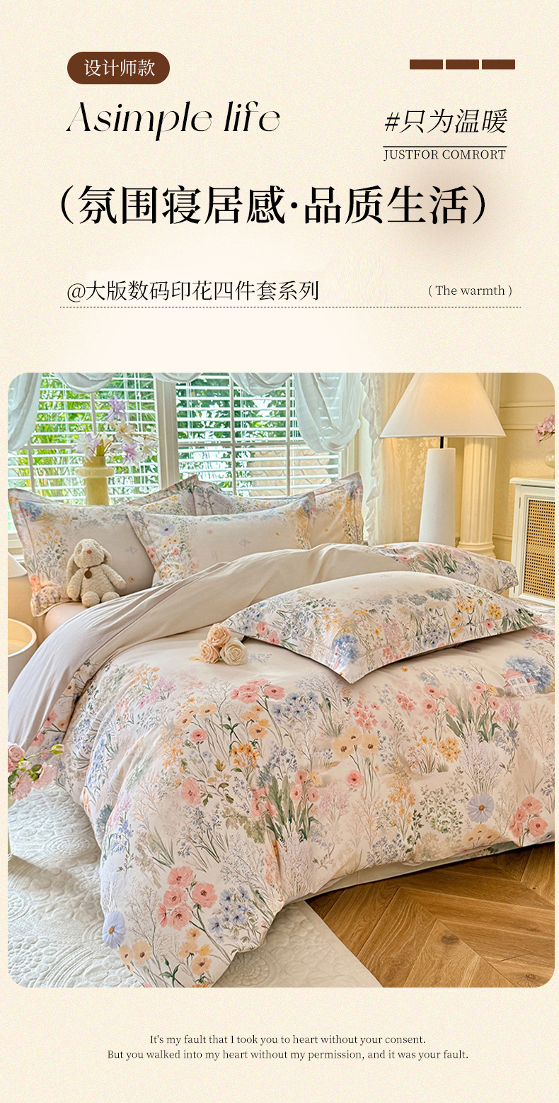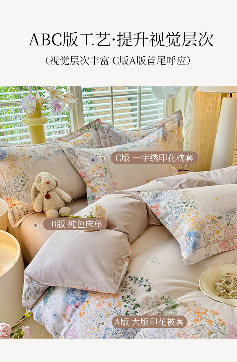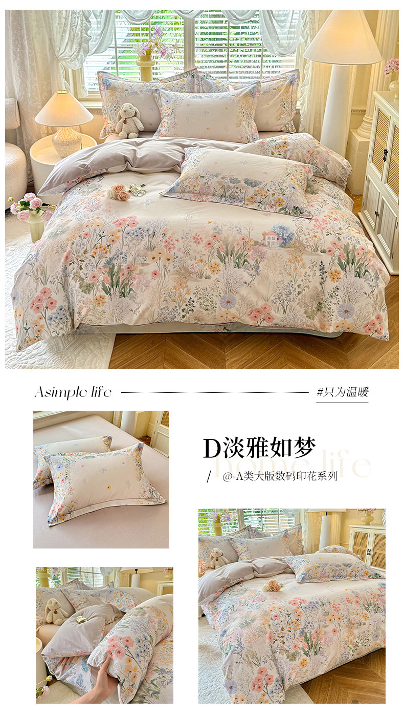 当前位置: 91家纺网 > 商品网购 > 床品套件 > 四件套 > 全棉普通四件套 > 巧玲珑 2025新款100%数码印花生态AB版四件套 D淡雅如梦