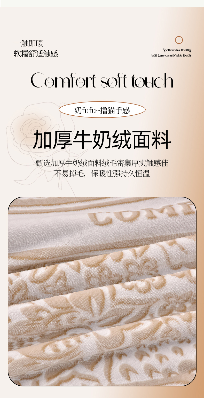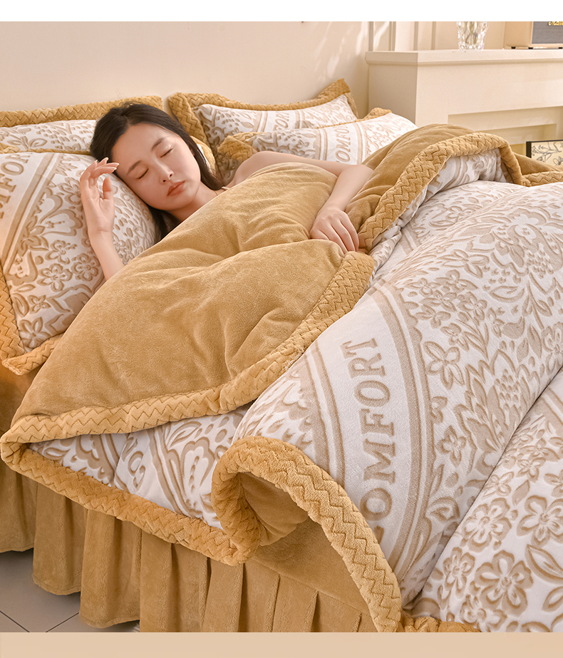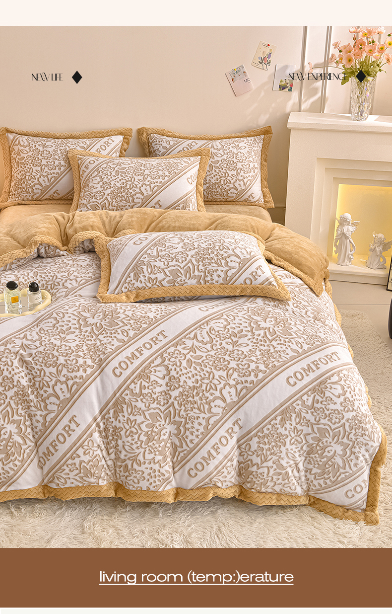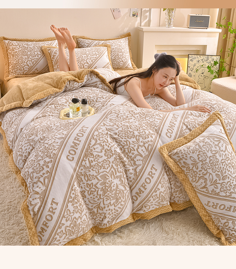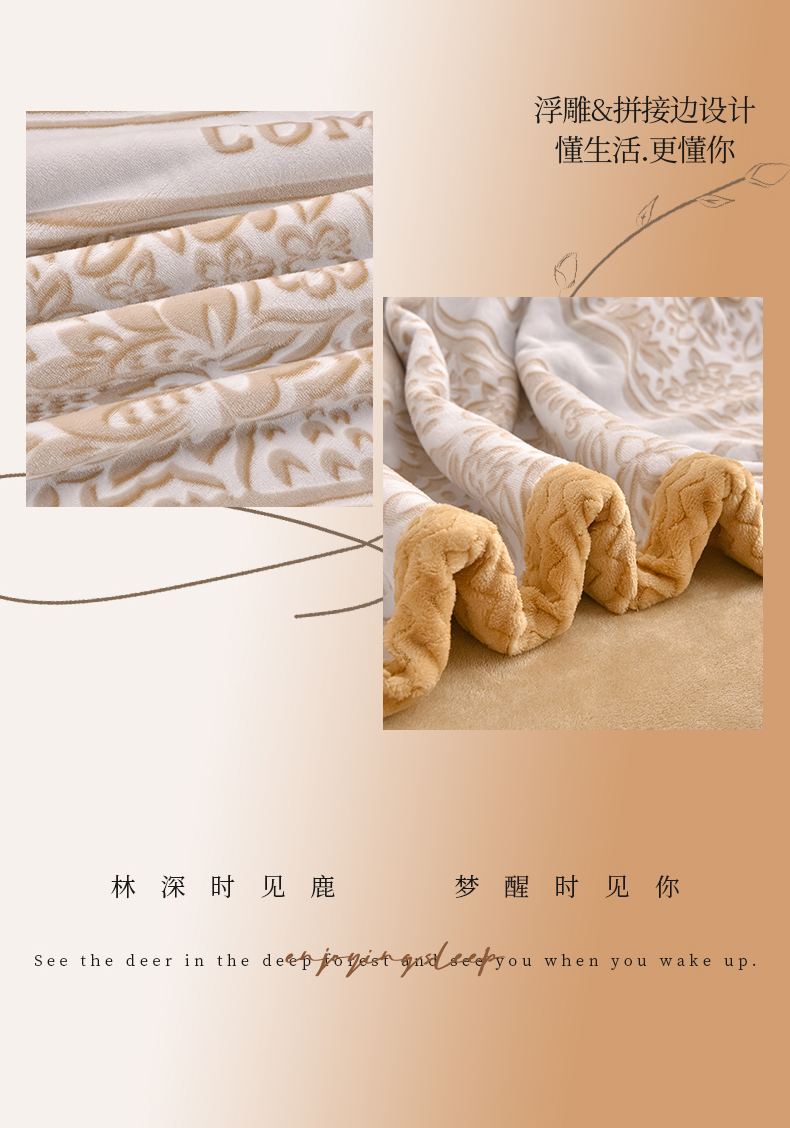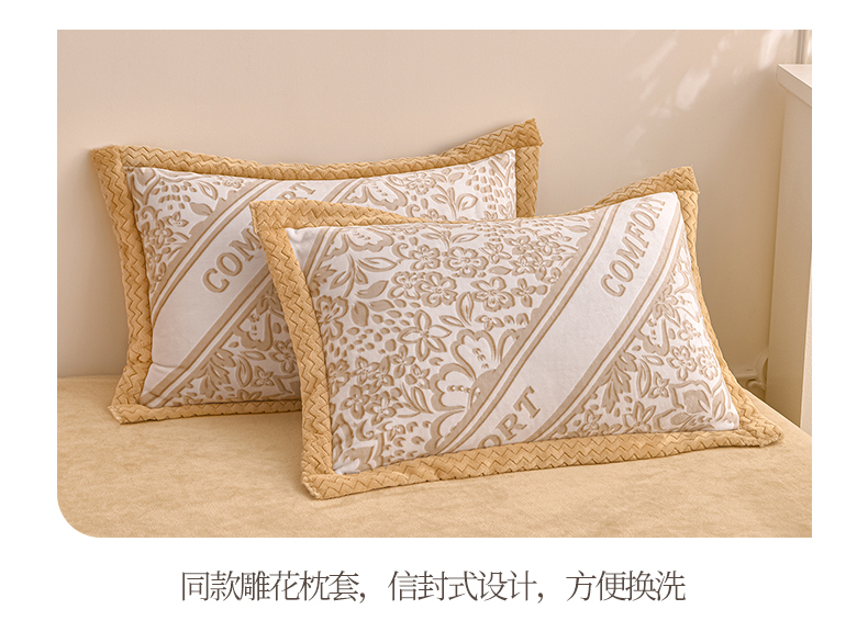 董成龙家纺 2025新款直播爆款牛奶绒四件套雕花压线款法莱绒四件套11 盛世年华-棕咖