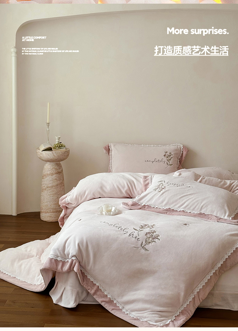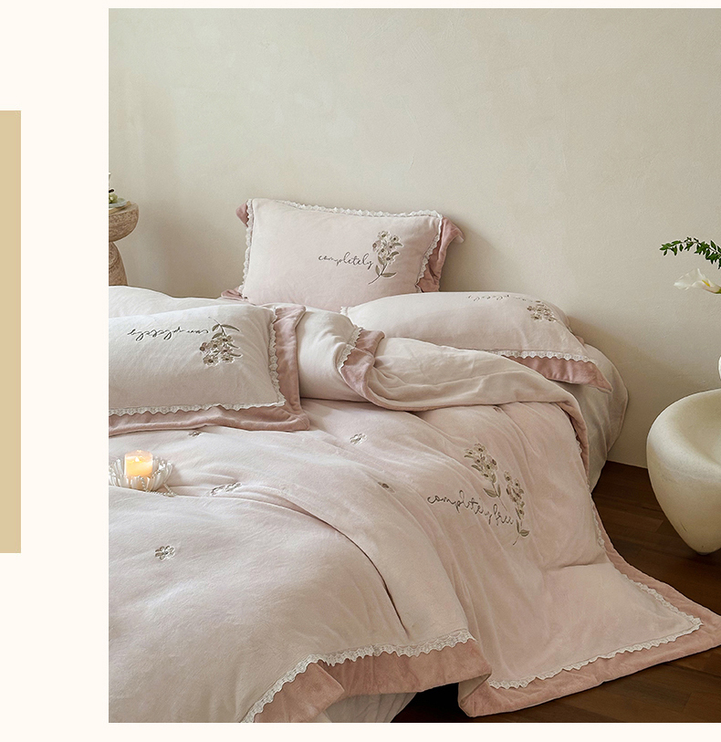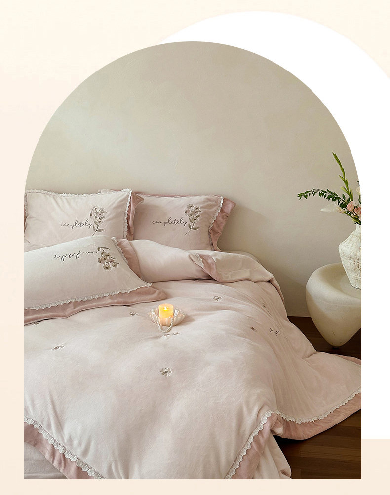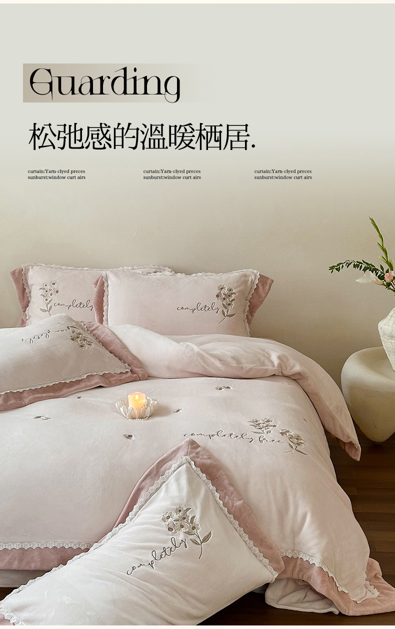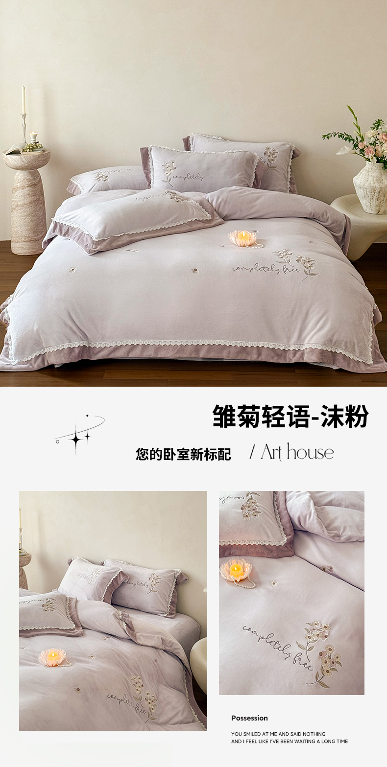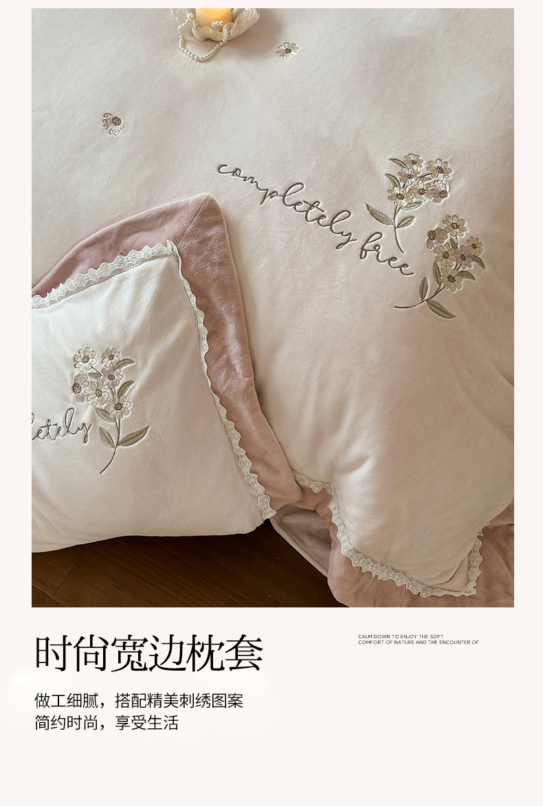 泽西家纺+V17798841158发大图 2025新品秋冬加厚保暖240克奶肤绒小清新花边宽边刺绣牛奶绒四件套-雏菊轻语 雏菊轻语-浅皮粉
