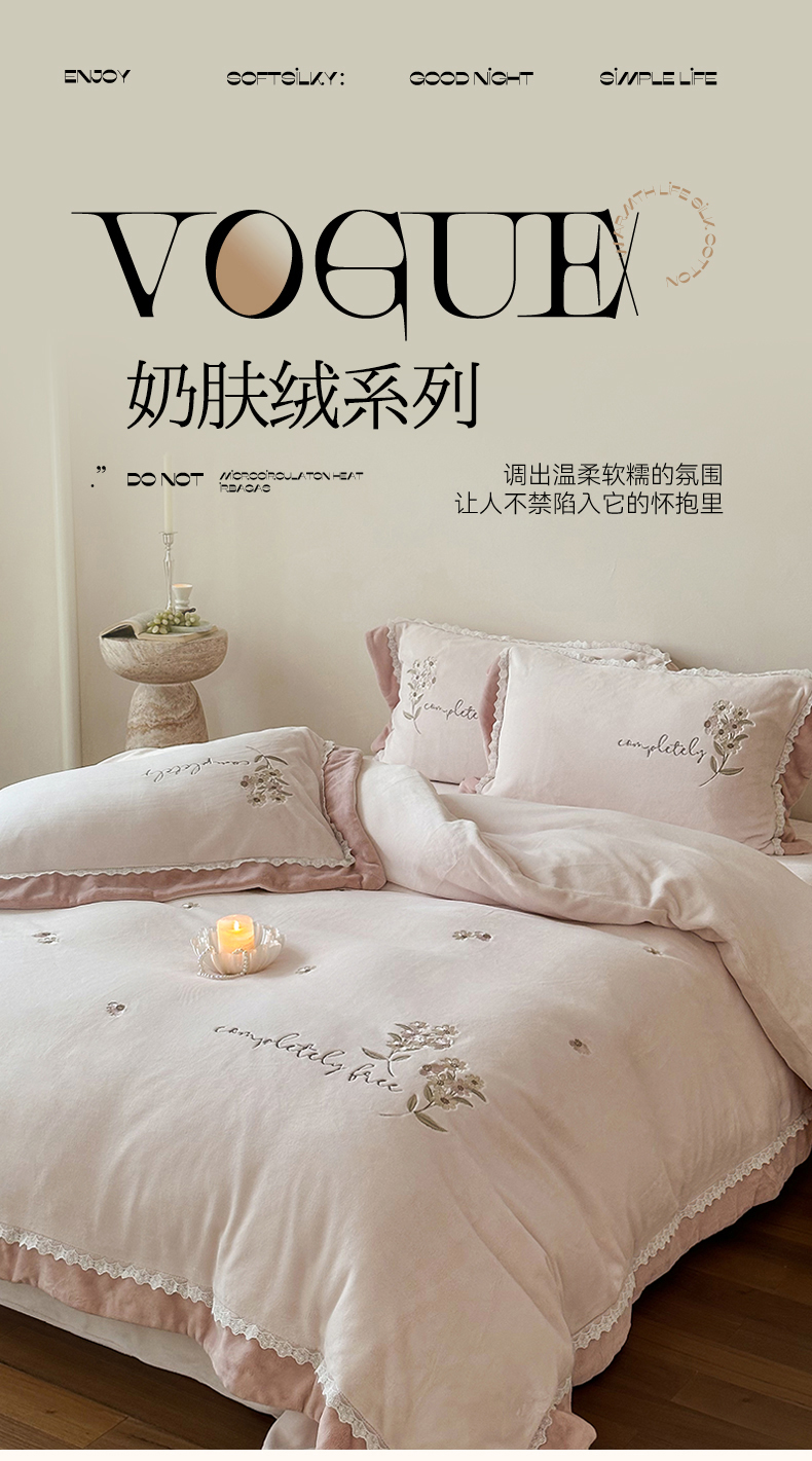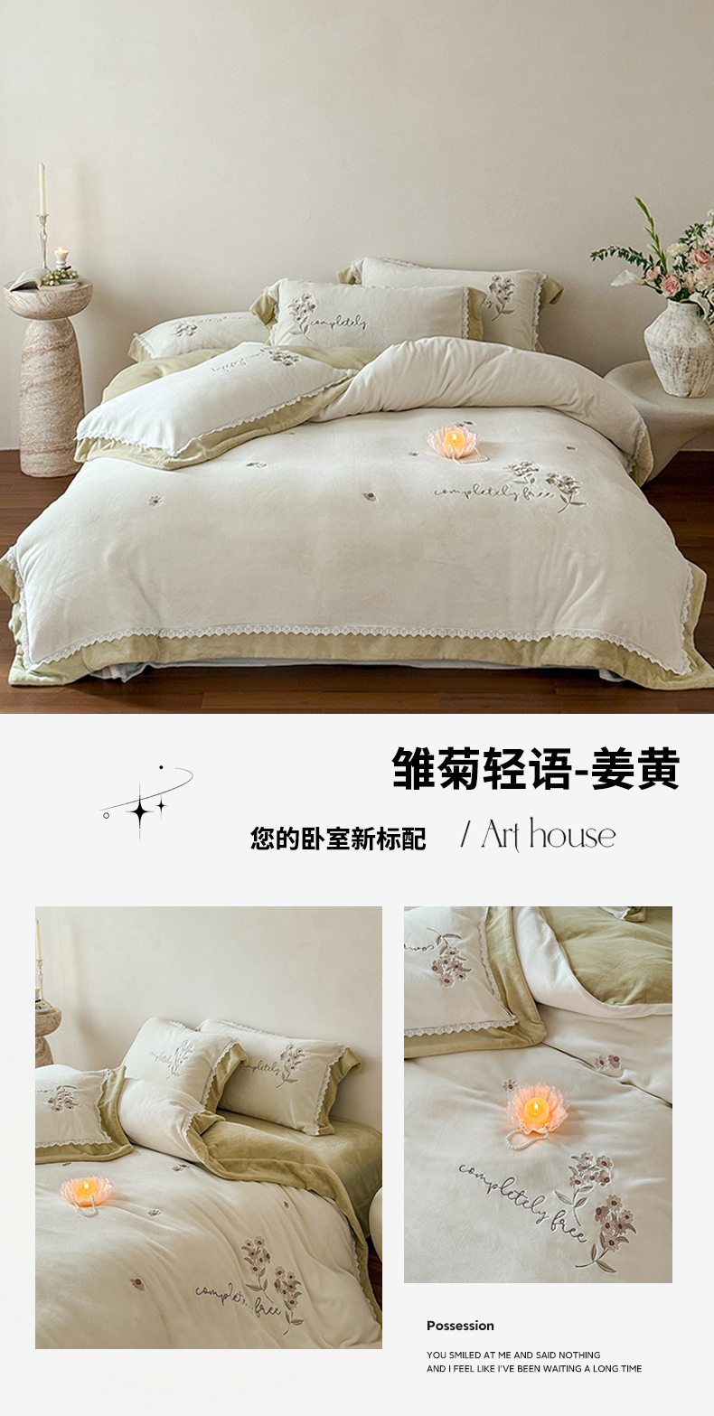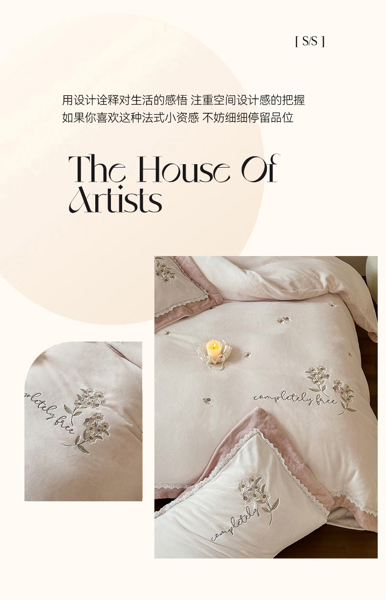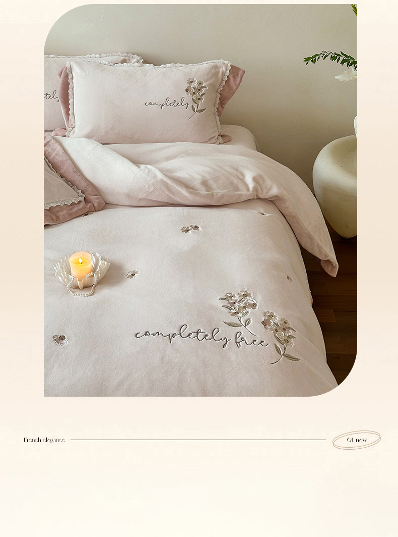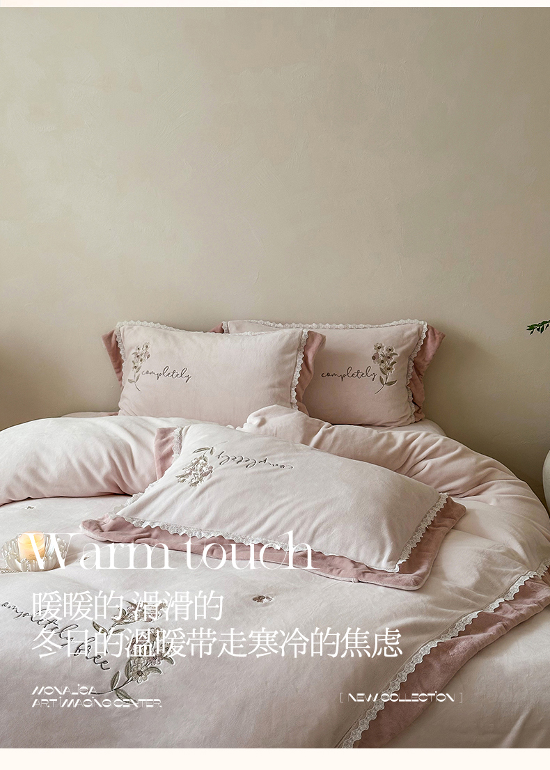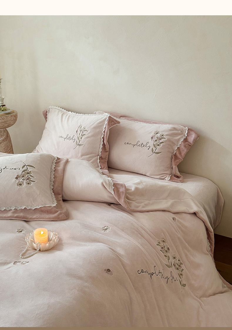 泽西家纺+V17798841158发大图 2025新品秋冬加厚保暖240克奶肤绒小清新花边宽边刺绣牛奶绒四件套-雏菊轻语 雏菊轻语-浅皮粉