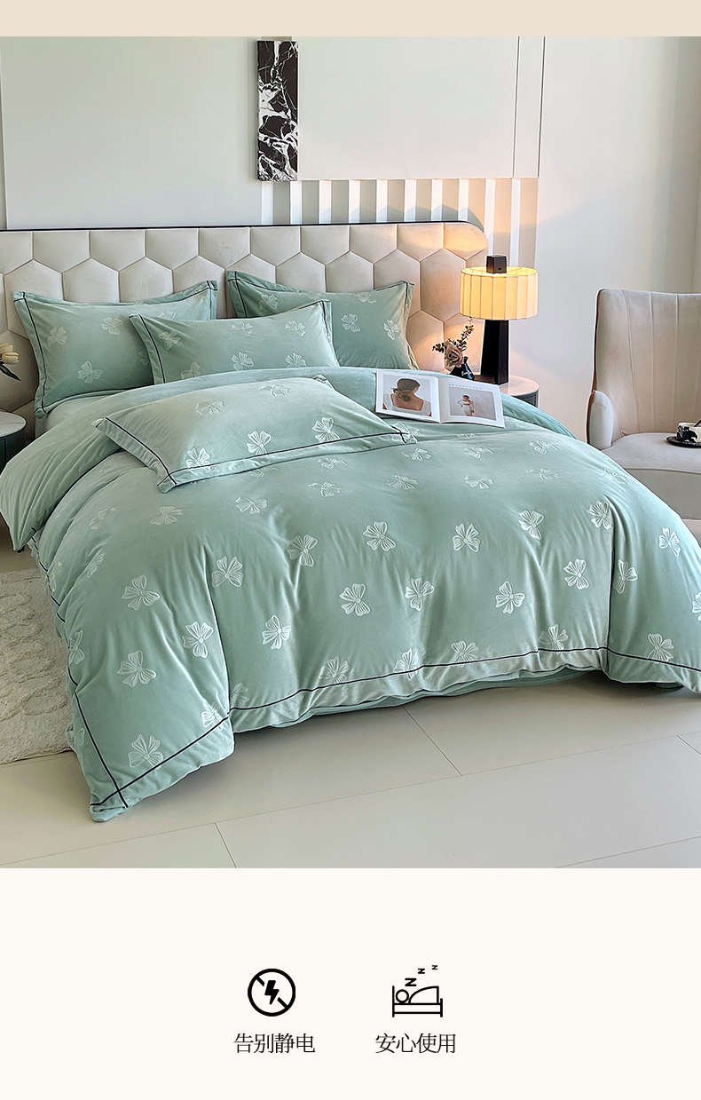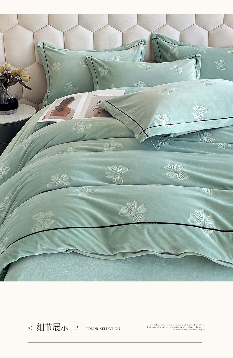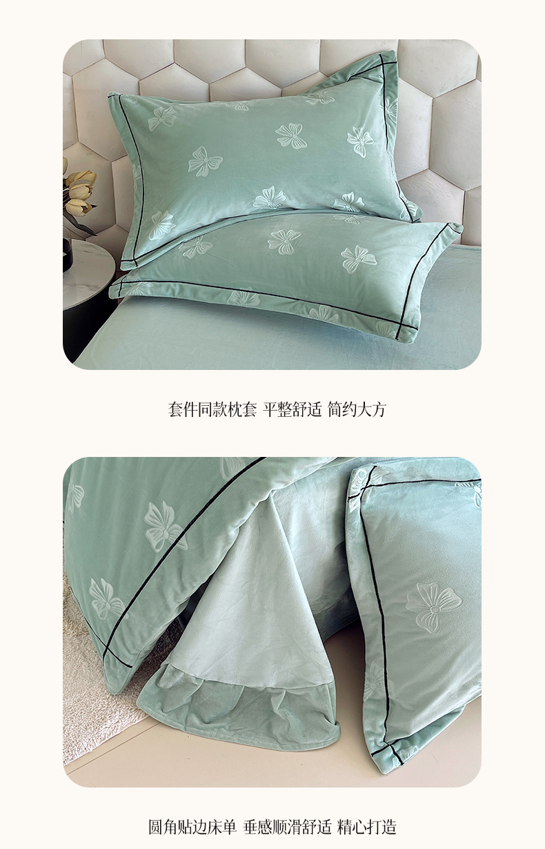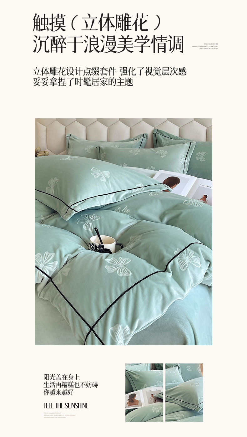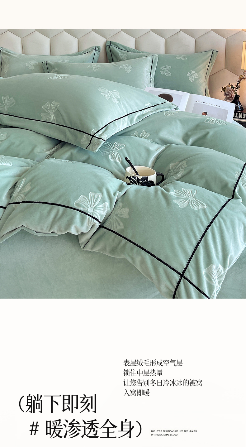 锦彩家居 2025新款高克重牛奶绒婴儿绒雕花四件套-暮光花园 暮光花园-湖水绿