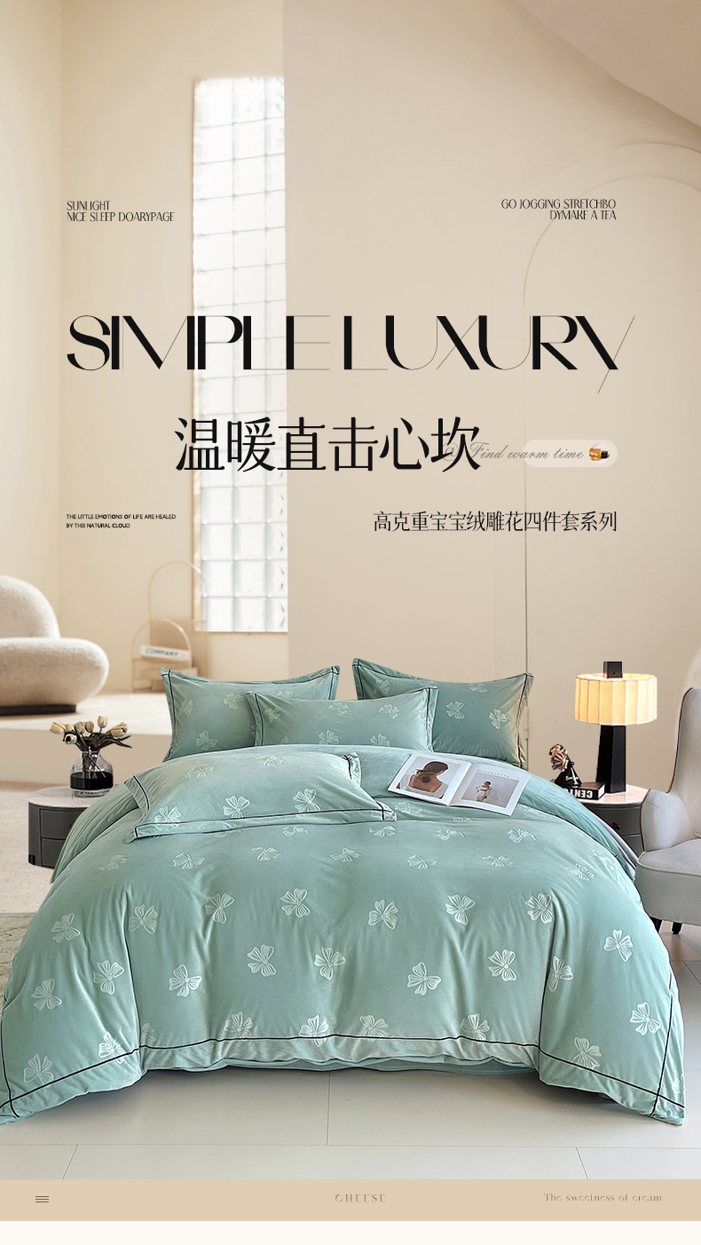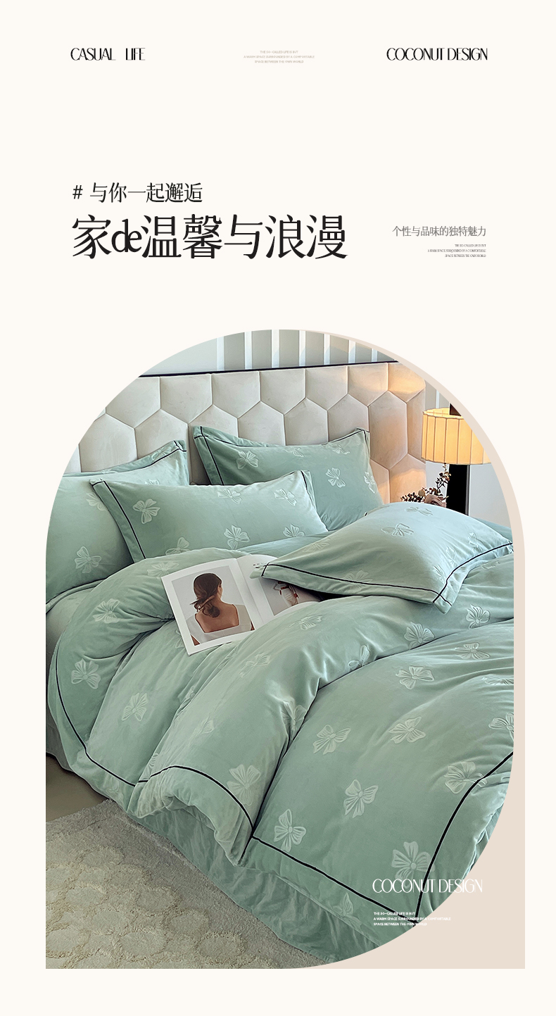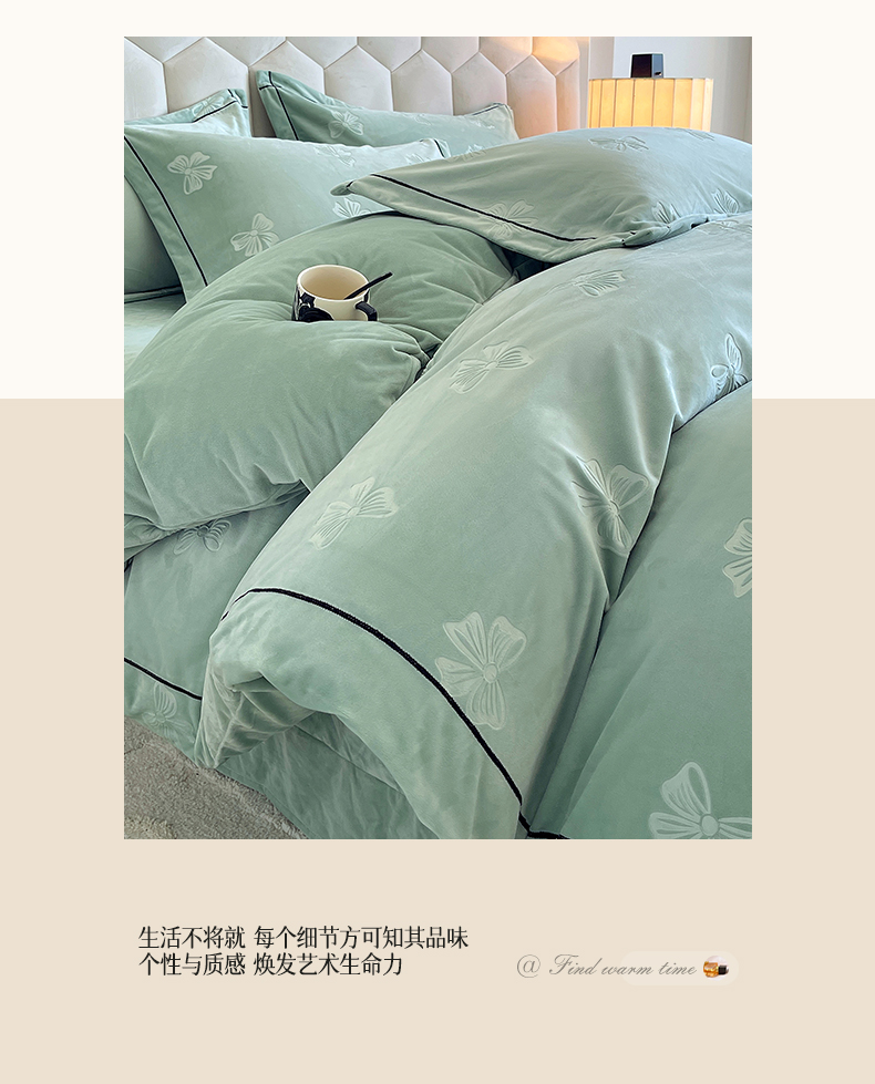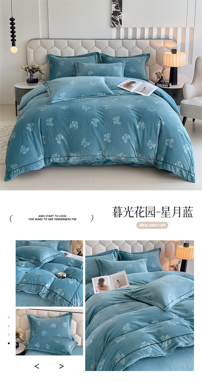 锦彩家居 2025新款高克重牛奶绒婴儿绒雕花四件套-暮光花园 暮光花园-湖水绿
