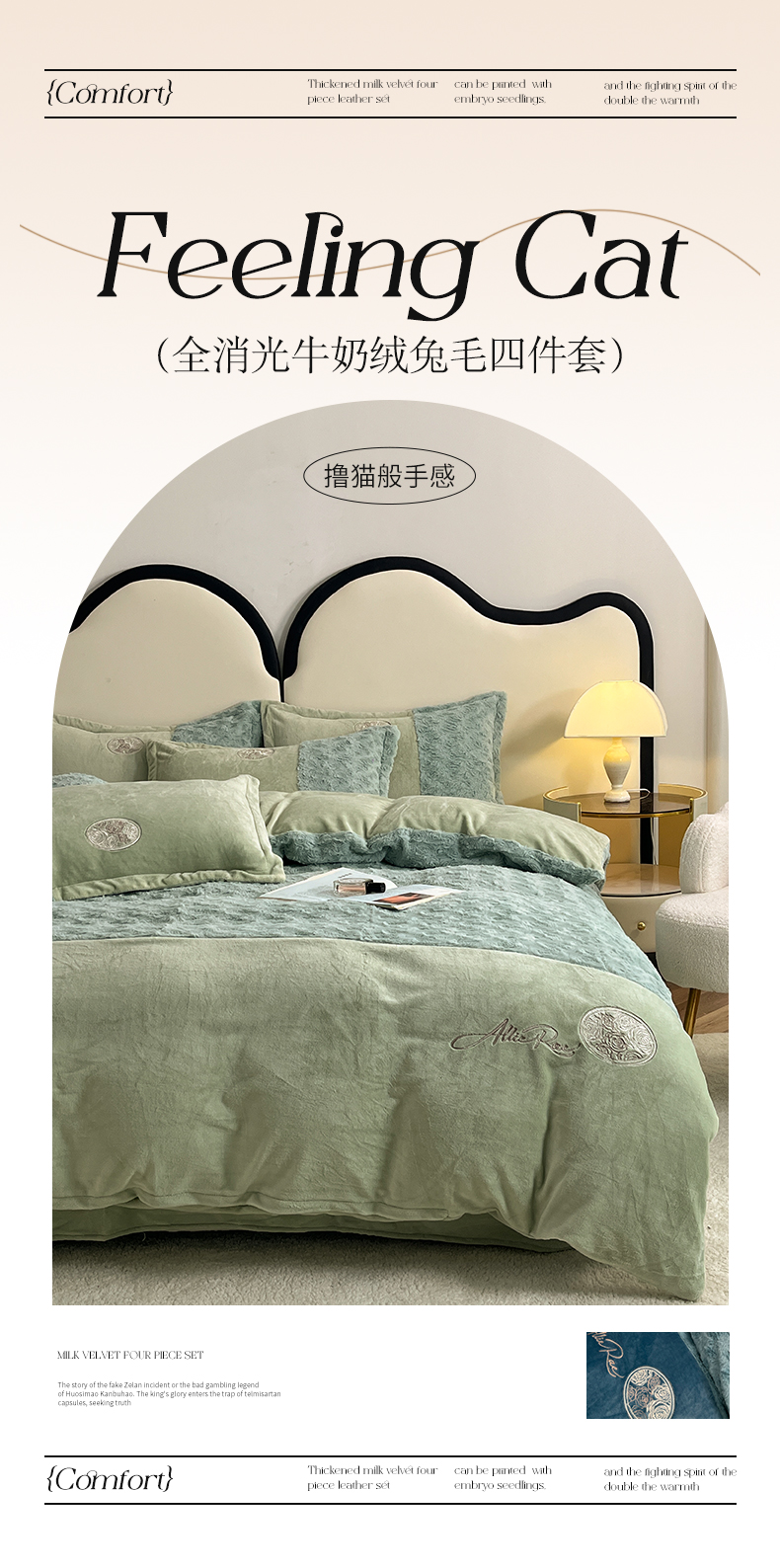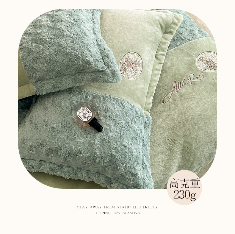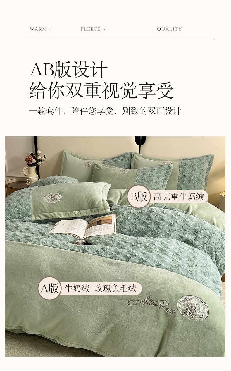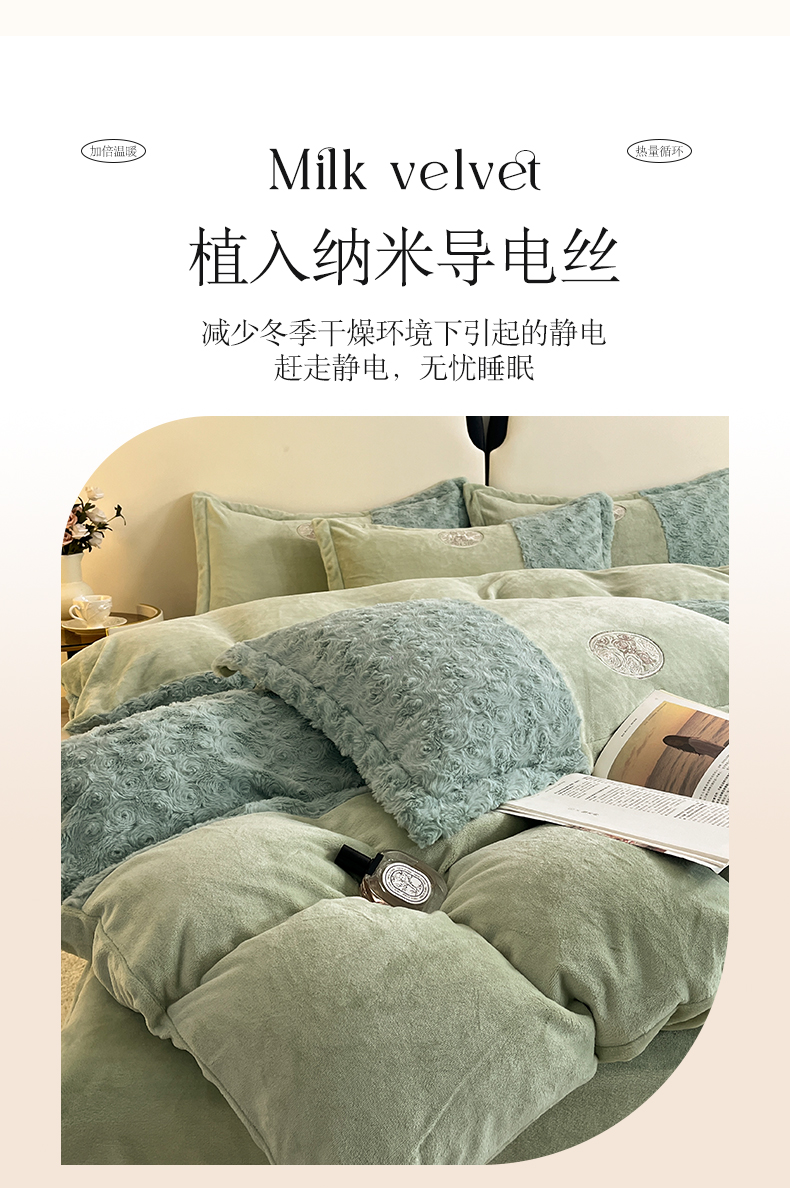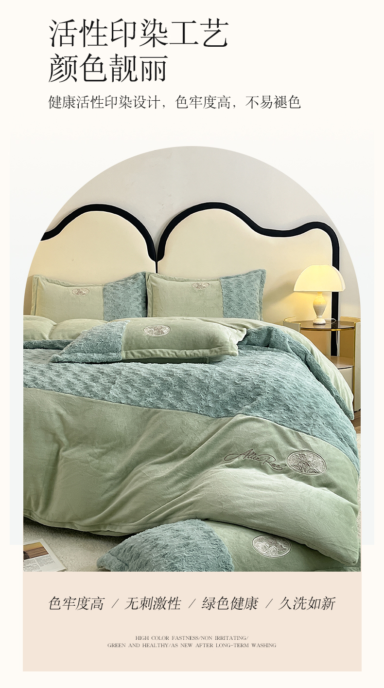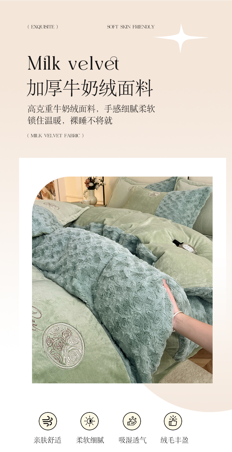 商品名称:梓之赫 2025新款全消光牛奶绒四件套-浪漫玫瑰 浪漫玫瑰-淡绿