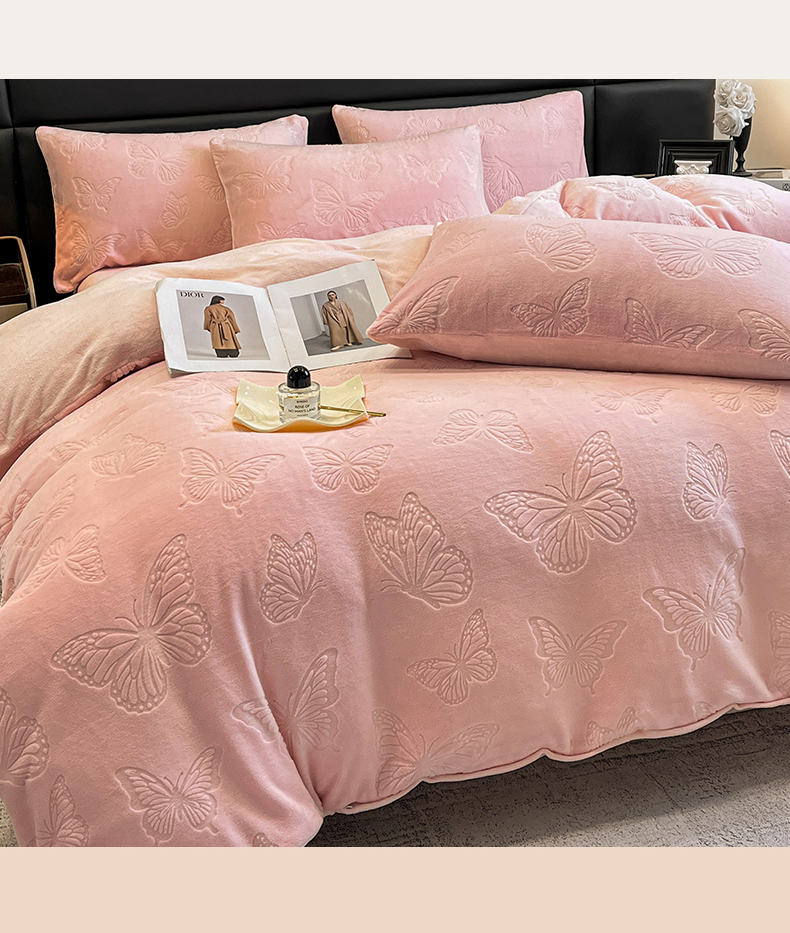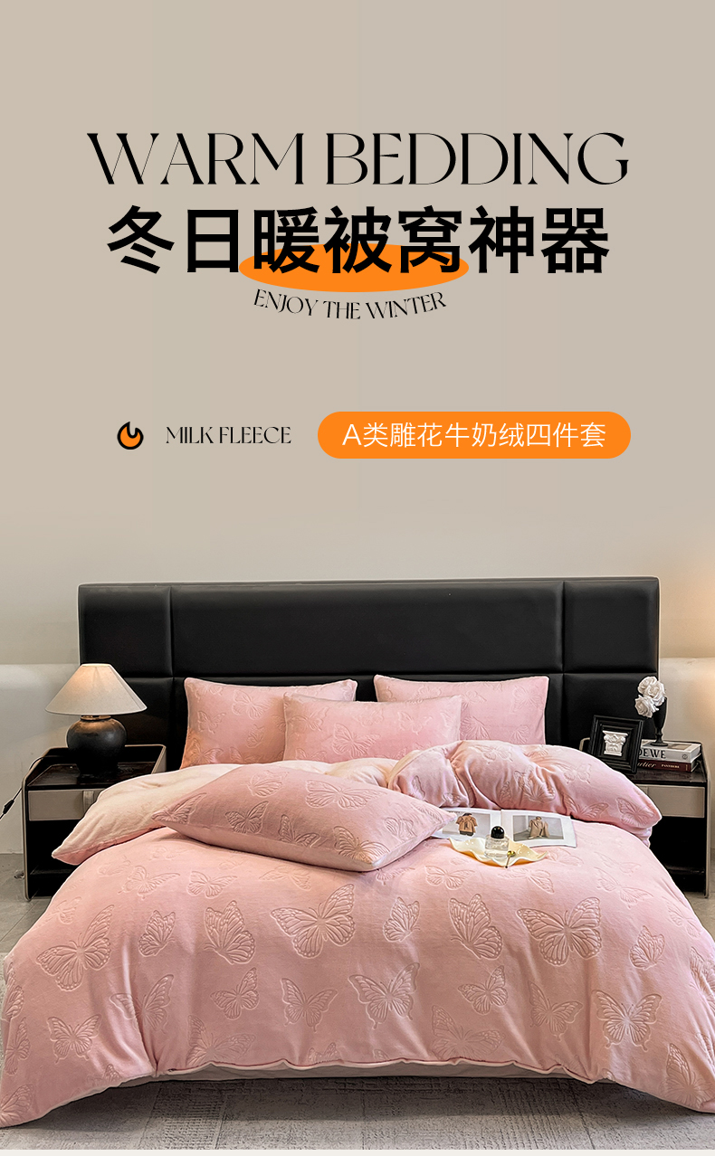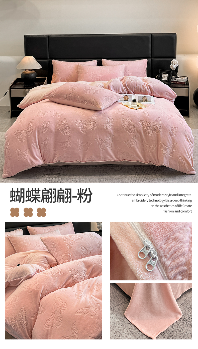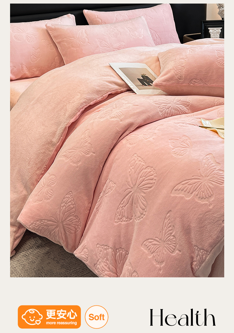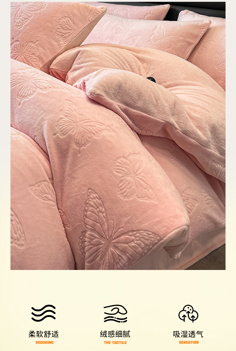 商品名称:星座家纺 2025新款牛奶绒雕花四件套 蝴蝶翩翩-粉