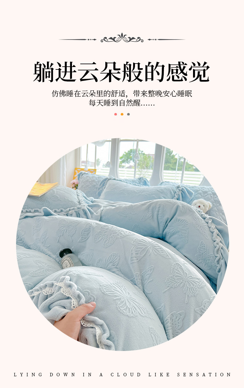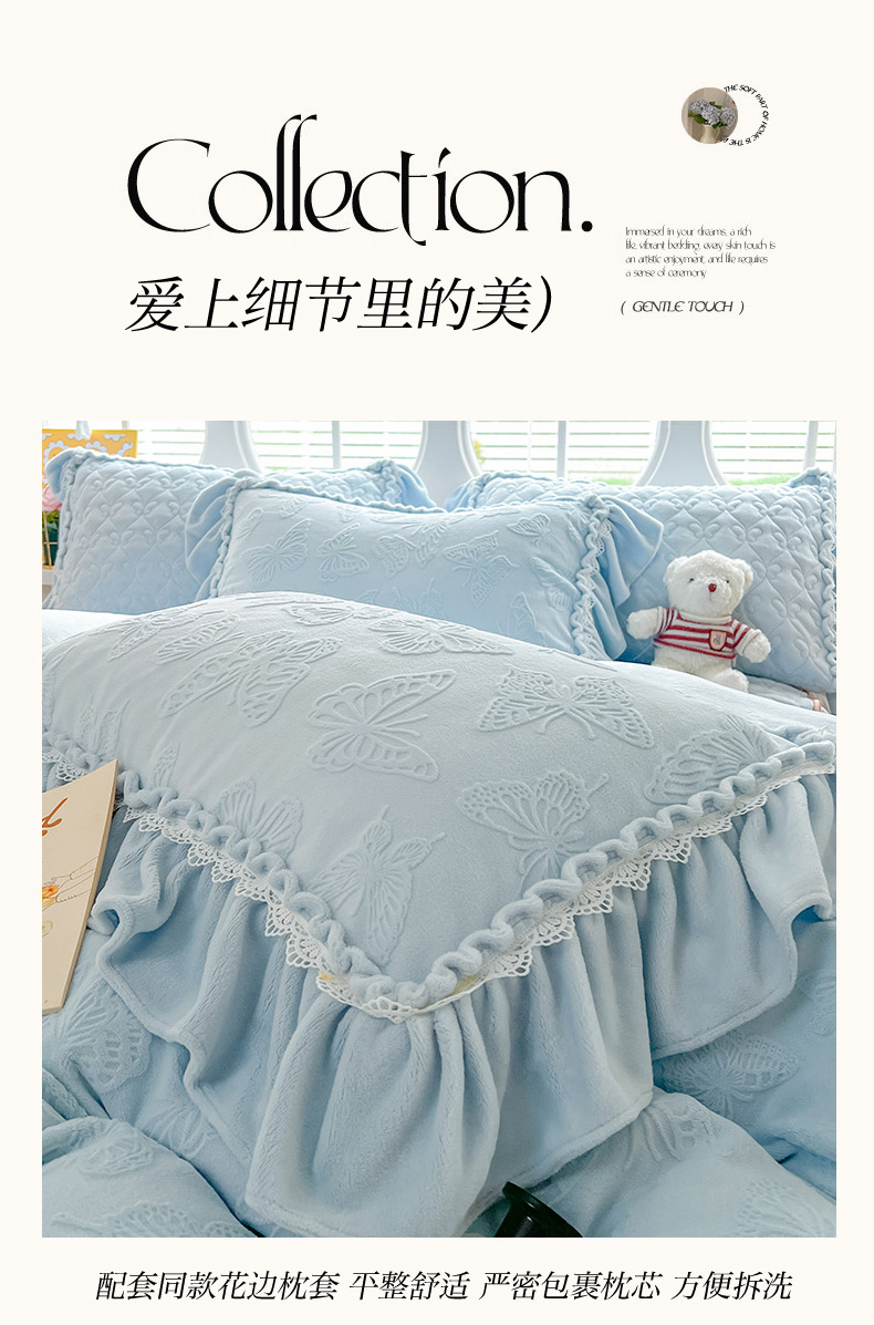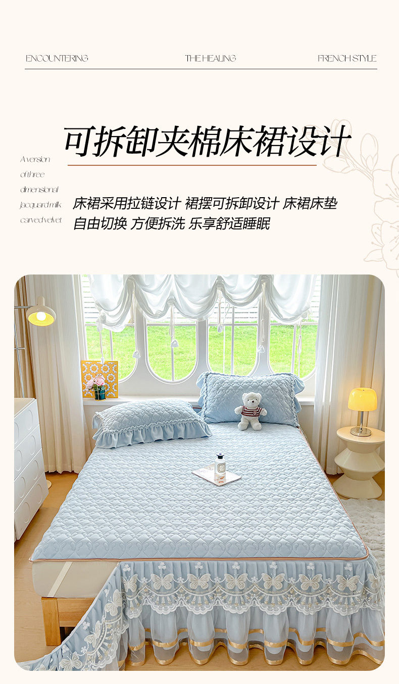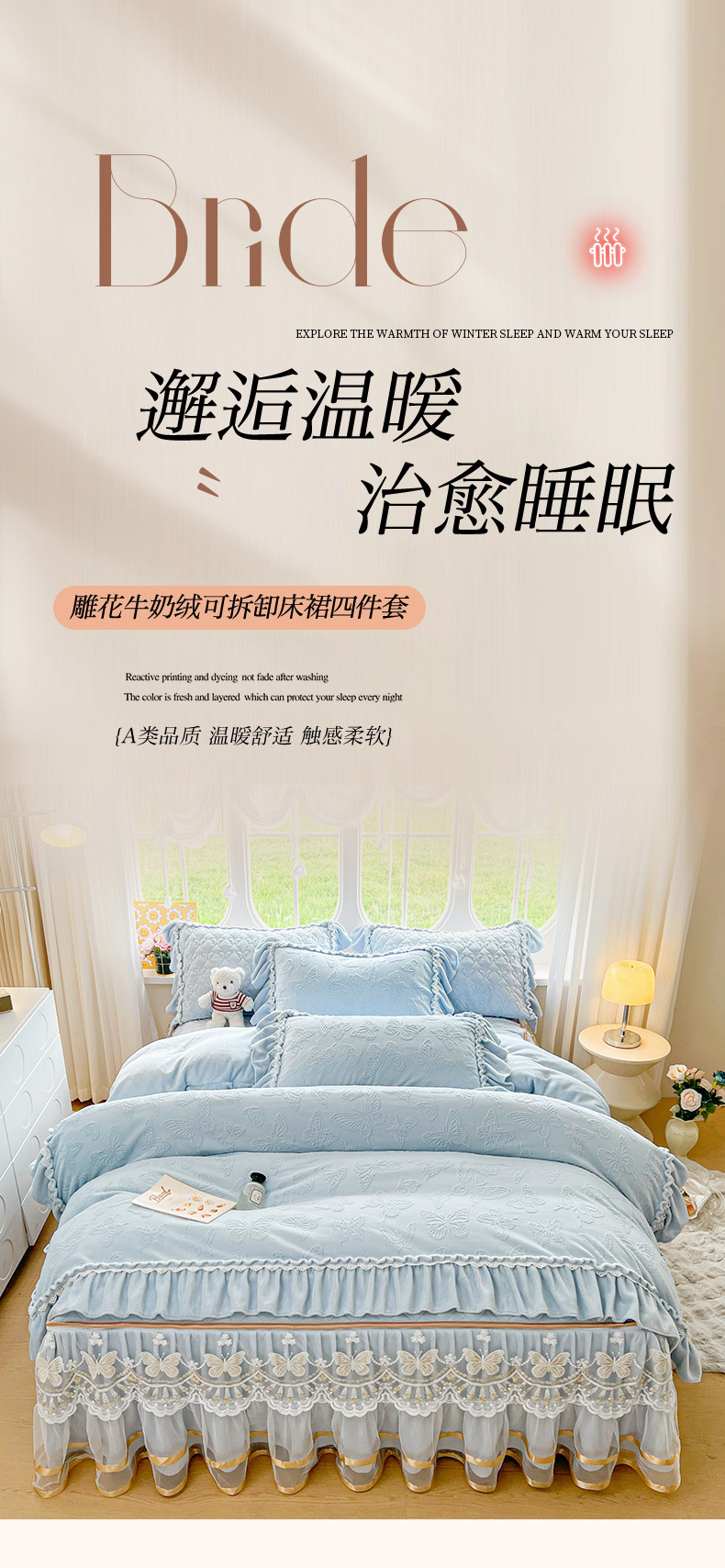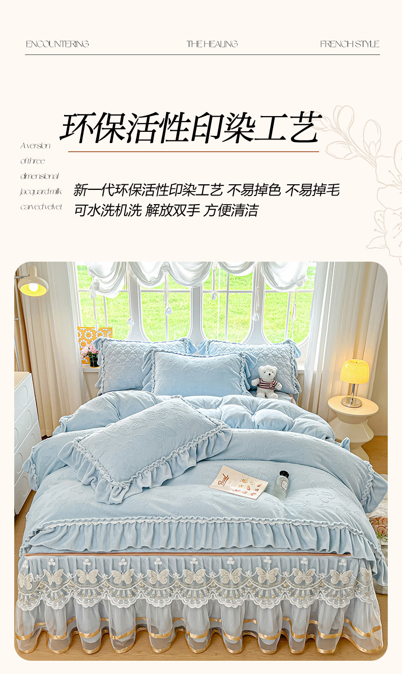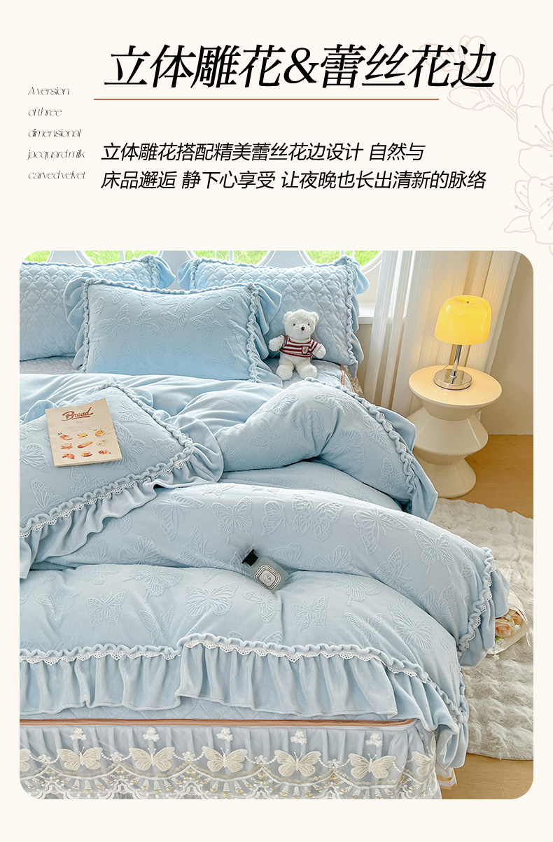 当前位置: 91家纺网 > 商品网购 > 床品套件 > 四件套 > 其它四件套 > 罗艺轩 2025新款简约雕花牛奶绒可拆卸床裙四件套蝶恋(已申专版,严格控价) 蝶恋-蓝
