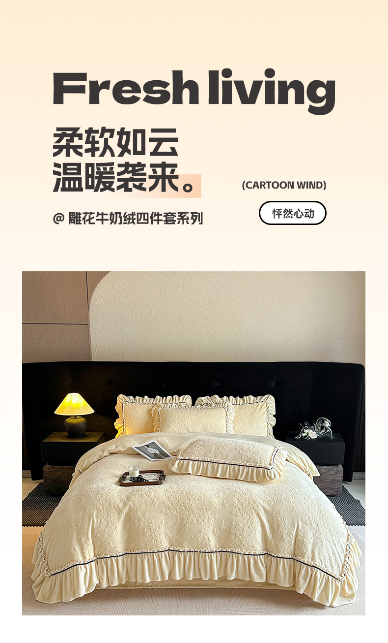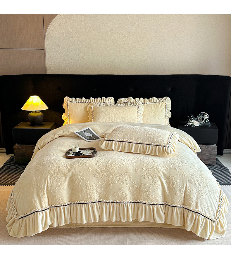 诺梵家纺 2025新款花边款雕花牛奶绒四件套 芊黛-黄