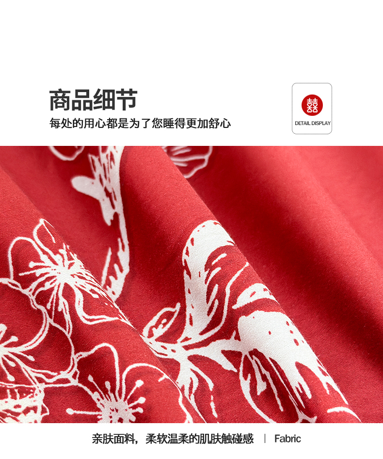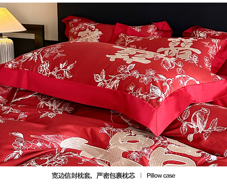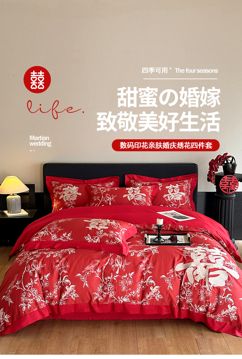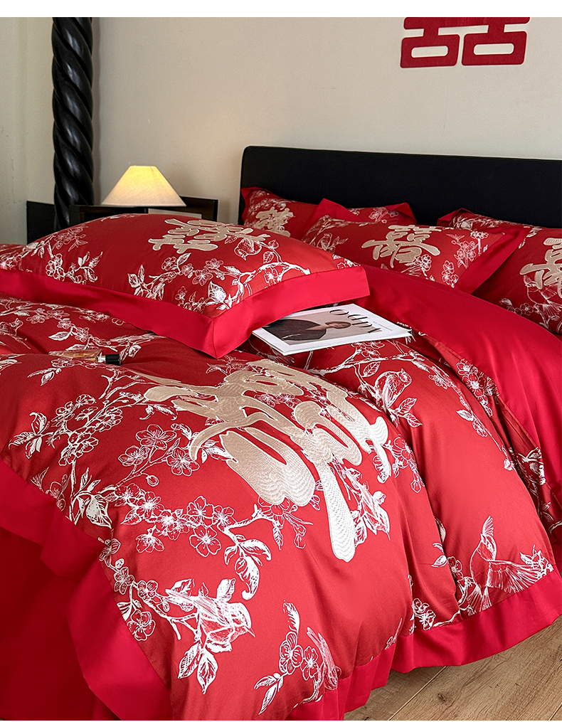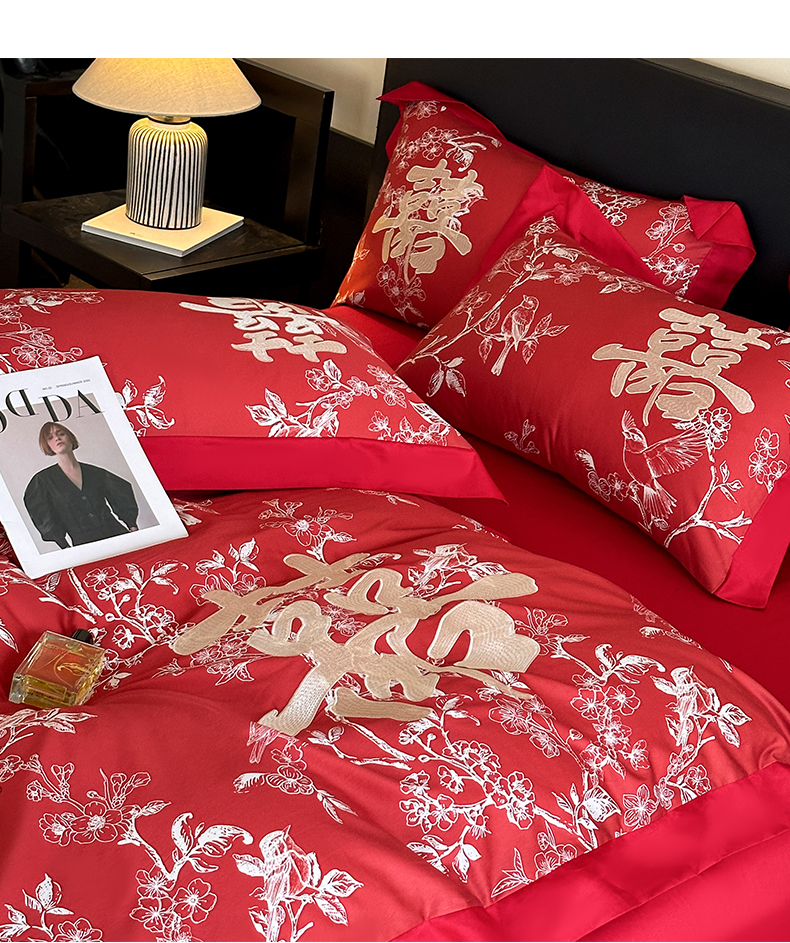 商品名称:置顶家纺 2025新款数码印花亲肤婚庆绣花四件套-大囍-暴富 大囍-暴富-大红