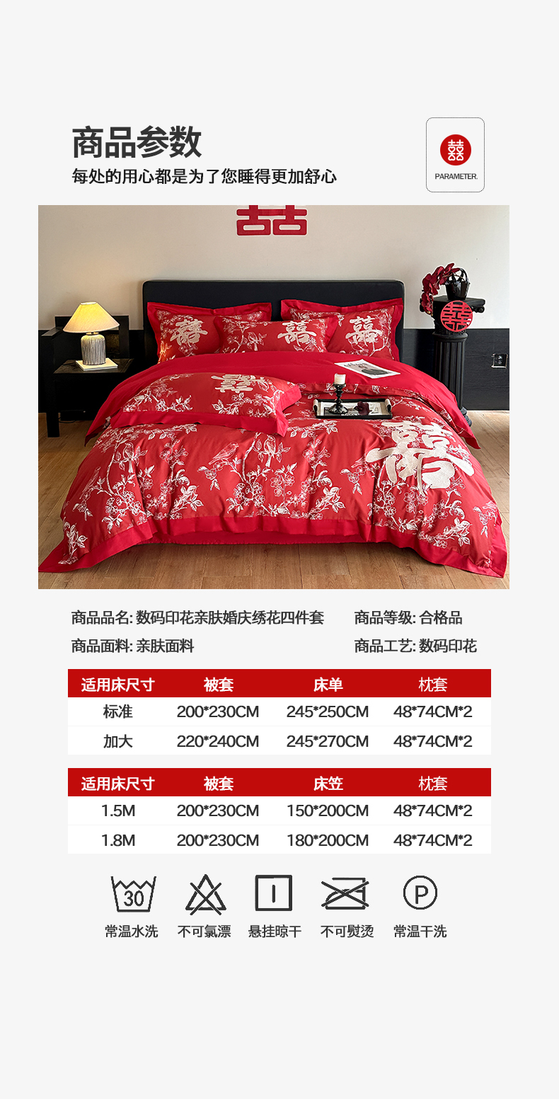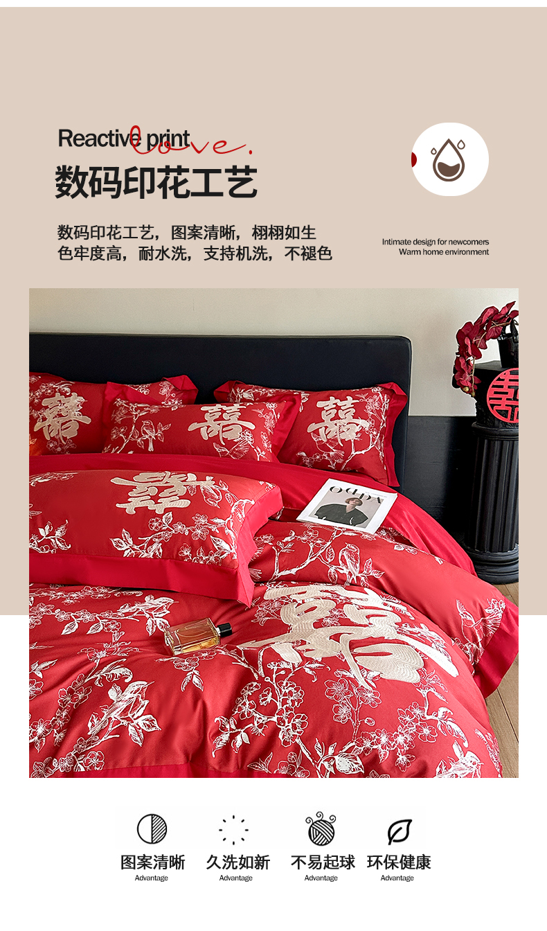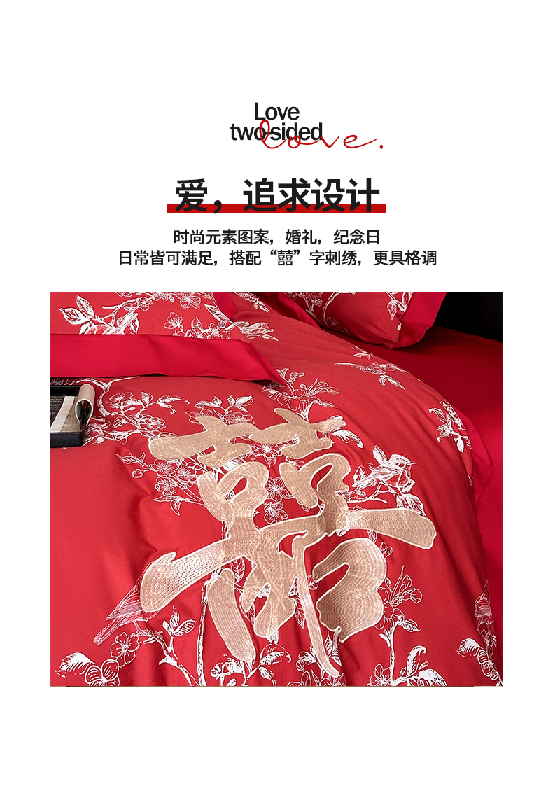 商品名称:置顶家纺 2025新款数码印花亲肤婚庆绣花四件套-大囍-暴富 大囍-暴富-大红