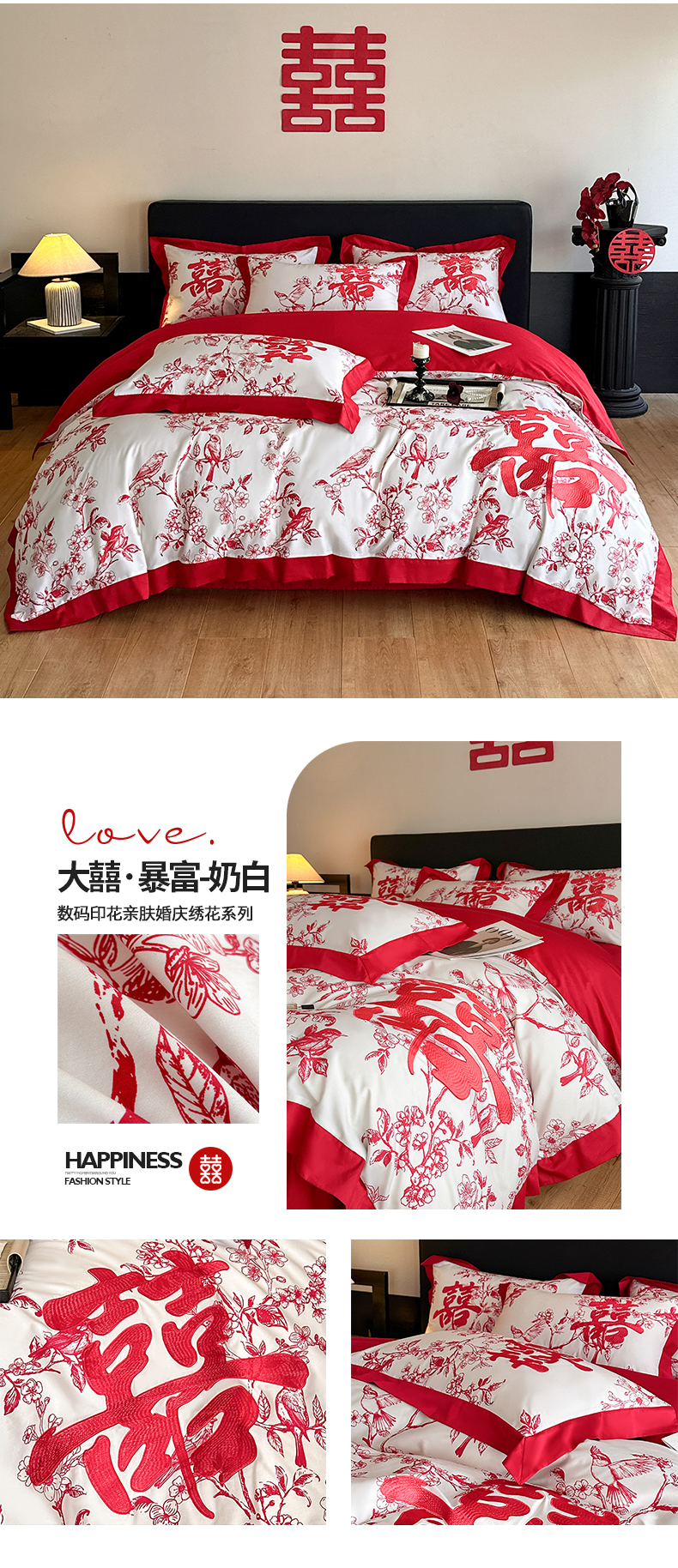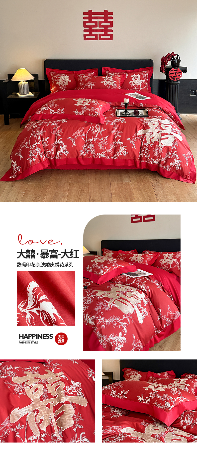 置顶家纺 2025新款数码印花亲肤婚庆绣花四件套-大囍-暴富 大囍-暴富-大红