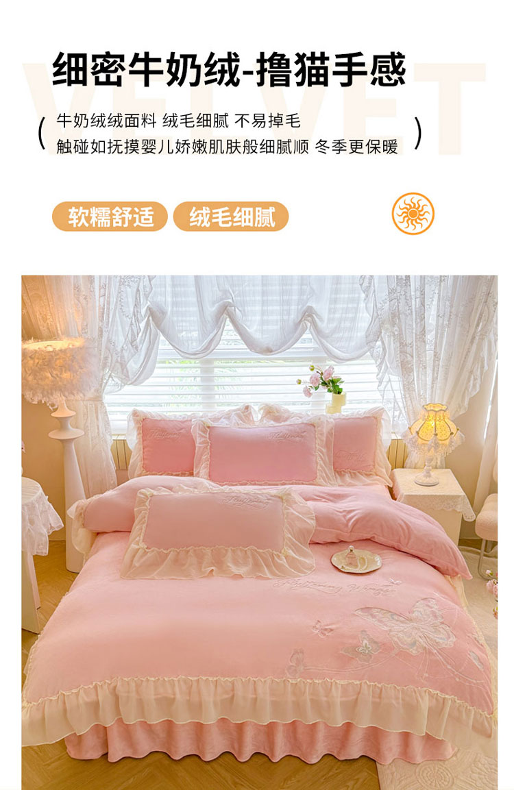 当前位置: 91家纺网 > 商品网购 > 床品套件 > 四件套 > 牛奶绒四件套 > 漫布云家纺SUMINA 2025新款简约ins风A类全消光230g牛奶绒公主绒四件套床裙款被套-彩蝶系列 彩蝶-樱花粉