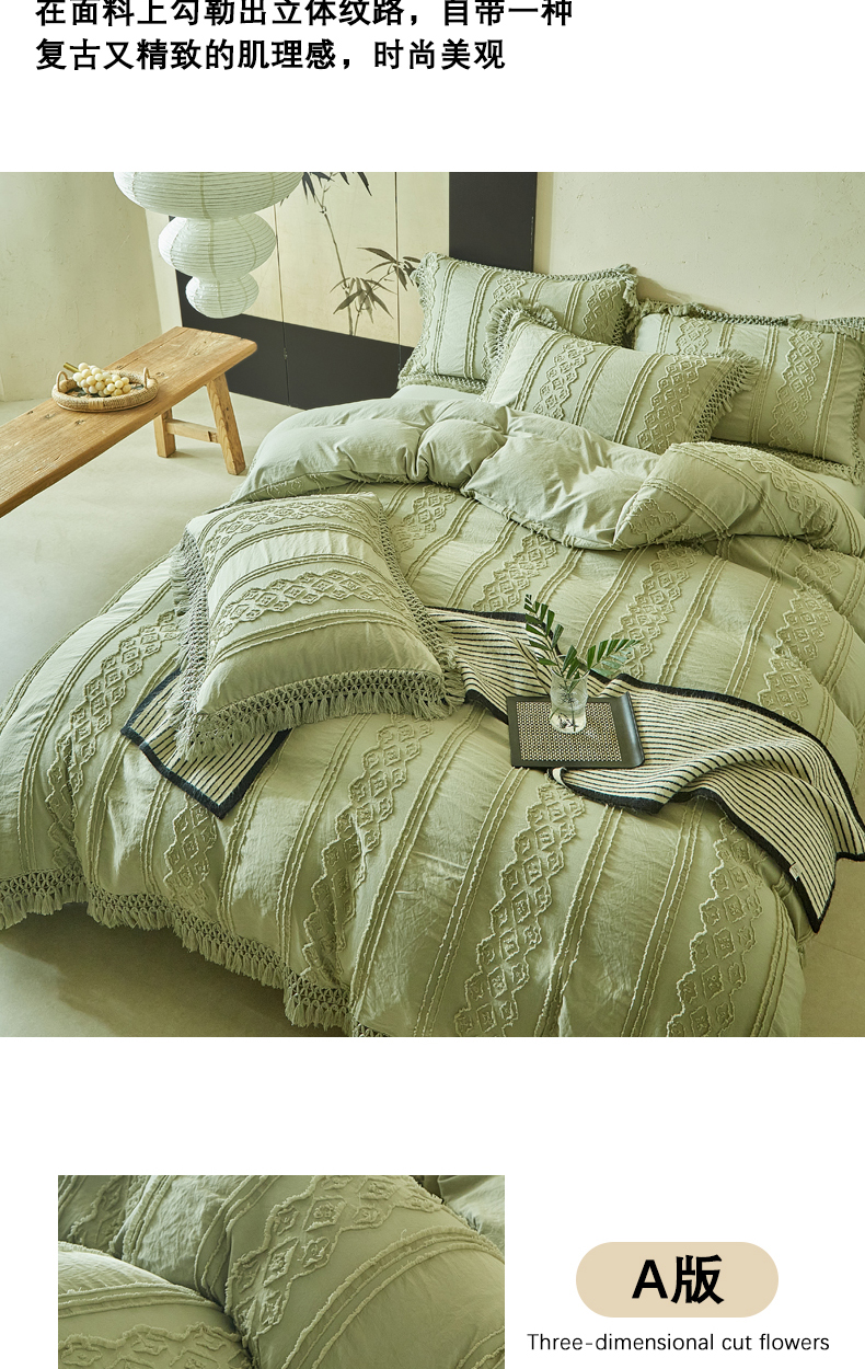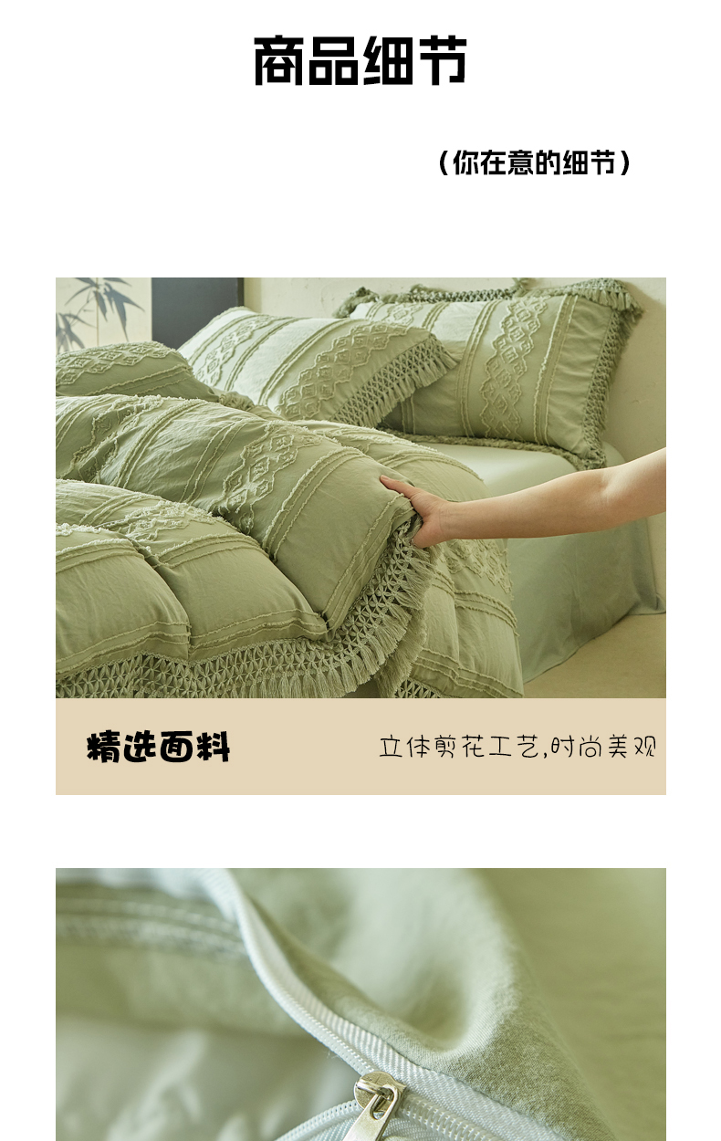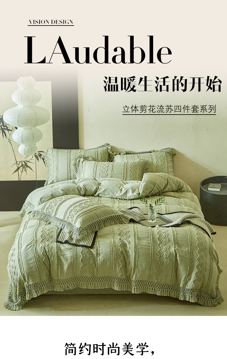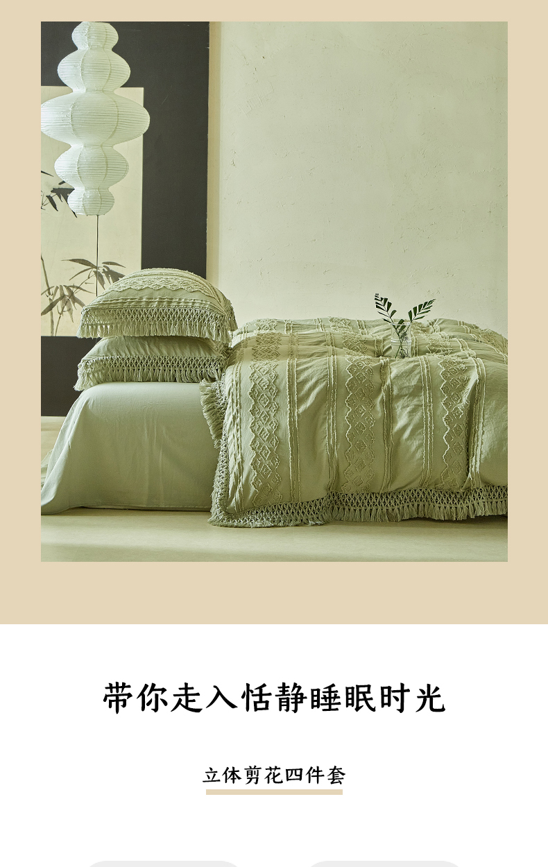 当前位置: 91家纺网 > 商品网购 > 床品套件 > 四件套 > 其它四件套 > 缘生活 2025新款立体剪花流苏四件套 四季通用-新增花型 剪花巴洛克 流苏+抹茶绿