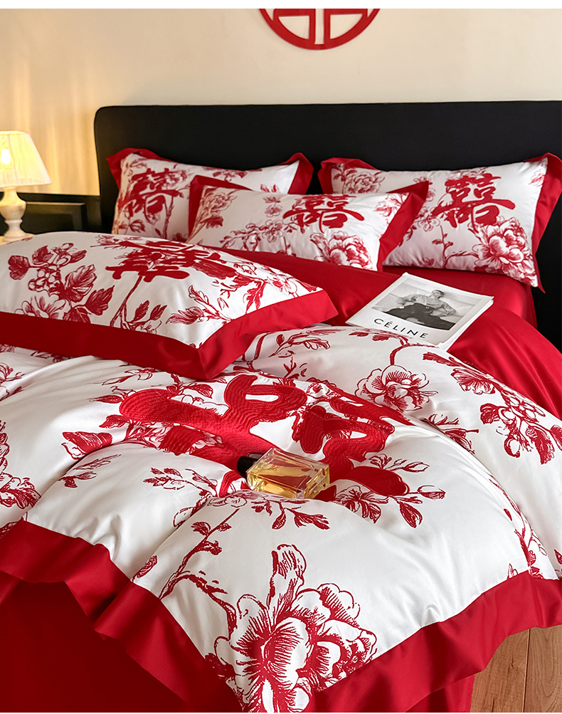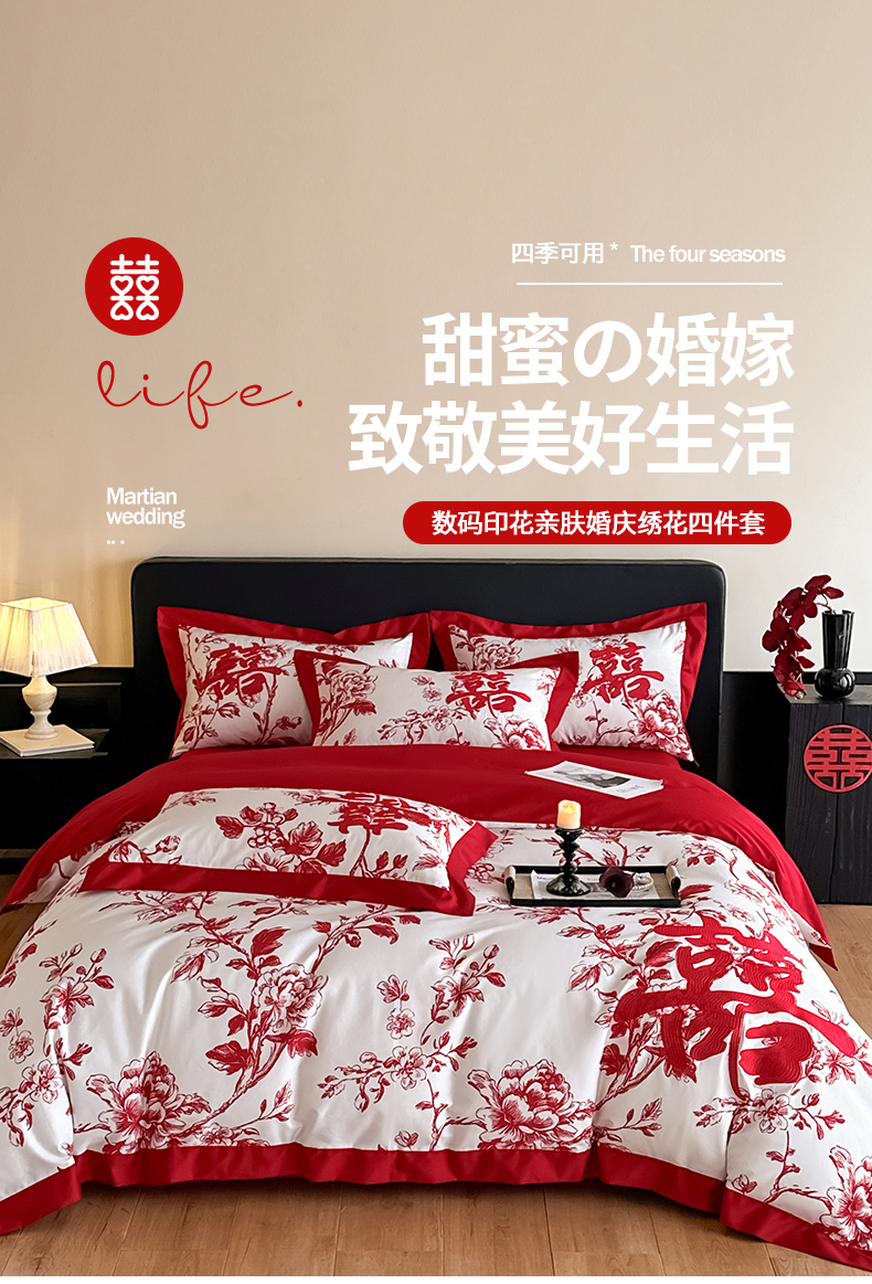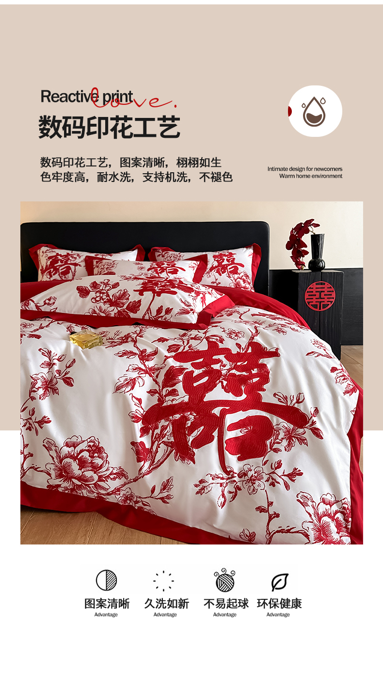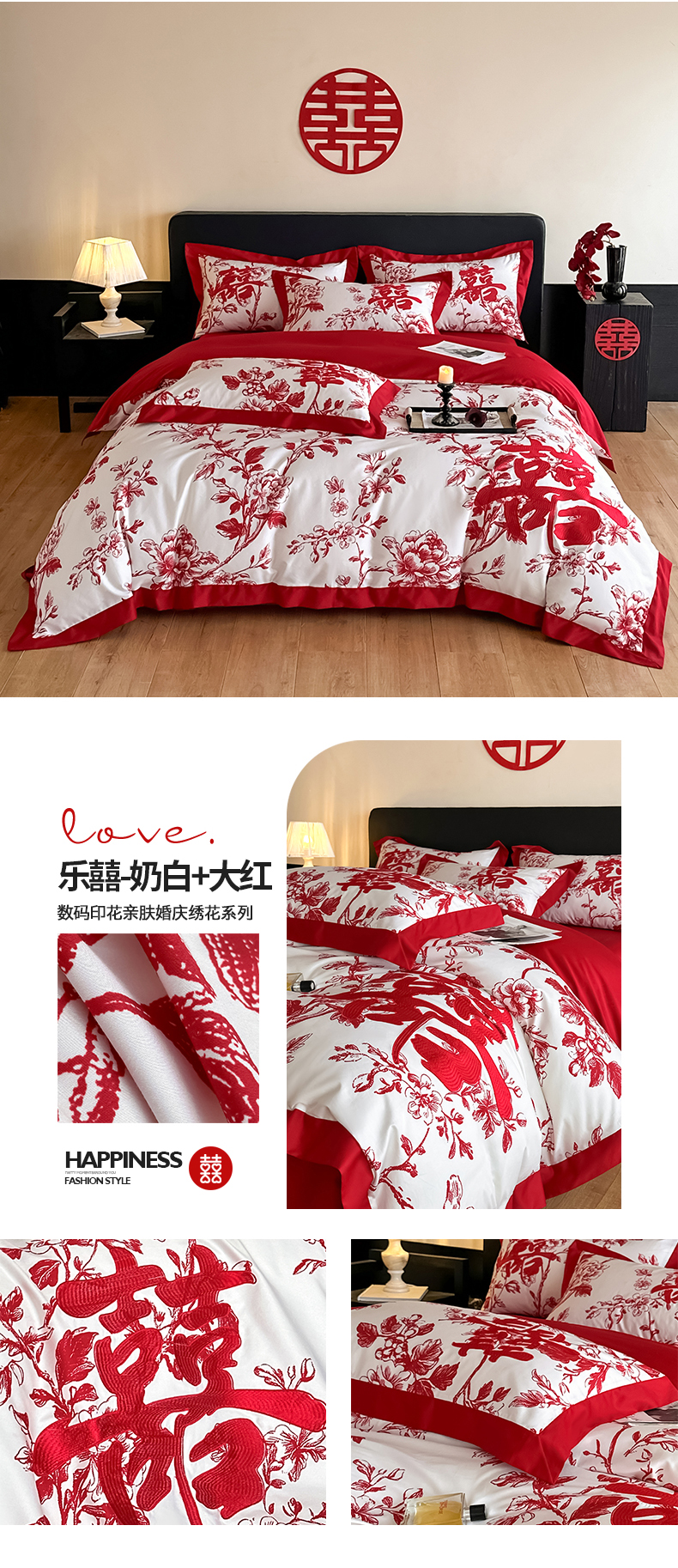 置顶家纺 2025新款乐囍婚庆简约亲肤系列四件套 乐囍-奶白+大红
