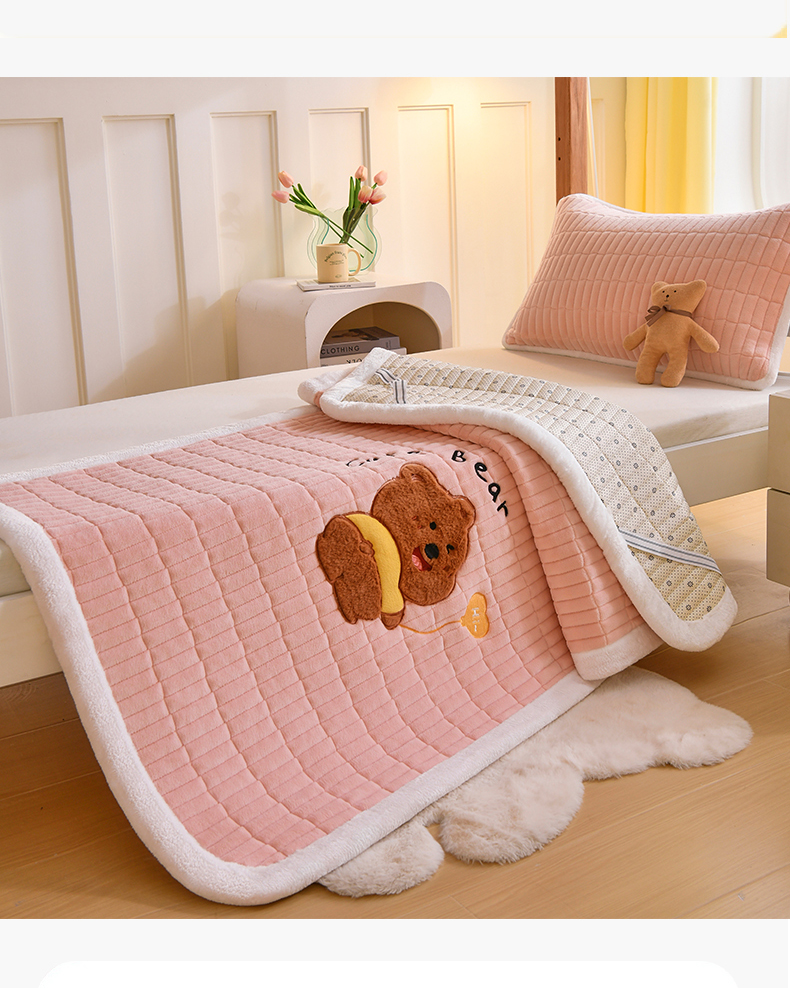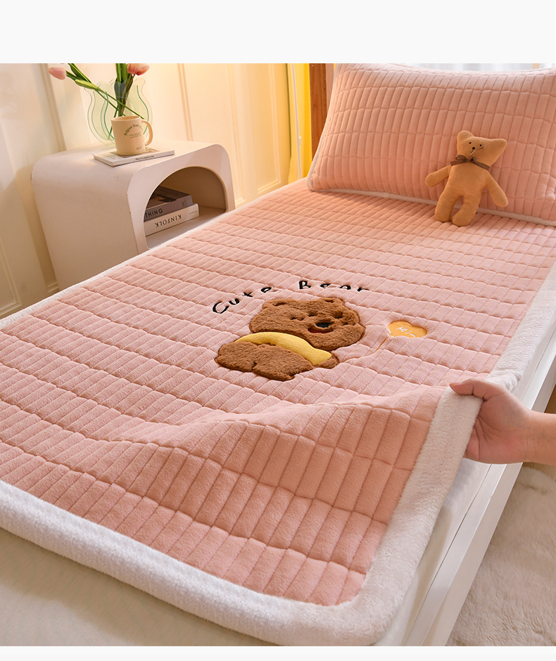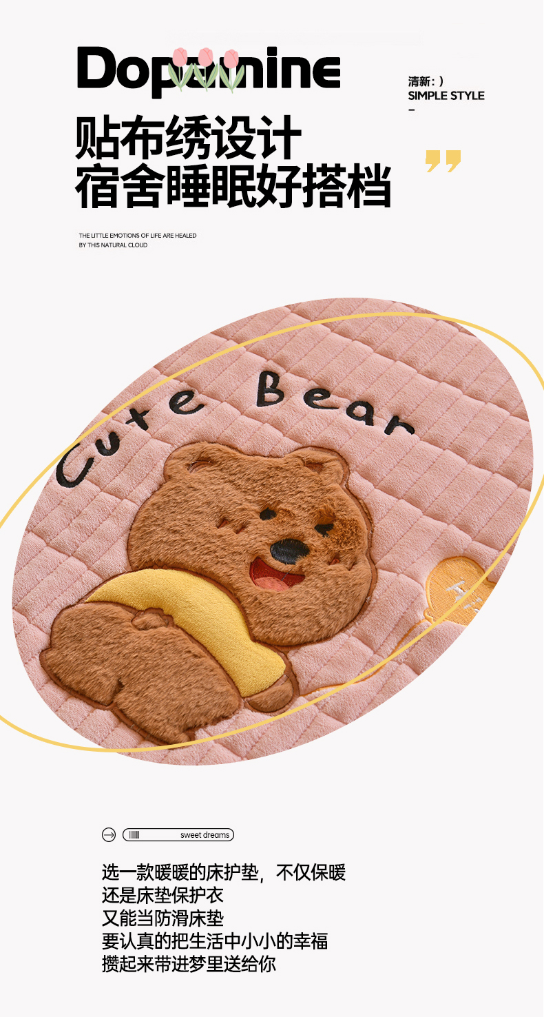 悠米悠家 2025新款学生款兔毛绒刺绣夹棉上下铺床褥 小熊-粉色