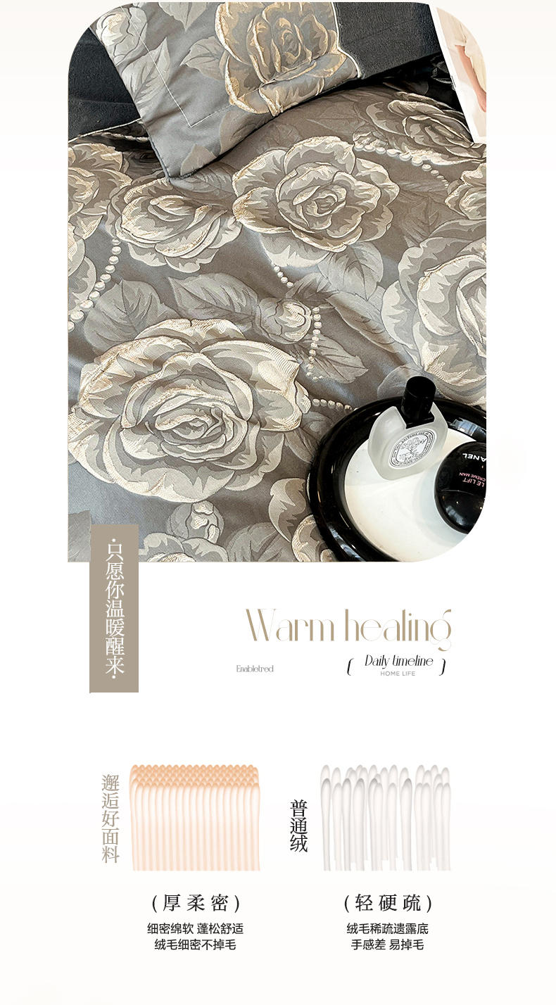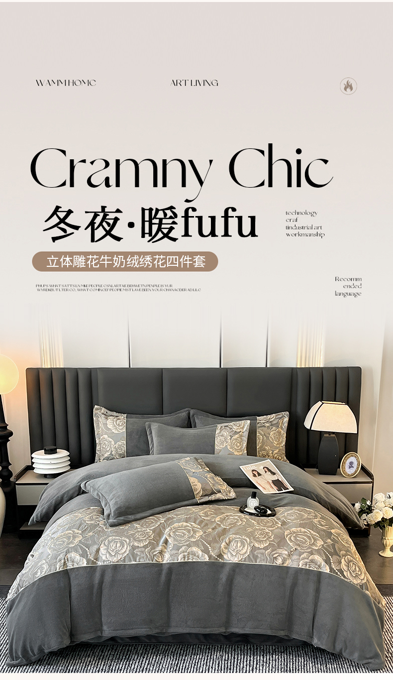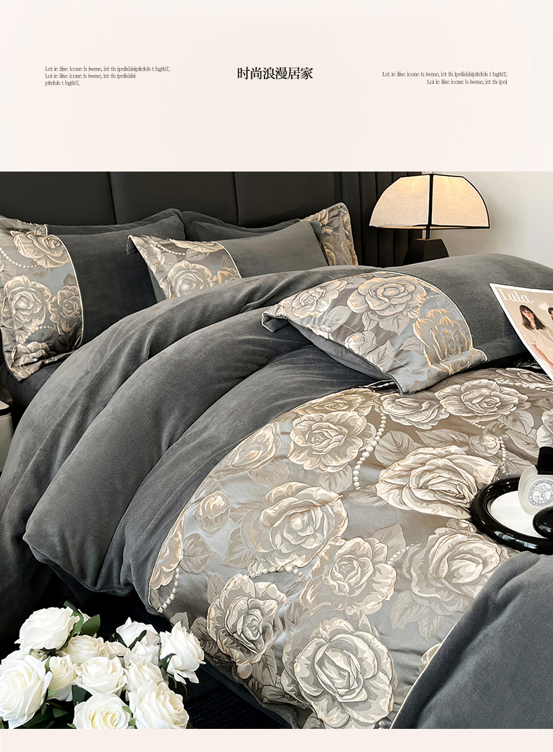 (总)富宁家纺 2025新款立体雕花牛奶绒绣花四件套-洛卡玫瑰系列,洛卡白,玫瑰灰,洛卡咖,玫瑰粉,洛卡蓝