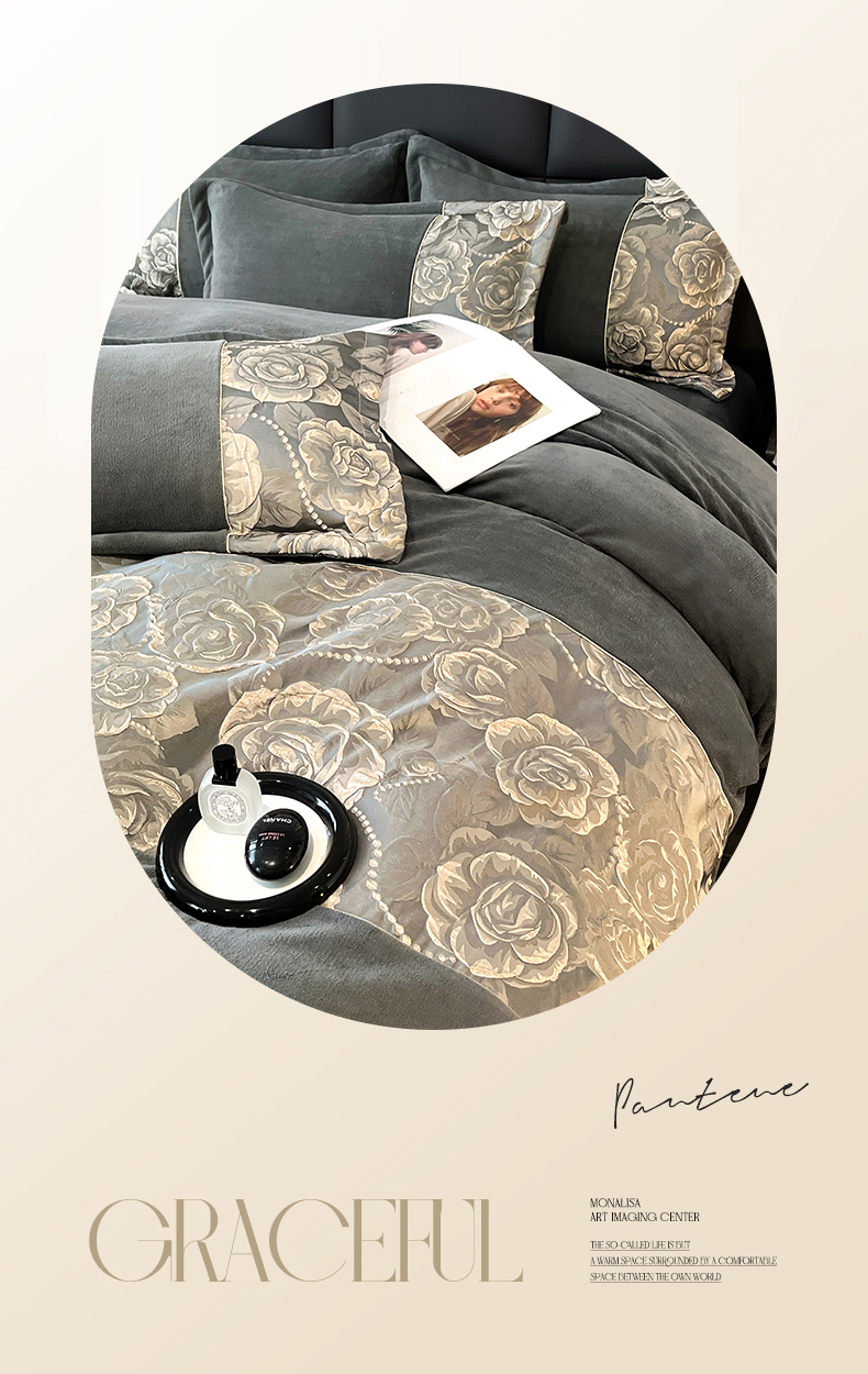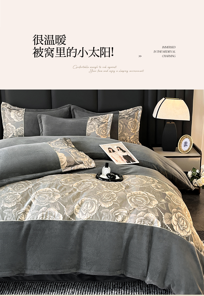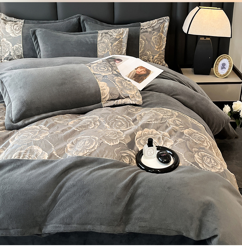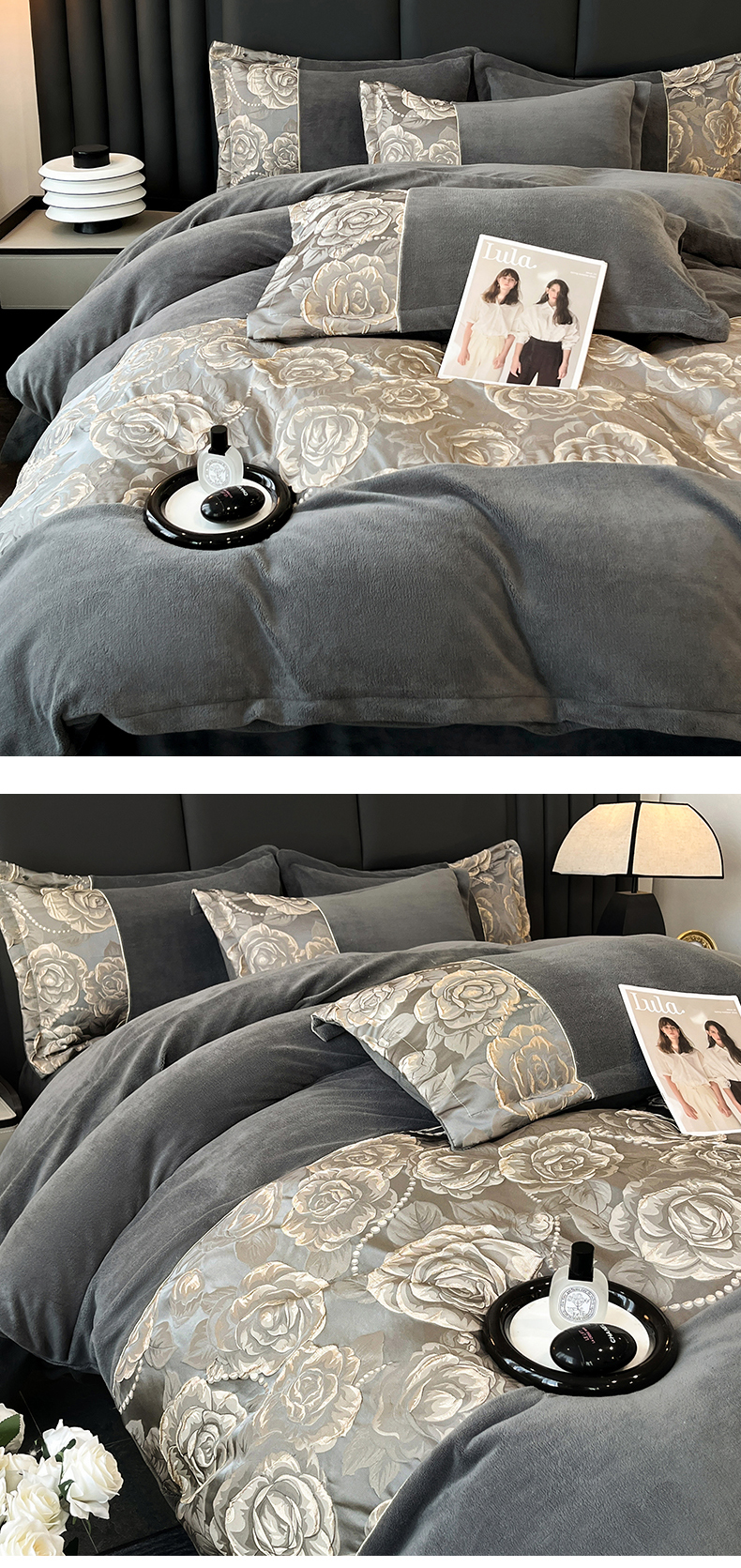 富宁家纺 2025新款立体雕花牛奶绒绣花四件套-洛卡玫瑰系列 玫瑰灰
