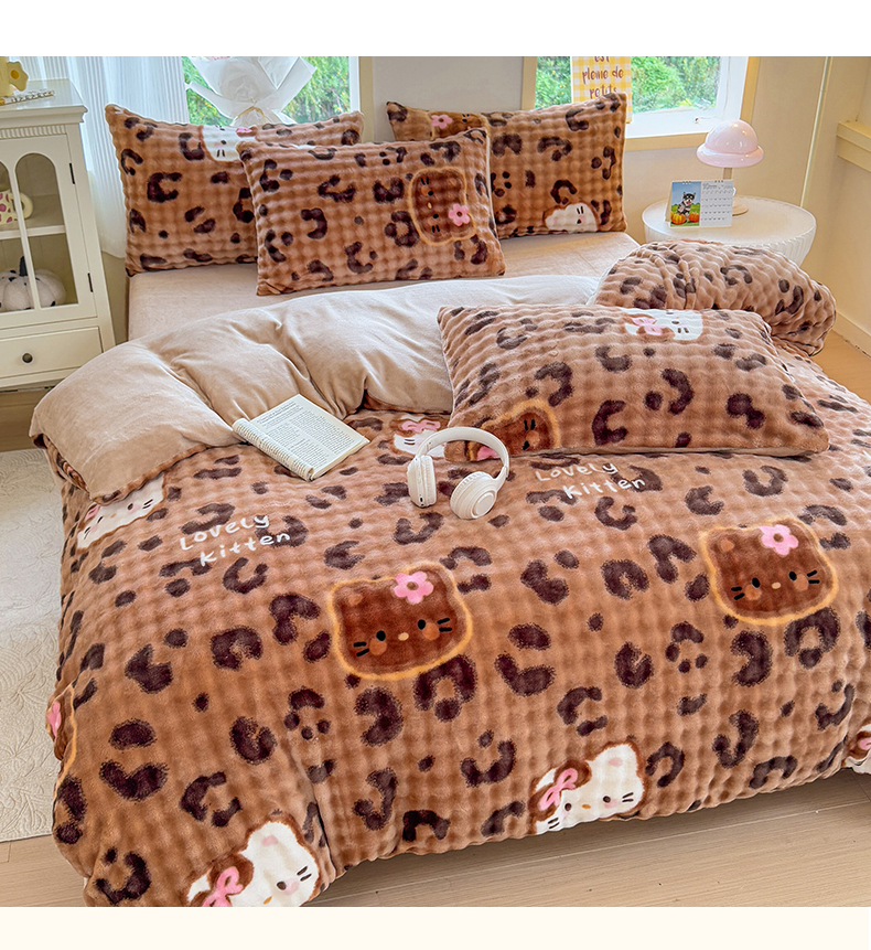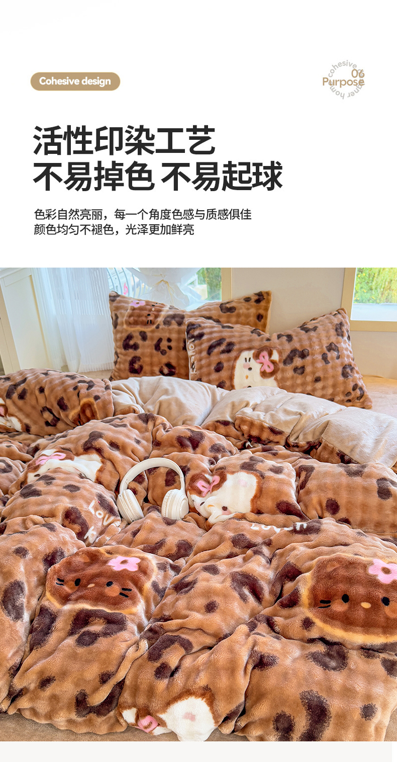 (总)仟岸家纺 2025新款牛奶绒印花四件套,豹纹咖,草莓喵,蝴蝶,蝴蝶结爱心,花妖白,花妖黑,花枝绿,玫瑰灰,玫瑰咖,顽皮狗,小点点