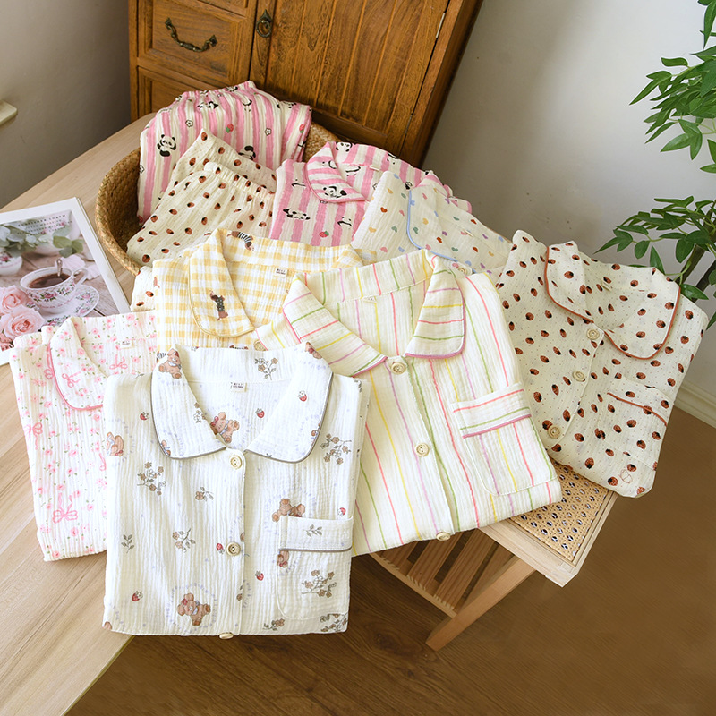 商品名称:洛兰沙家居馆 2025新款双层绉纱棉纱卡通系列女士家居服睡衣长袖长裤透气舒适四季款纯棉 海盐碎花