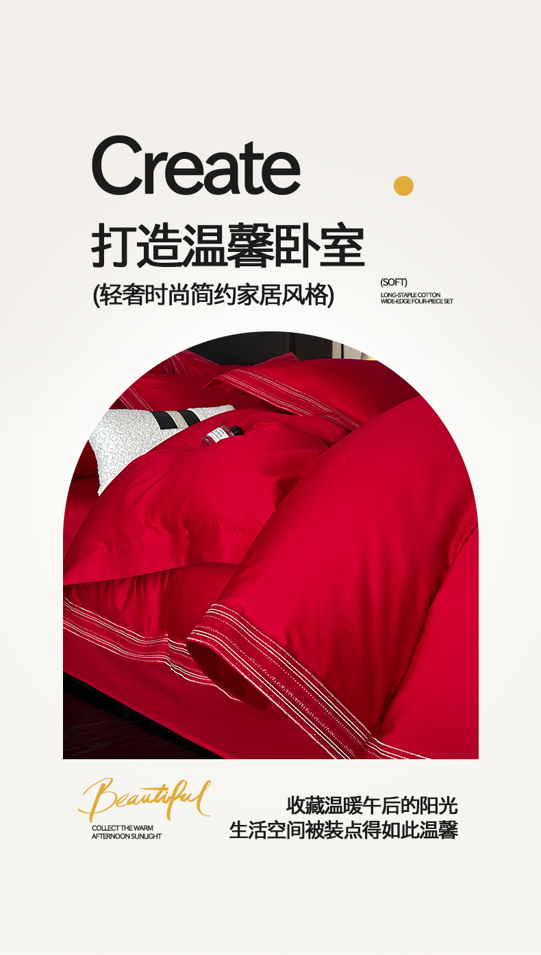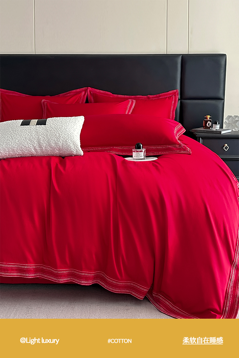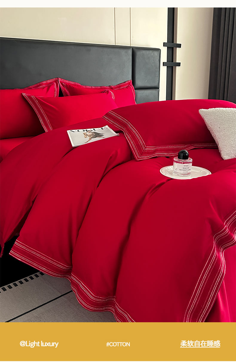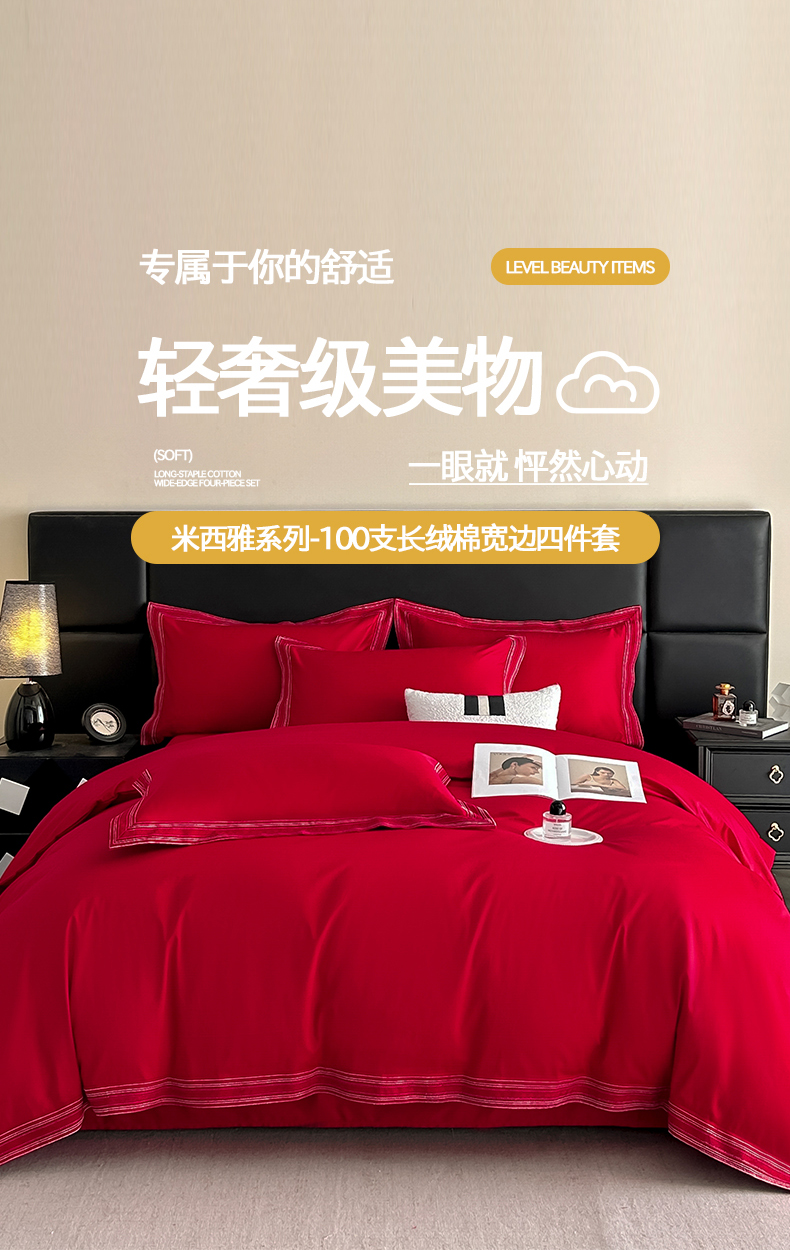 当前位置: 91家纺网 > 商品网购 > 床品套件 > 四件套 > 长绒棉四件套 > 置顶家纺 2025新款50双股支长绒棉纯棉宽边四件套-米西雅 米西雅-大红