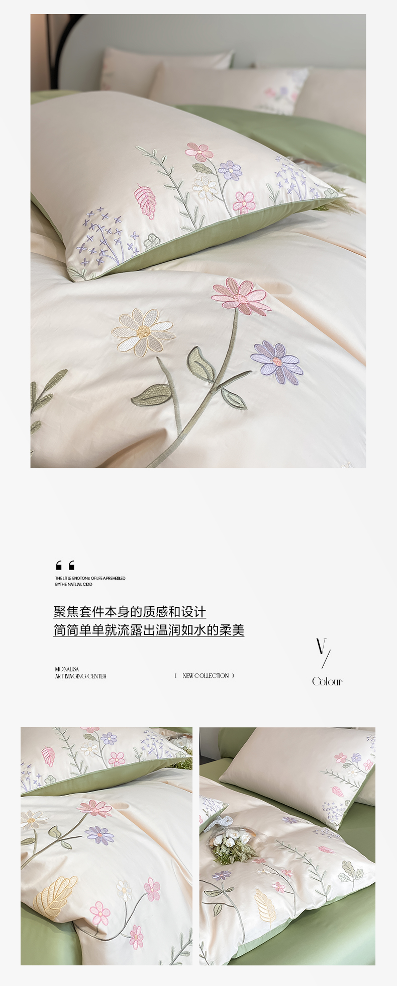 商品名称:欣宜家纺 2025新款全棉长绒棉刺绣绣花款纯棉四件套高端礼盒款-洛可系列 洛可可-白绿