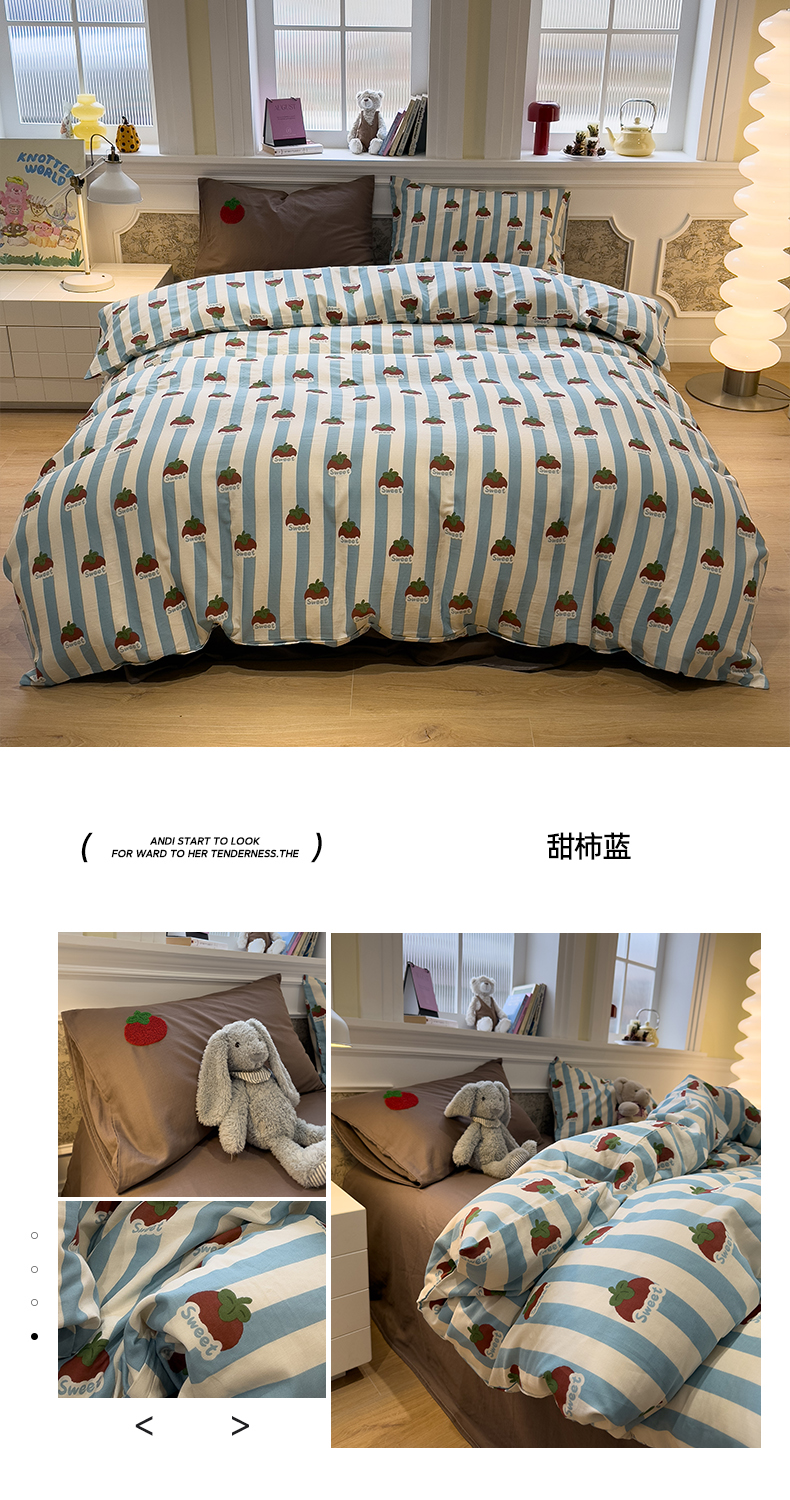 商品名称:呗旺鹿 2026新款ins风全棉撞色双层纱毛巾绣甜柿子系列四件套 甜柿蓝