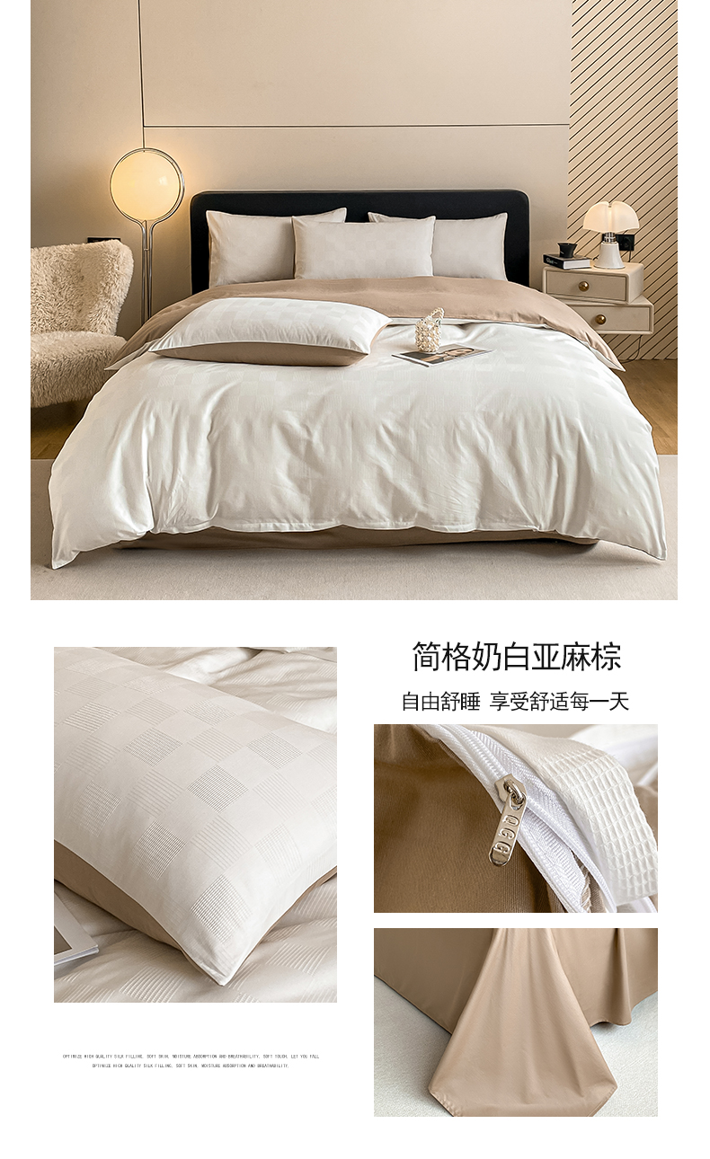 (总)琪格格纺织 2026新款轻奢长绒棉纯棉高级感提花方格酒店名宿居家四件套,60长绒棉-简格本白,60长绒棉-简格奶白亚麻棕,60长绒棉-简格亚麻棕,60长绒棉-纯果绿,60长绒棉-高级灰,60长绒棉-奶昔白,60长绒棉-奶昔白+果绿,60长绒棉-奶昔白+摩卡棕,60长绒棉-杏仁+摩卡棕,原棉大提花-本白,原棉大提花-卡其棕,原棉大提花-摩登灰,原棉大提花-浅蓝,原棉小提花-本白-场景一,原棉小提花-本白-场景二