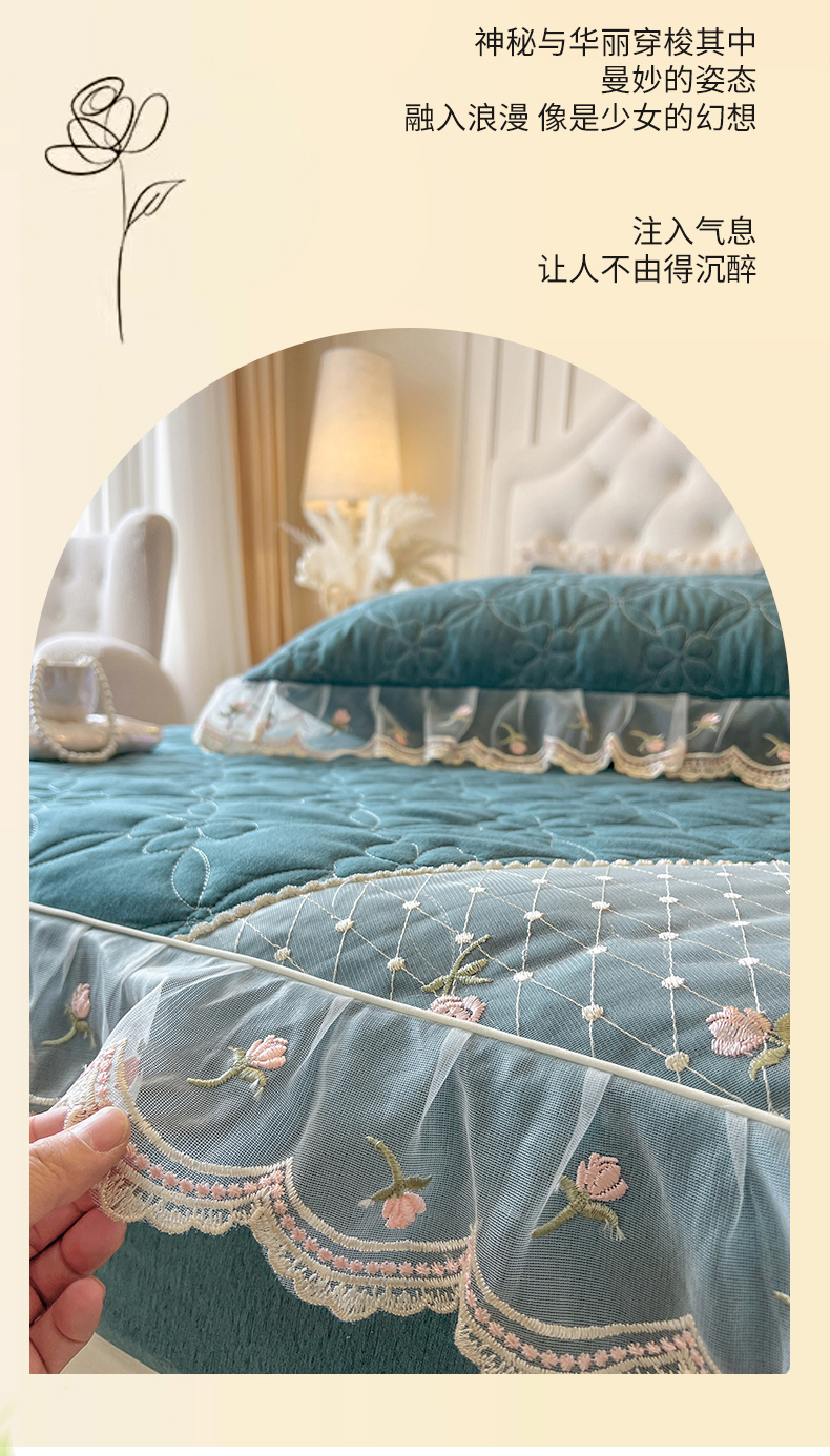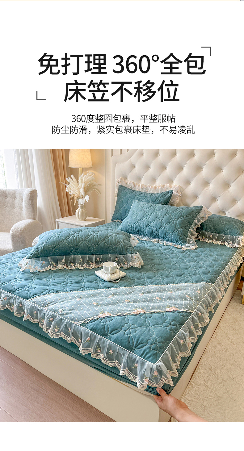 网红馆(ck家纺) 2026新款色织蕾丝边床裙款床笠 黛绿色