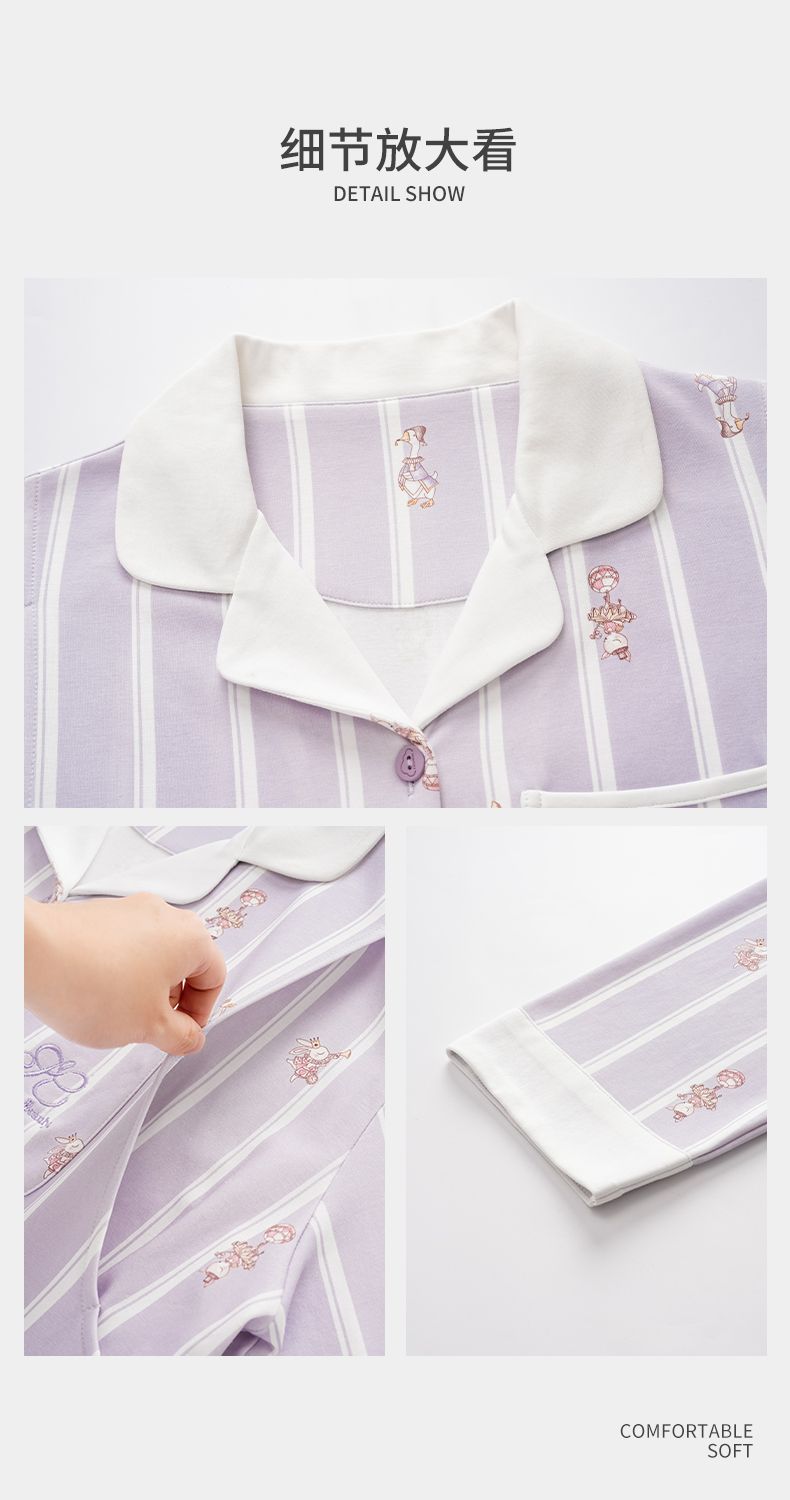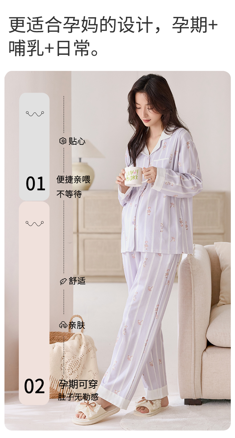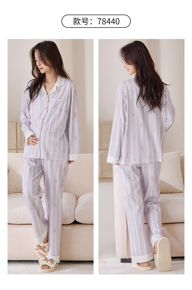 商品名称:洛兰沙家居馆 2026春秋季新款小清新针织全棉纯棉100%翻领开衫双长孕妇月子服睡衣女 翻领套装3