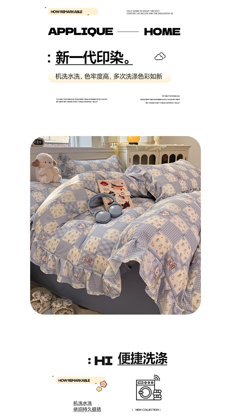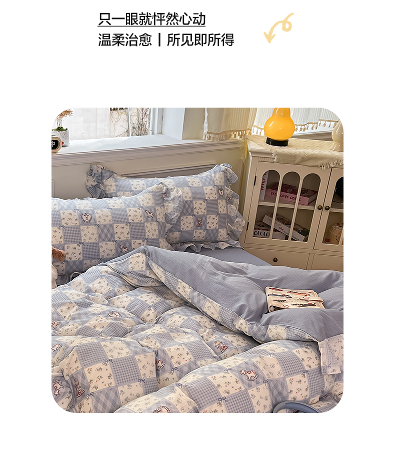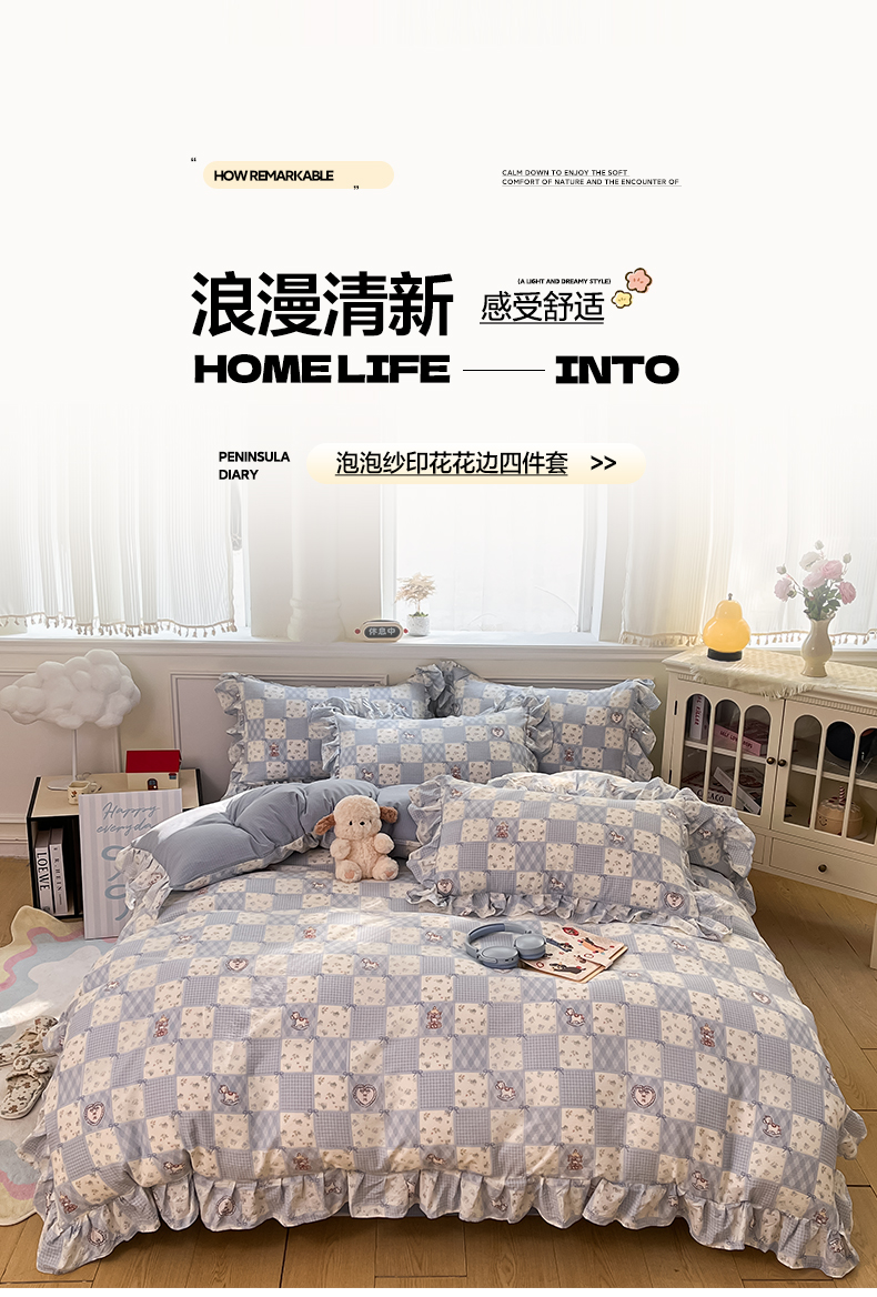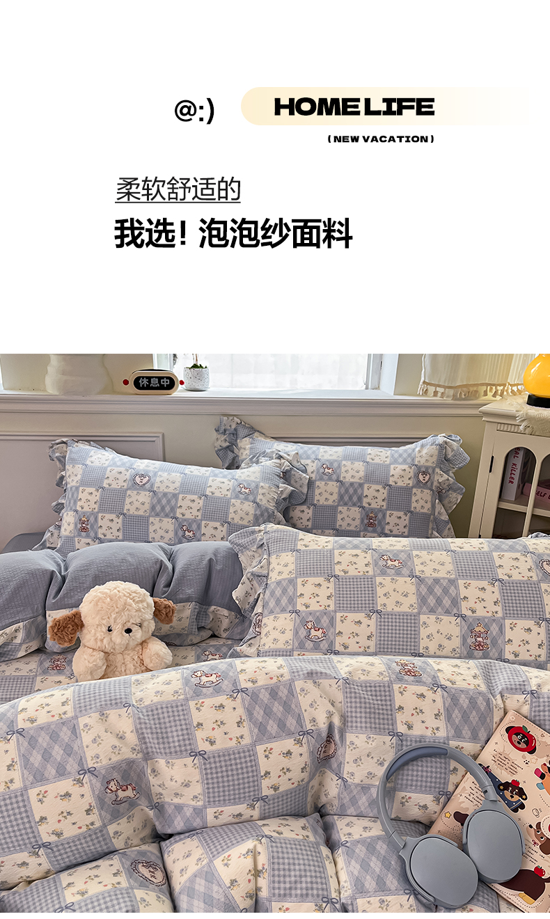 当前位置: 91家纺网 > 商品网购 > 床品套件 > 四件套 > 其它四件套 > 摩妮卡 2026新款泡泡纱韩版印花花边四件套 木马乐园