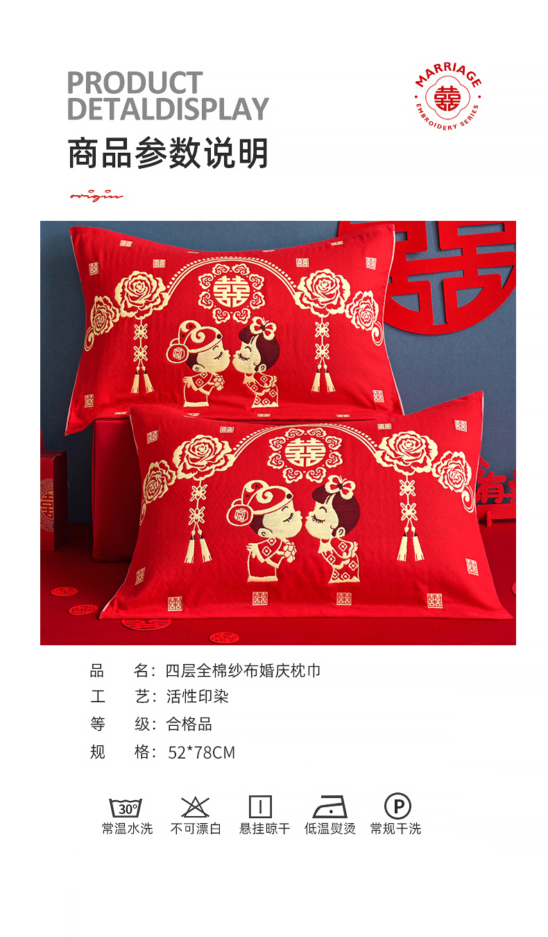 商品名称:朴尔家纺-毛巾被 2026新款全棉40股结婚大红多层纱布透气情侣婚庆枕巾 喜从天降