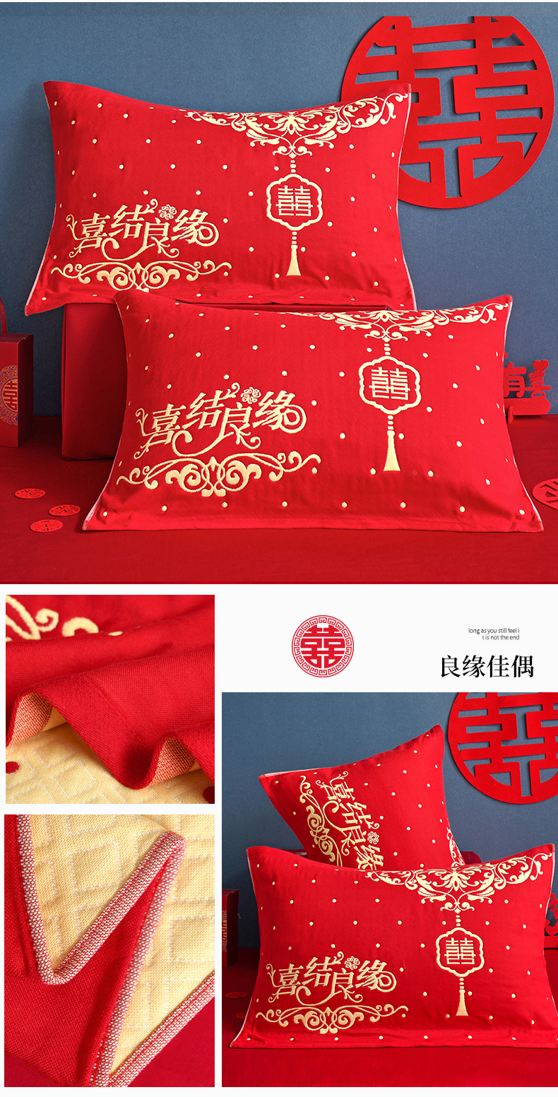 朴尔家纺-毛巾被 2026新款全棉40股结婚大红多层纱布透气情侣婚庆枕巾 喜从天降