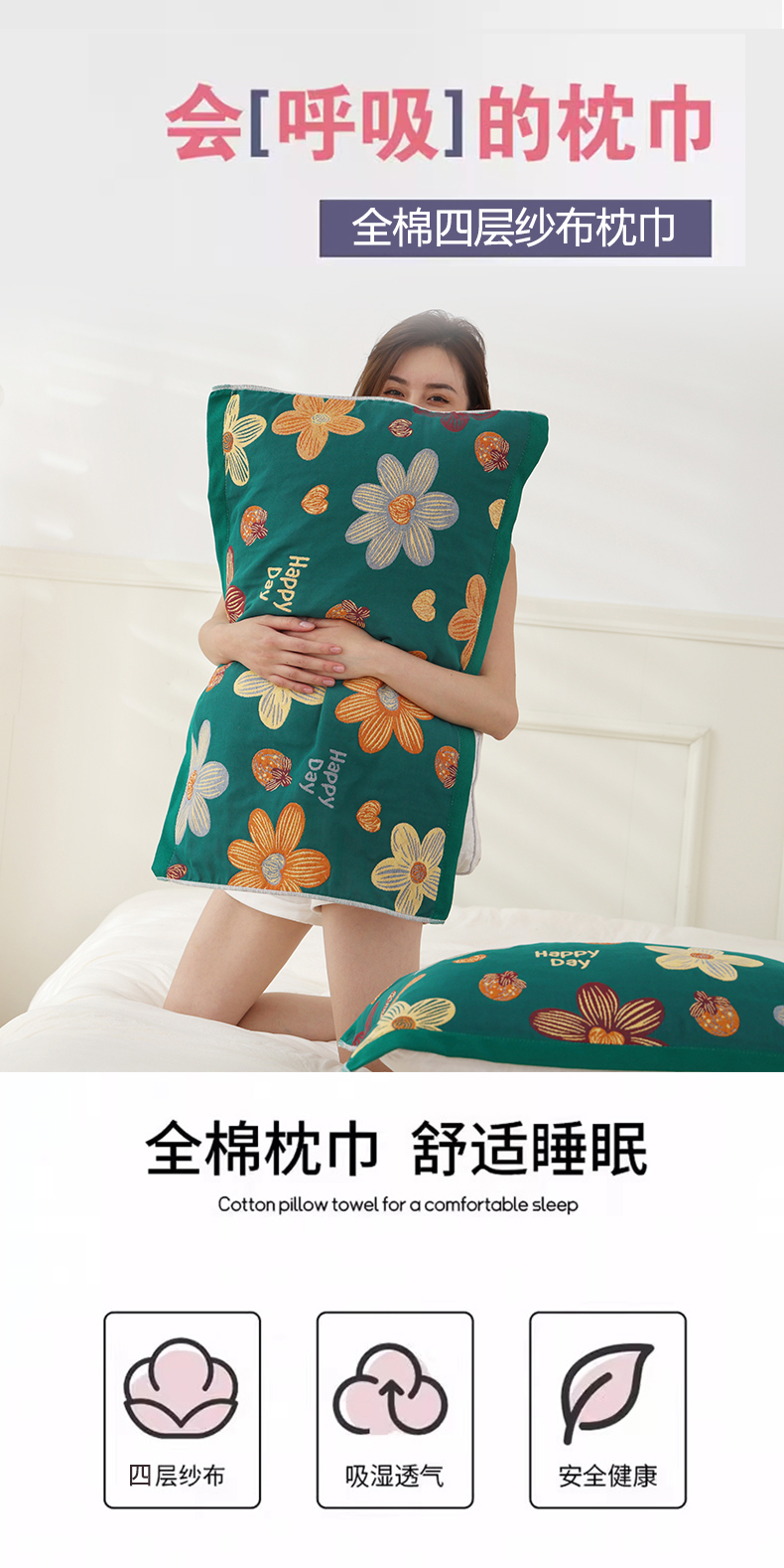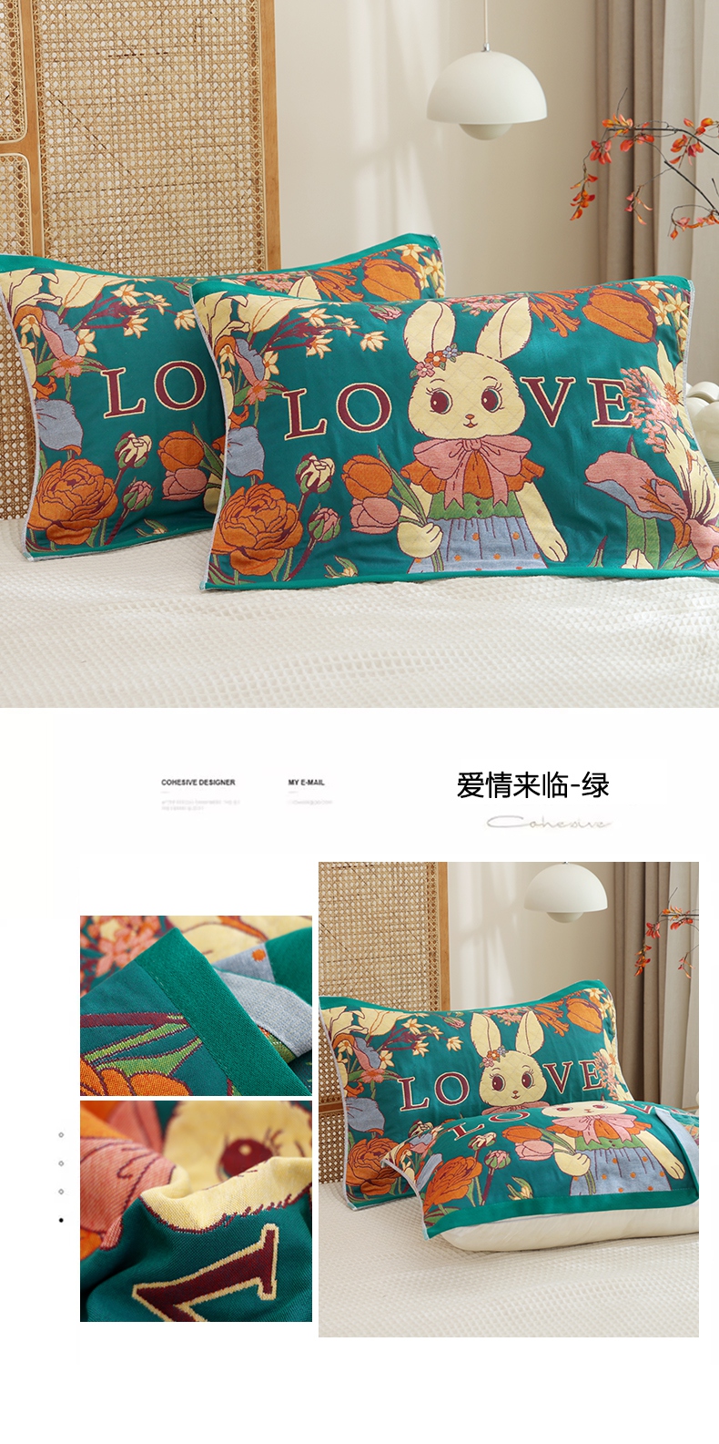 商品名称:朴尔家纺-毛巾被 2026新款色织定位提花纯棉四层纱布枕巾 爱情来临-绿