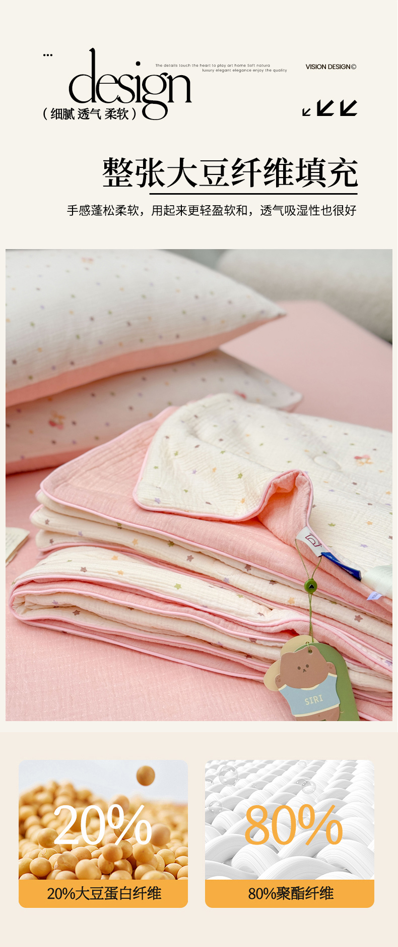 • 填充纤维种类: 大豆蛋白改性聚酯纤维