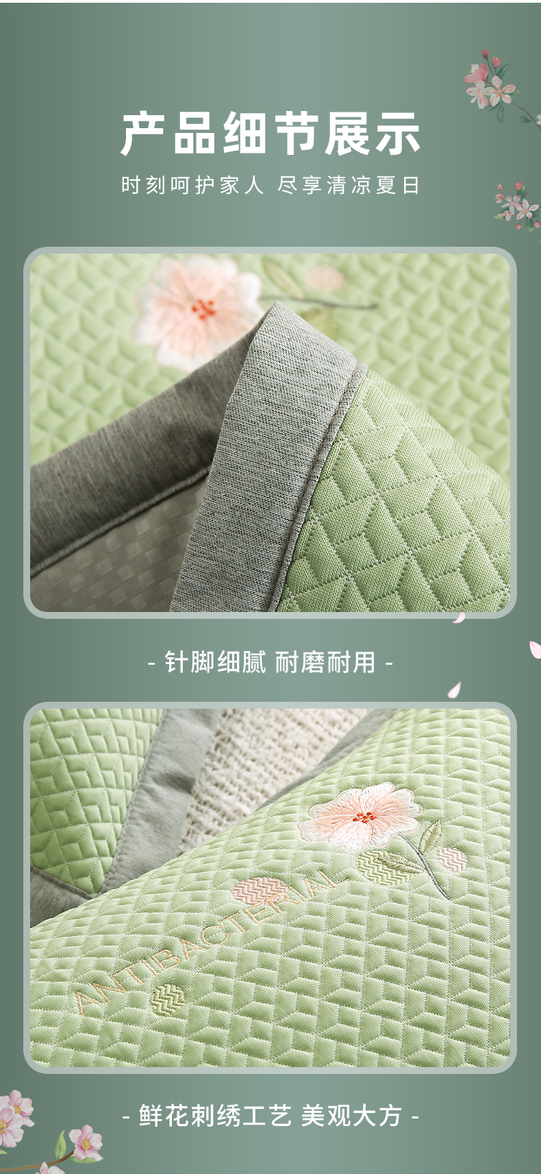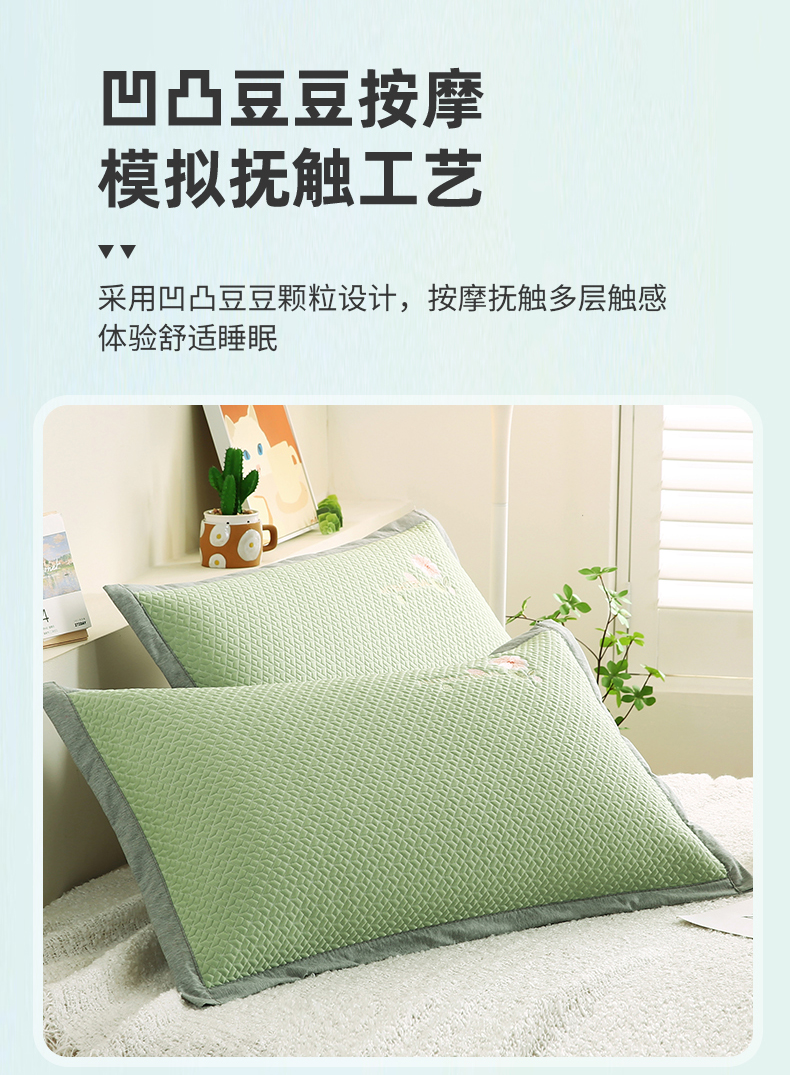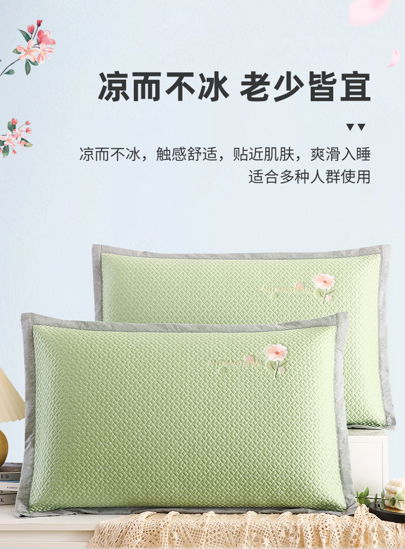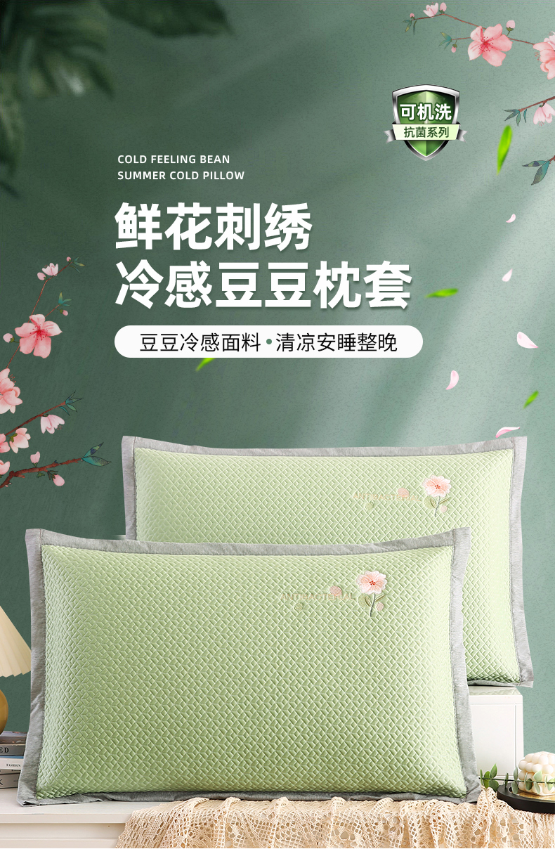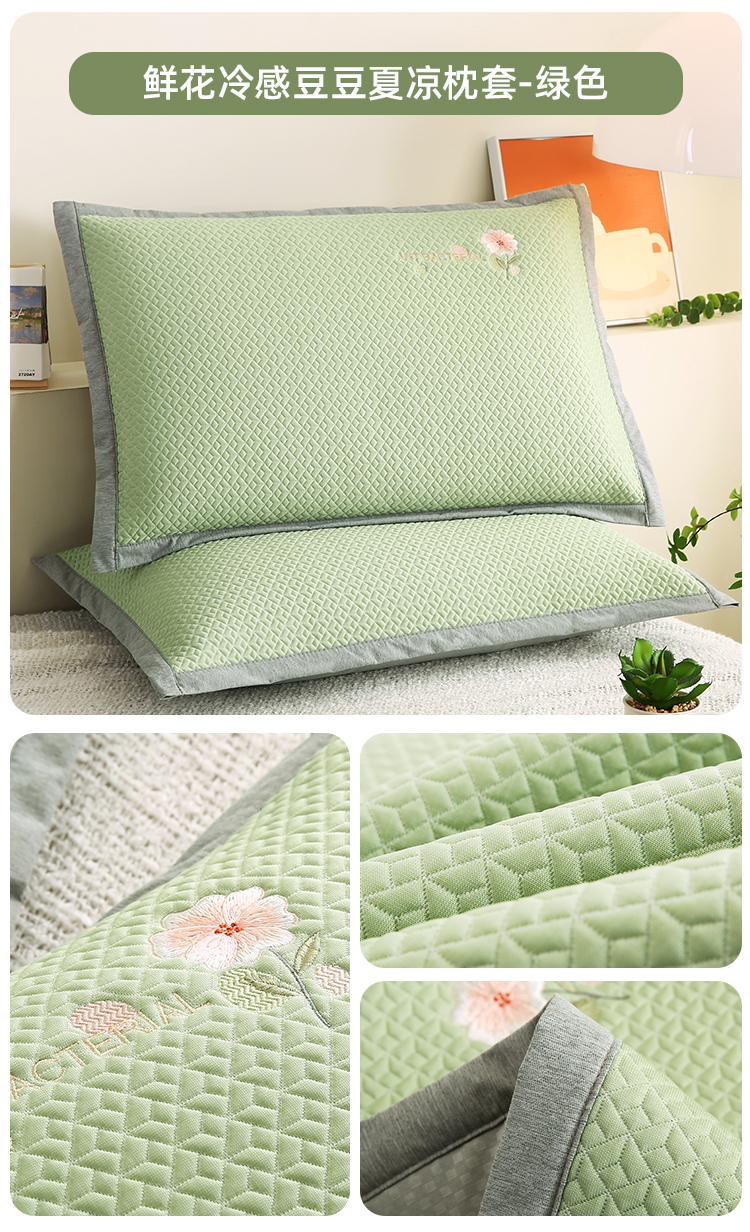 小牛席业 2026新款鲜花刺绣冷感豆豆枕套单枕套枕套单件 绿色