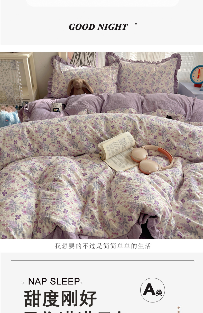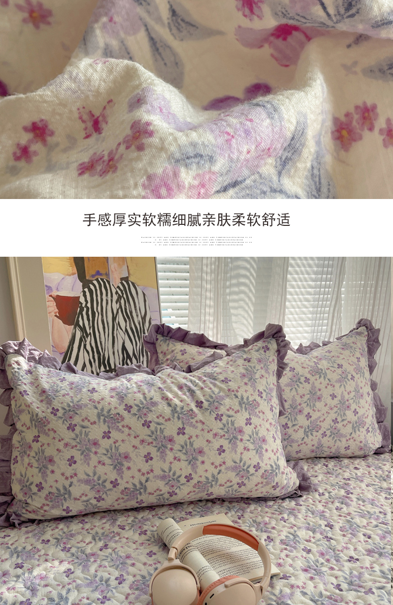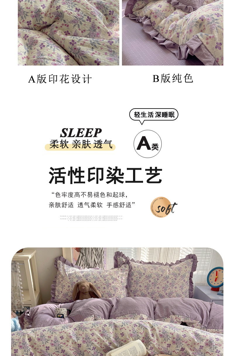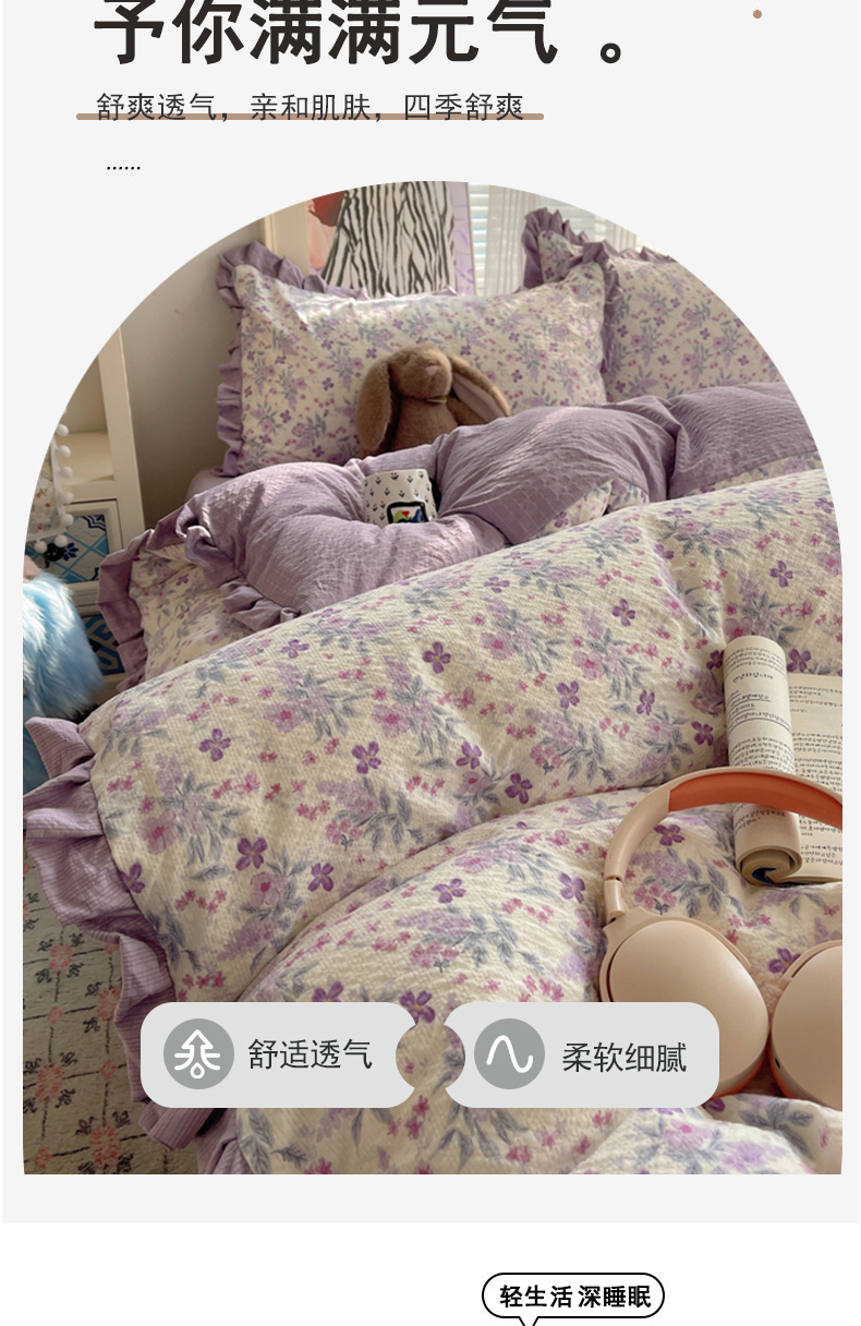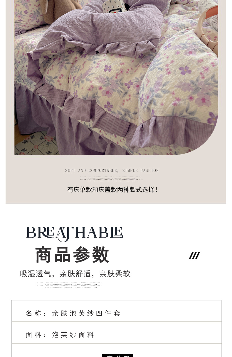 商品名称:迪梦姿家纺 2026新款高克重泡芙纱泡泡纱床盖款四件套系列 紫雾花蝶集