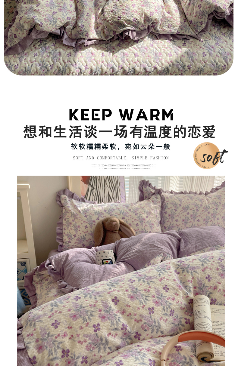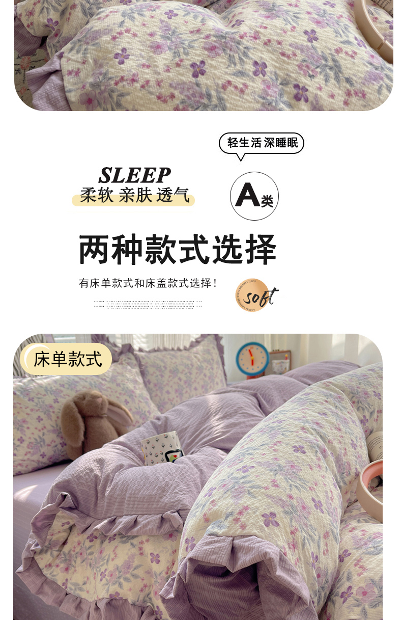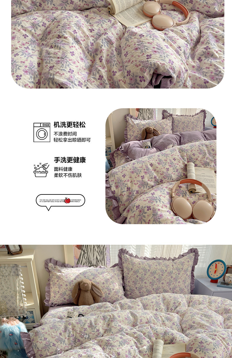 (总)迪梦姿家纺 2026新款高克重泡芙纱泡泡纱床盖款四件套系列,紫雾花蝶集,春日甜桃心米,纯宅熊,躲猫猫,花野兔眠,灰樱桃,旧街星星,猫咪集粉,莓系花伐,描线小猫咖,木马小花团,浅沙花影黄,浅沙花影蓝,田园兔,甜喵块块,甜心咖絮,甜心木马卷,兔仔花田,小兔裙边,星野蝴蝶结,悦悦小兔,只闻花香