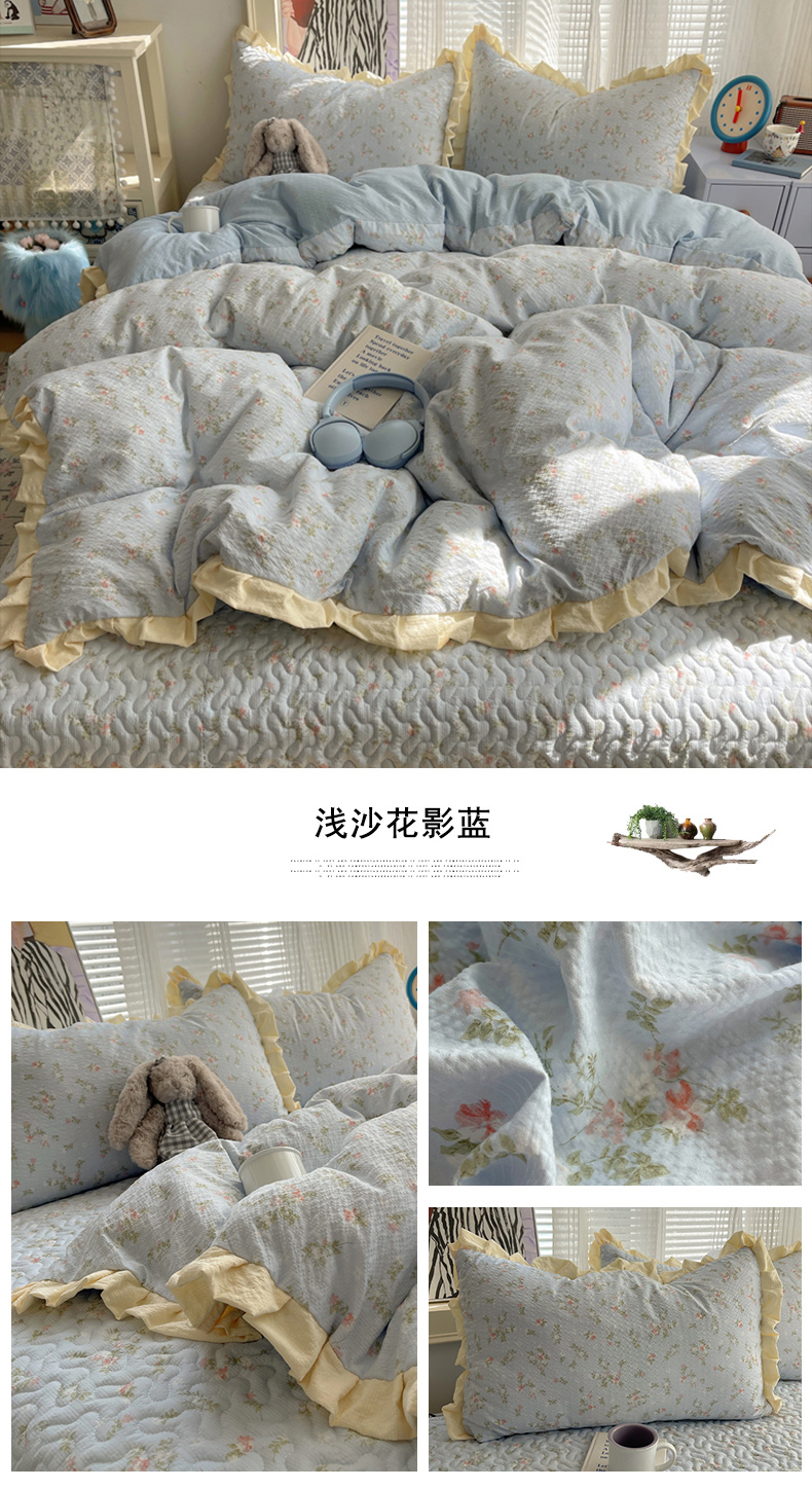 商品名称:迪梦姿家纺 2026新款高克重泡芙纱泡泡纱床盖款四件套系列 木马小花团