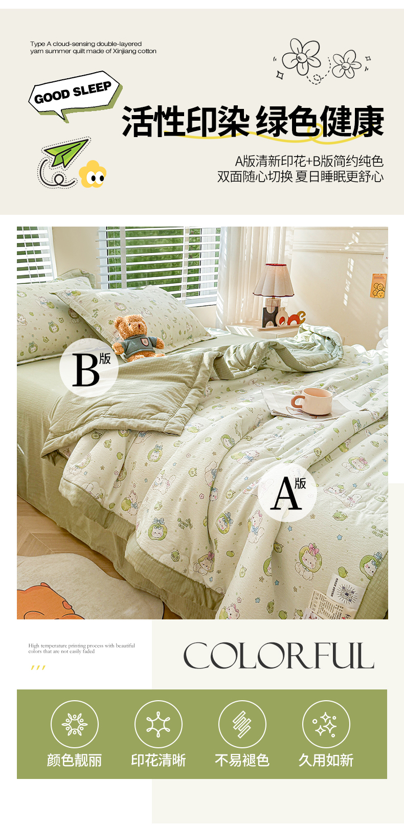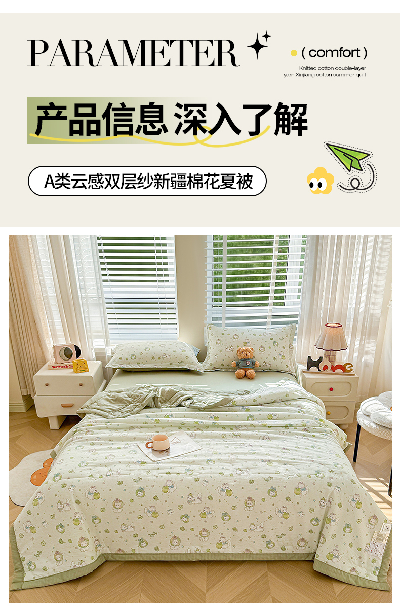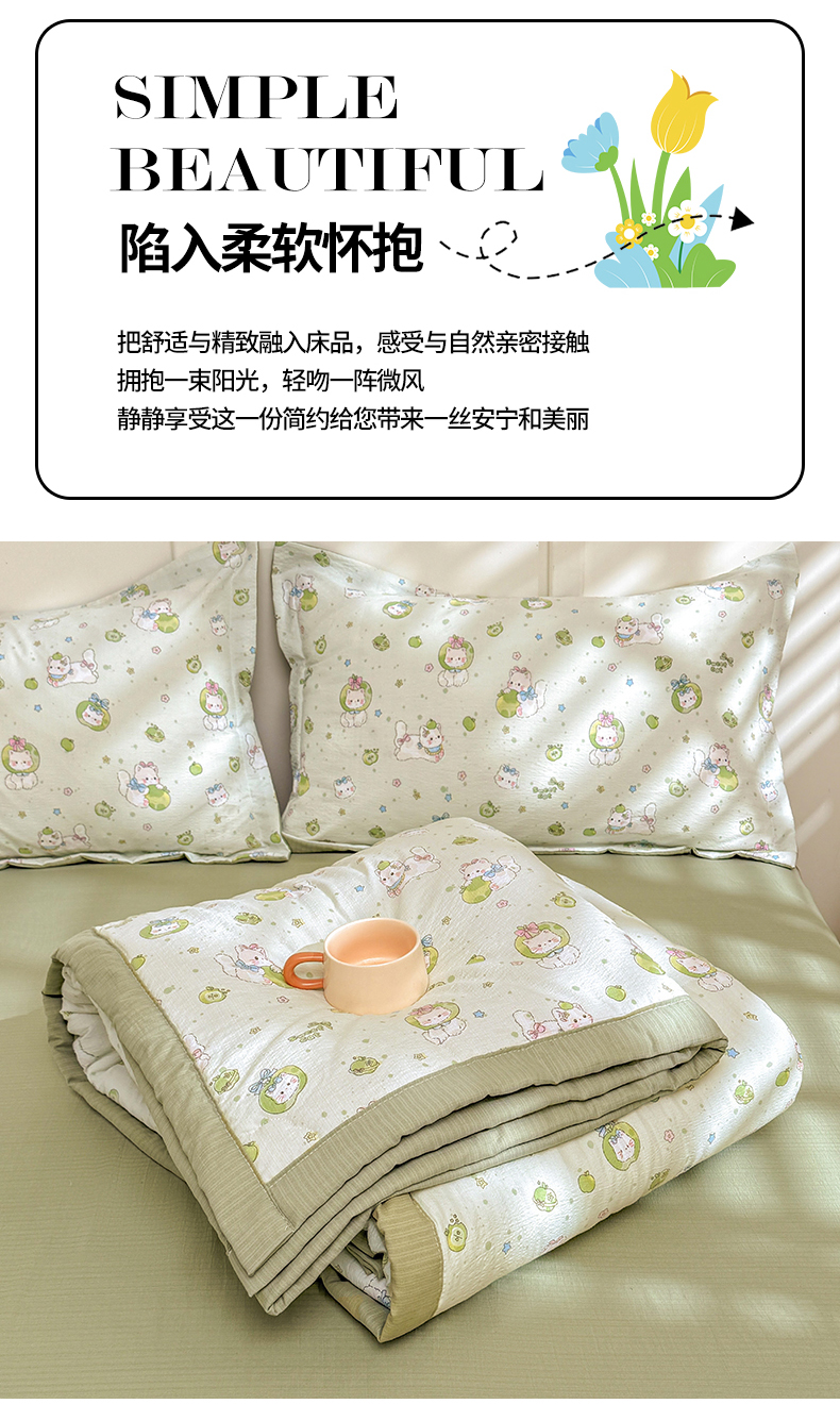 商品名称:2026新款A类新疆棉花夏凉被加宽包边水洗棉卡通印花吸湿透气棉花夏被空调被 云感青苹果