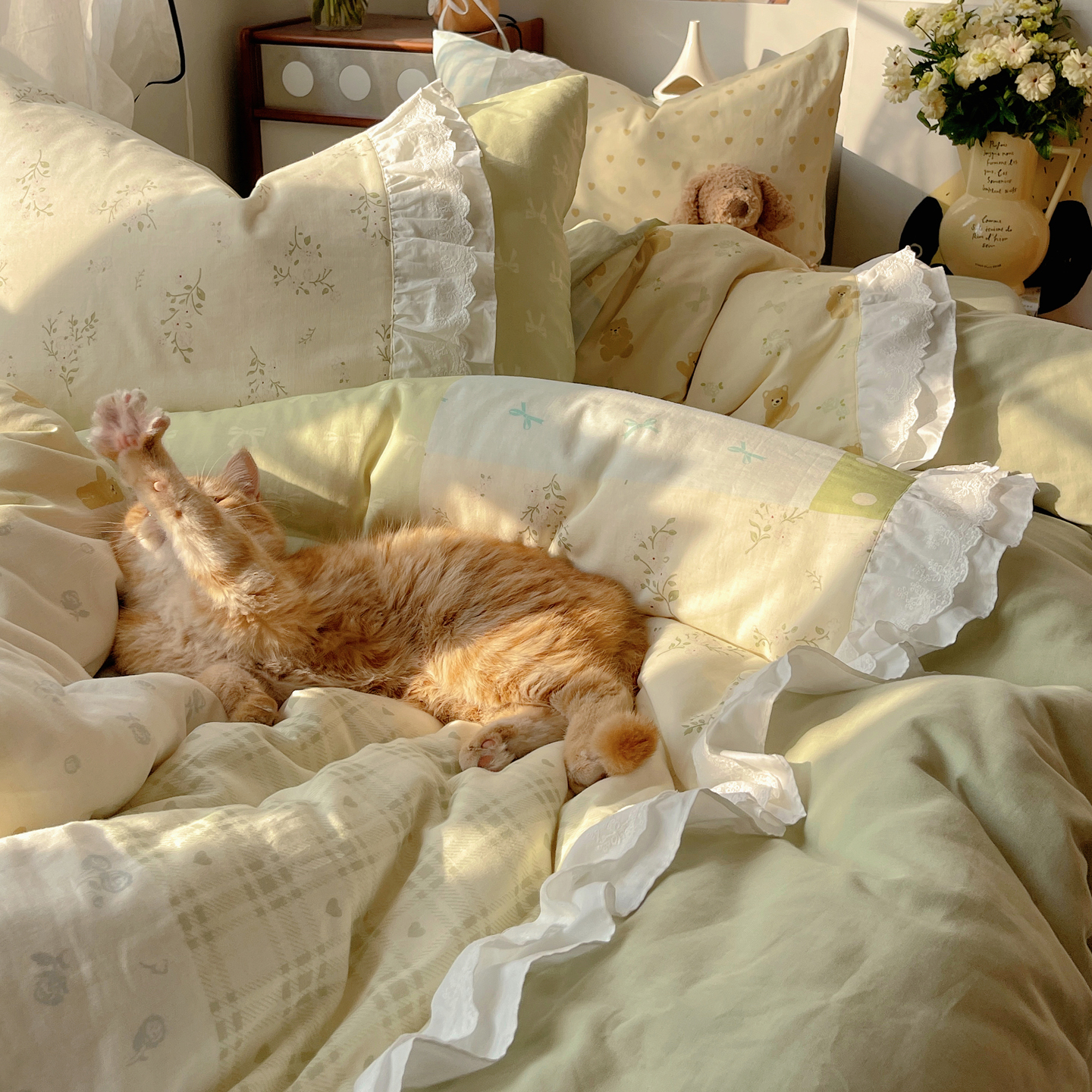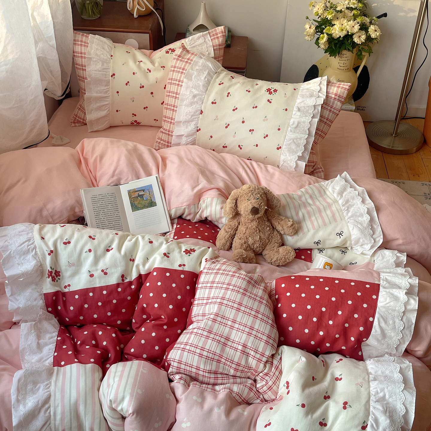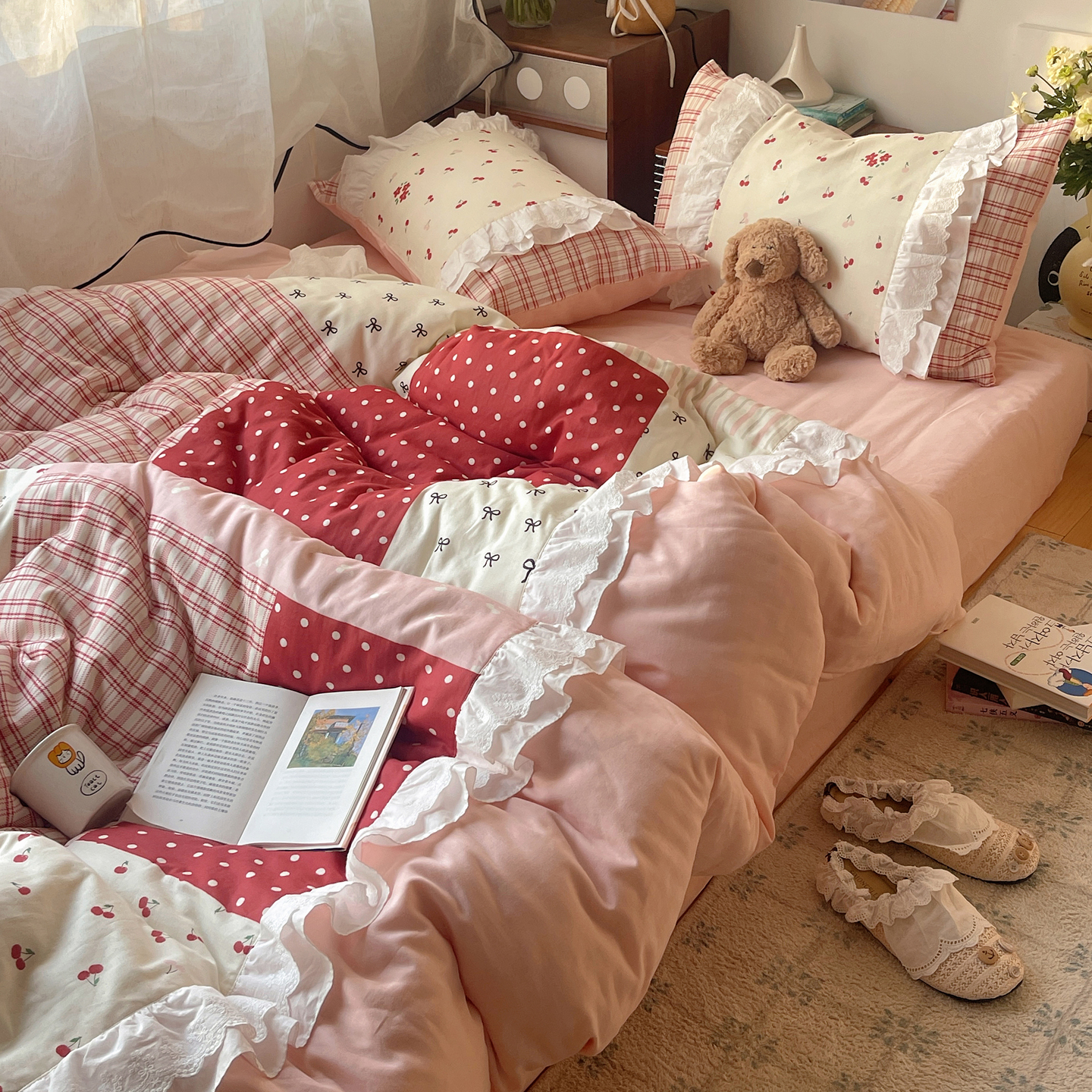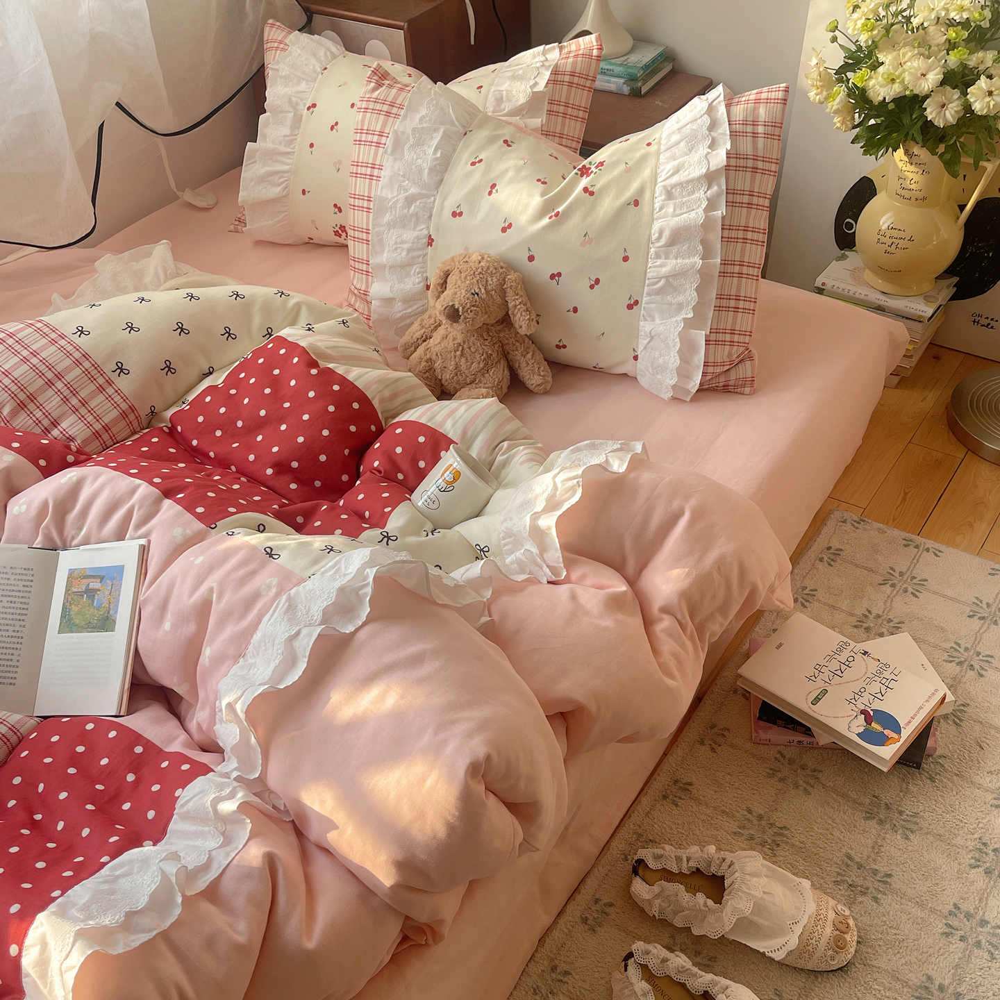 当前位置: 91家纺网 > 商品网购 > 床品套件 > 四件套 > 全棉普通四件套 > 觅糖家纺 2026新款全棉纯棉双层纱梦幻花边系列四件套(会员-5) 米塌熊