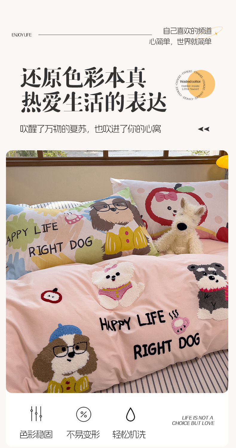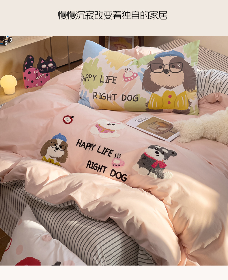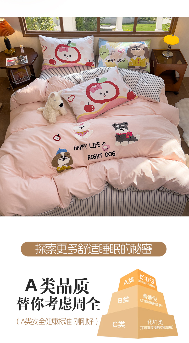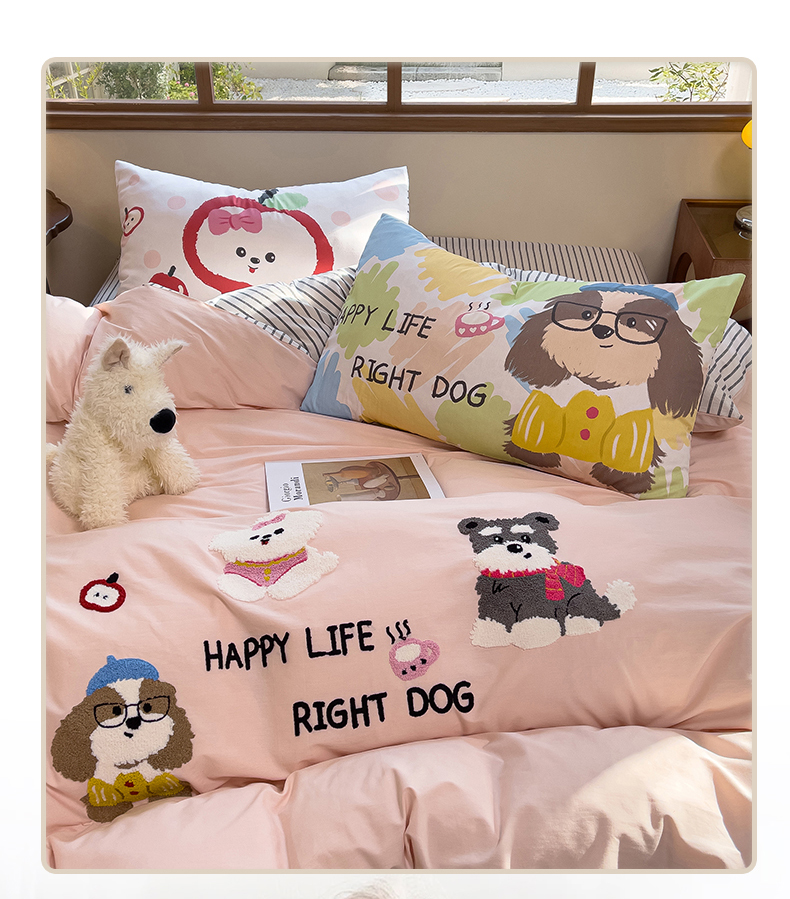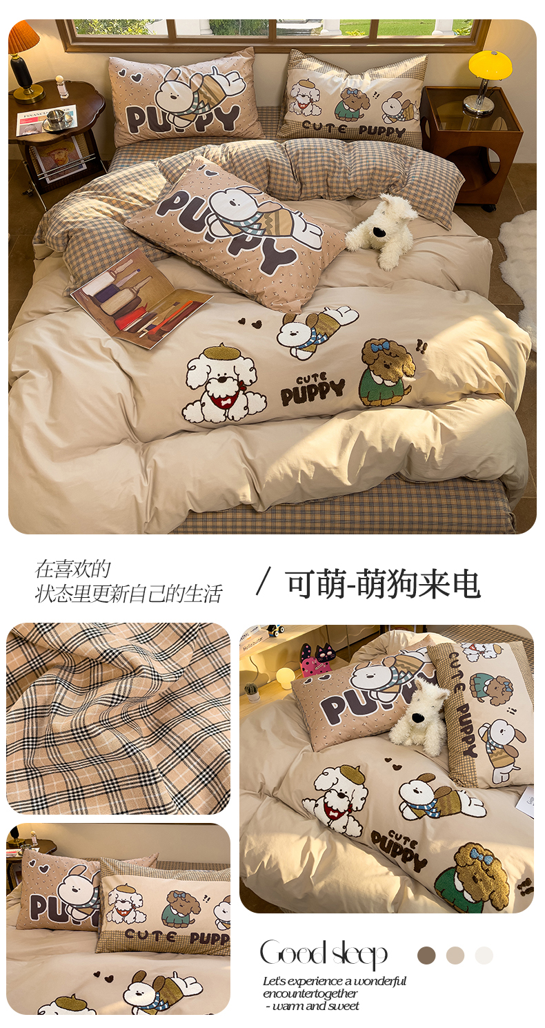 (总)炫拼家纺 2026春夏新款A类全棉纯棉40支水洗棉卡通贴布绣刺绣纯棉四件套-卡哇系列,卡哇一爵士,卡哇一可可,卡哇一甜心,卡哇一汪星,卡哇一悠咪