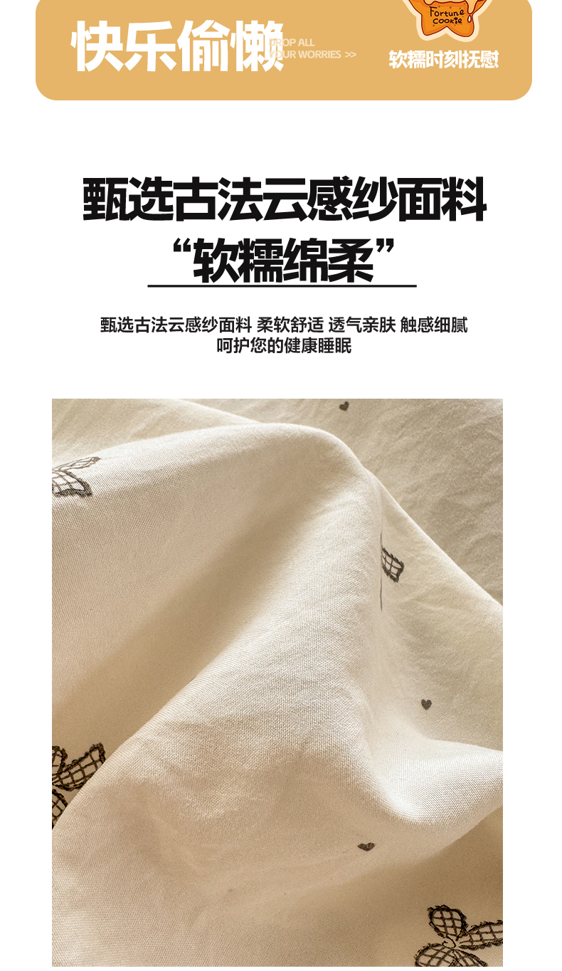 (总)一比一家纺 2026新款彩色花边木棉皱皱纱四件套,阿吉豆,初心粉,初心蓝,扶摇,赫本,花间女孩,花漫漫,花蜜,阑珊,罗卡,奶芙喵,甜心格格,午后花园,小马驹,邂逅,野餐兔,樱花季,悠然,紫烟