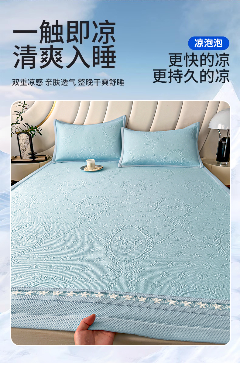 商品名称:梦卡迪 2026新款A类提花凉感冰凉豆豆凉席镂空花边床笠床单可机洗双人软席子三件套 冰蓝色-床笠