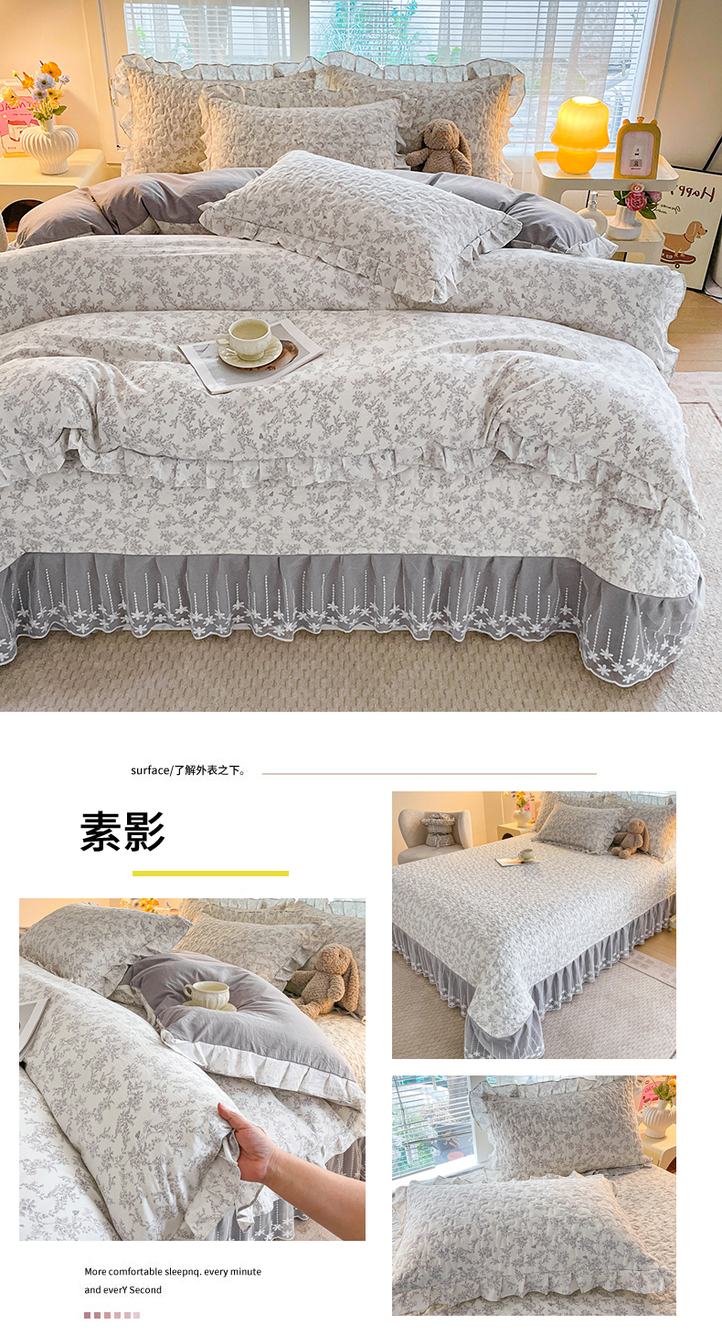 当前位置: 91家纺网 > 商品网购 > 床品套件 > 四件套 > 其它四件套 > 艺慕家纺 2026新款直播热款古法仿棉水洗棉印花双层蕾丝花边床盖四件套 素影