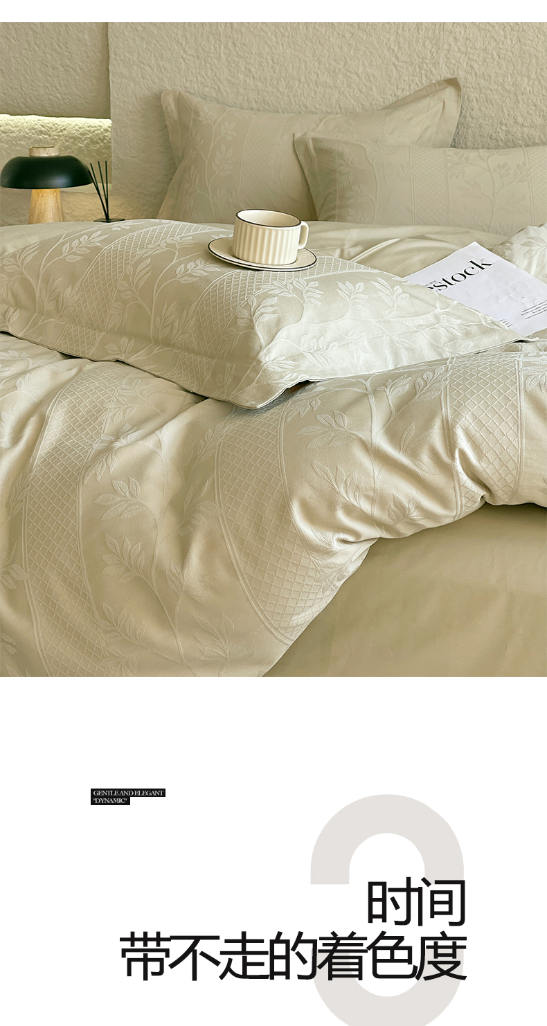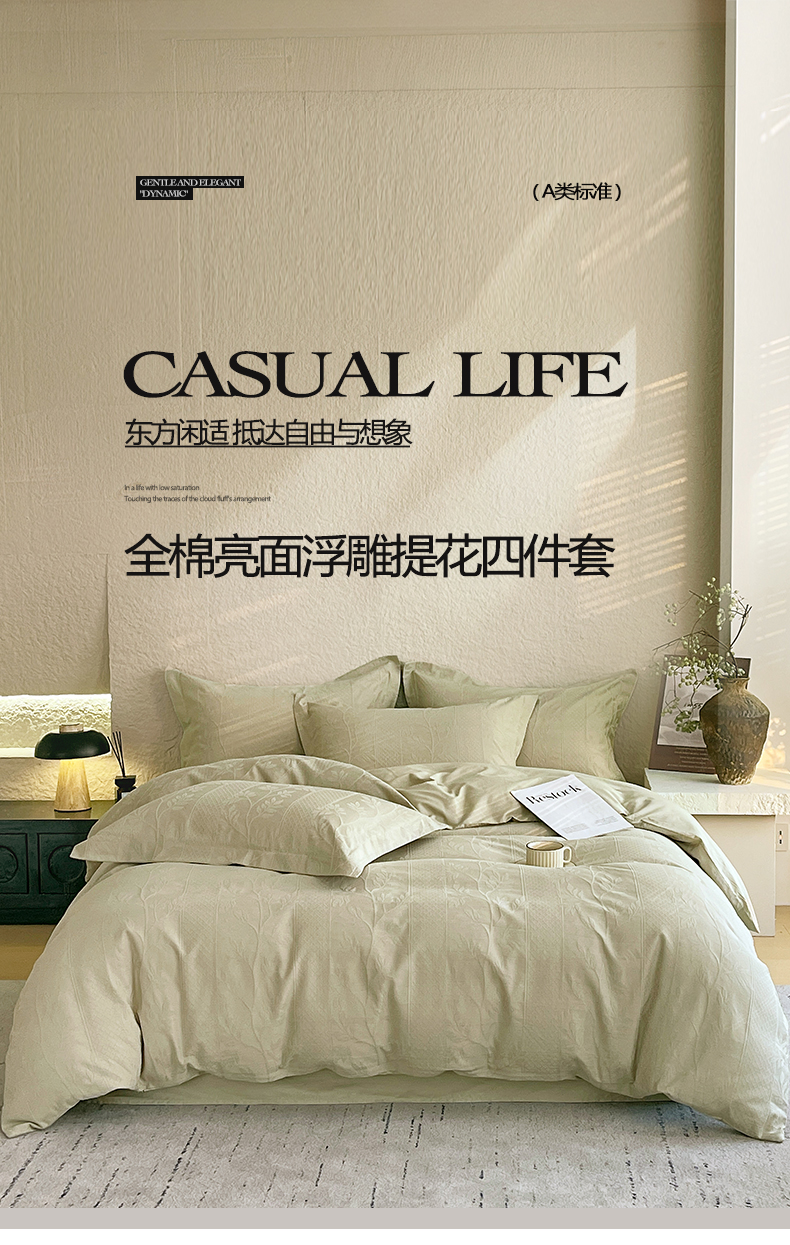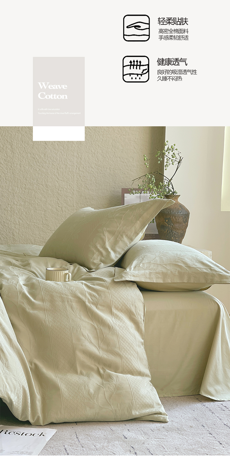 宜家坊 2026新款A类全棉纯棉亮面浮雕提花四件套 芊芊叶语-奶绿
