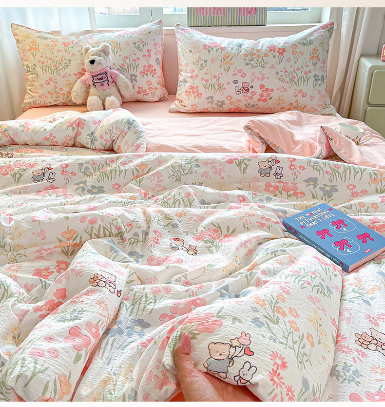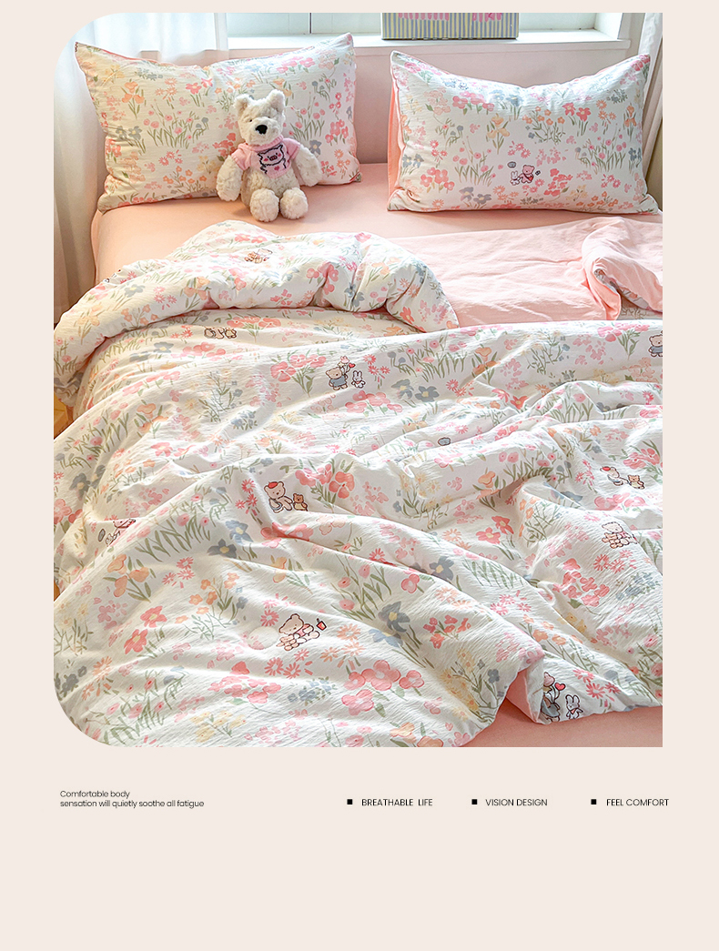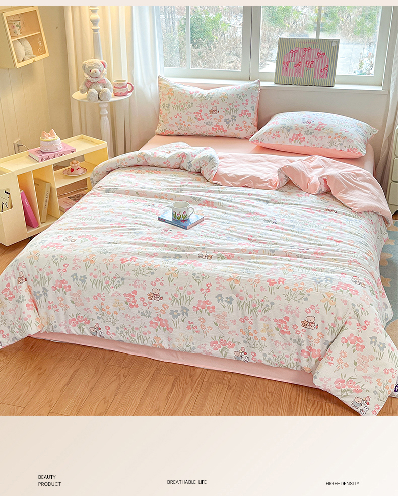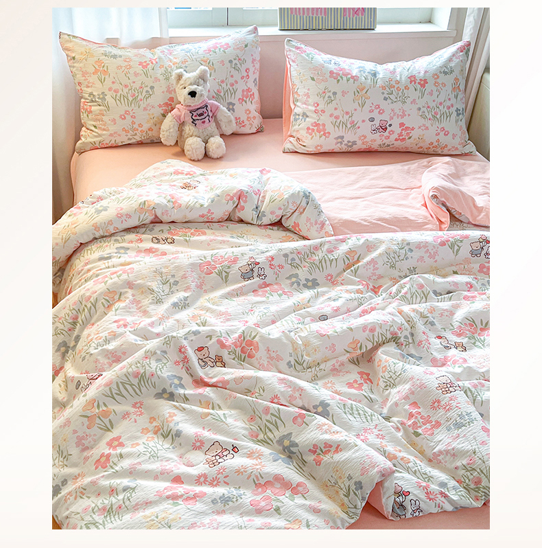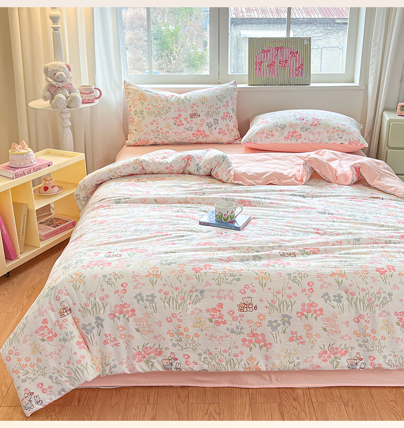 盛秋家纺 2026新款皱皱纱印花夏被-萝拉 花丛小熊+奶油粉