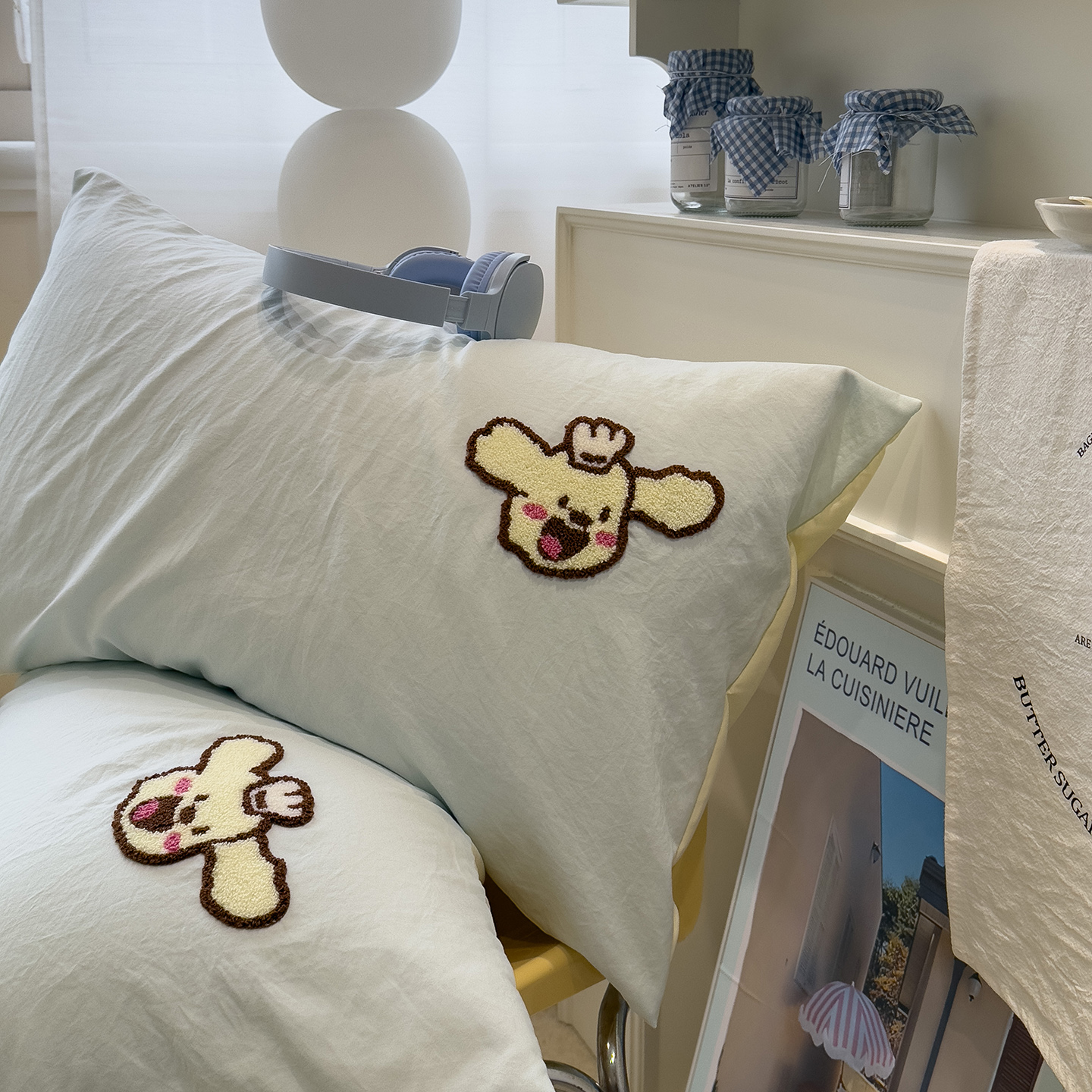 曼谷 新款毛巾绣四件套ins煤球图案柔软磨毛水洗棉套件 煤球-芝士绿,煤球-芝士绿