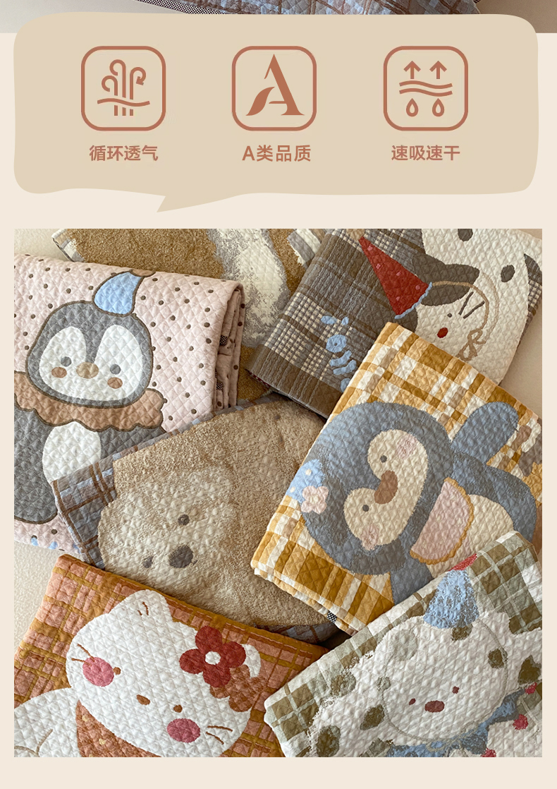(总)麻依 2026新款软萌纱布床盖三件套系列,斑点小猫,博美,豆豆企鹅,懒床小狗,乐园小象,毛绒小狗,胖胖猫,胖胖企鹅,桃心KT,玩耍小咪,香蕉小猫,杂技萌宠,组合