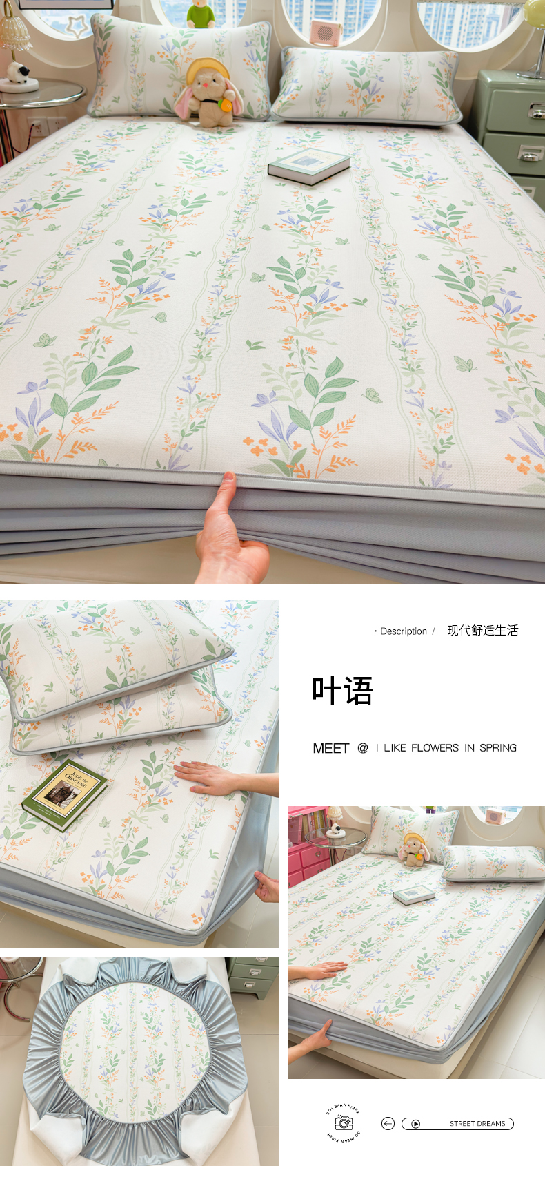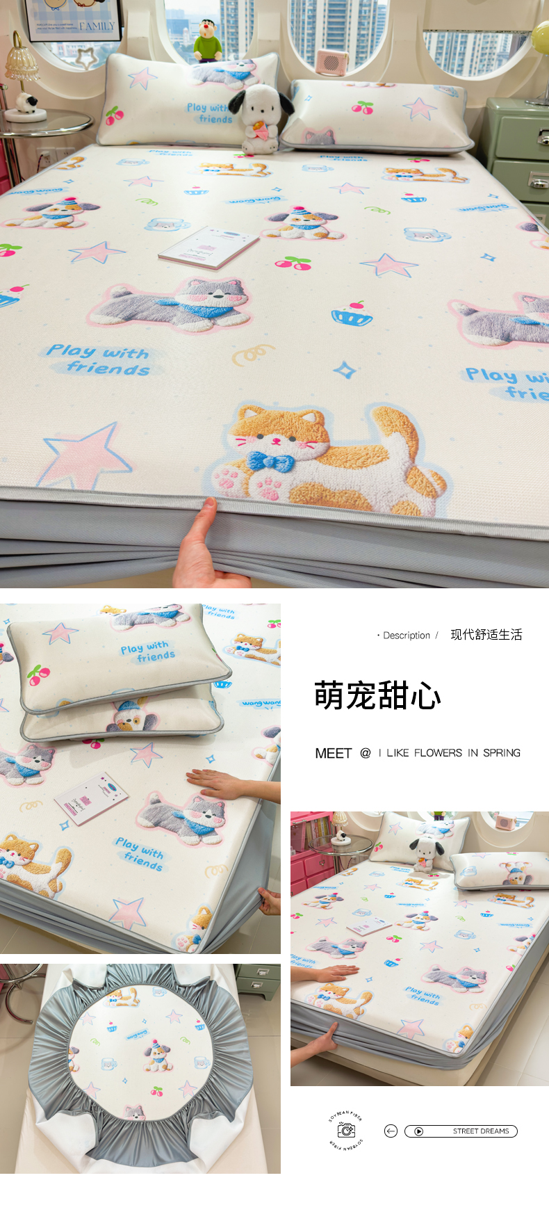 (总)丝羽坊 2026新款高密凉感丝印花乳胶凉席-床笠款,雾蓝花影,萌宠拼格,粉黛萌兔,格纹蝶影,奶白萌犬,浅蓝熊趣,糖果猫咪,彩糖点点,林间私语,薄荷甜心,爱的圈圈,春意盎然,奶绿汪仔,小白兔,小企鹅,小兔派对,星月