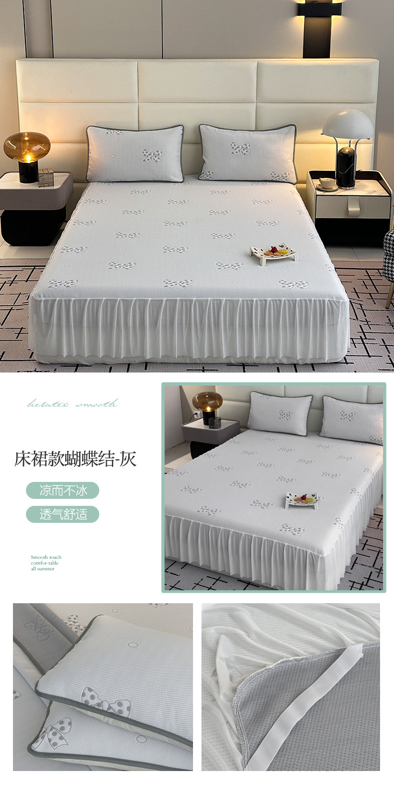 七里香 2026春夏新款2026新款华夫格3D千鸟格冰豆豆凉席床裙款三件套 华夫格-浅灰,华夫格-浅灰